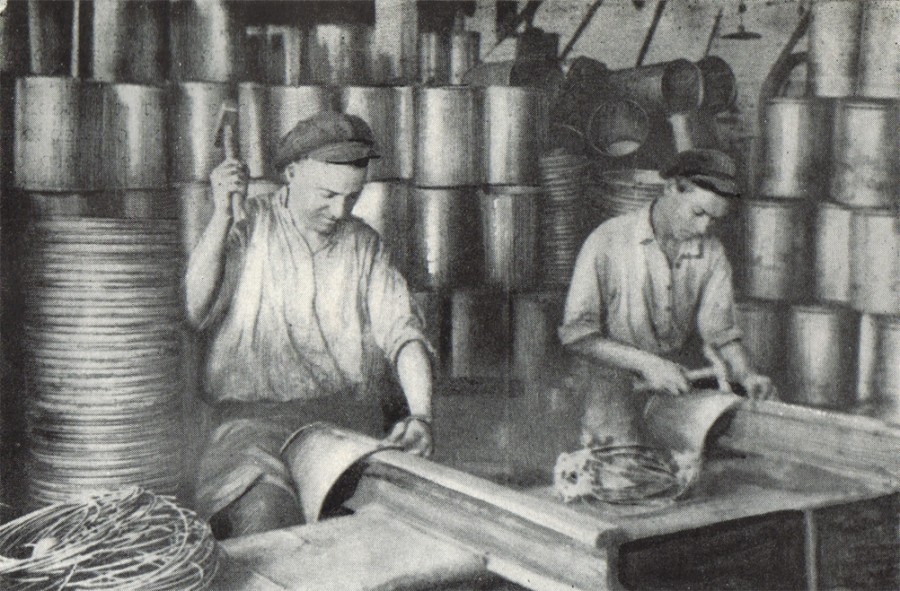 Технология цинкования и сейчас не полезная, в те времена была убийственно вредной. Готовое ведро вручную клещами сначала окунали в котел с кипящей кислотой, а потом в печь с расплавленным цинком.
