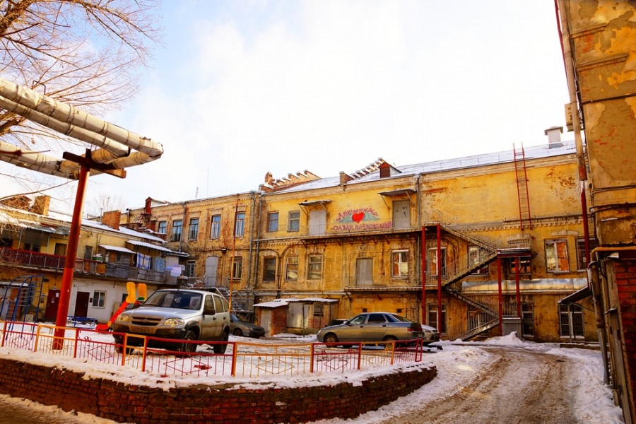 Великолепен двор. Сохранилась аура промышленной культуры начала прошлого века. Наружные лестницы и галереи, козырьки над дверями. Похоже, фасад с этой стороны сохранился полностью.