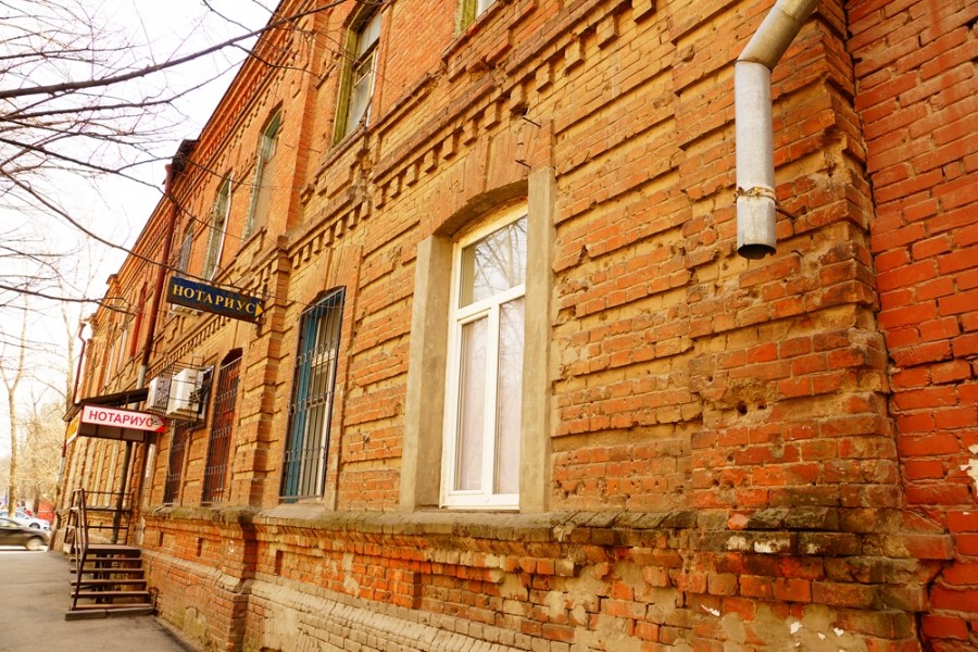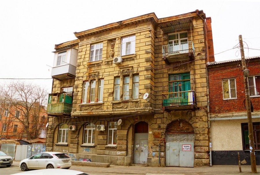 Дом по переулку Рыбному в Ростове с характерными следами войны ниже таблички возле окна: