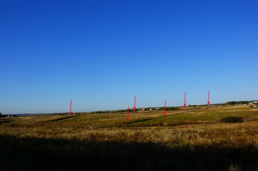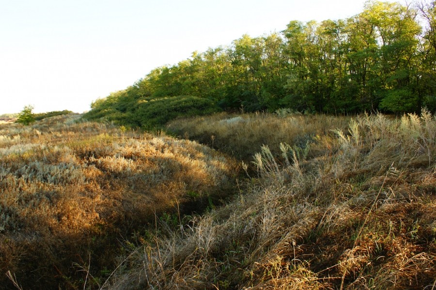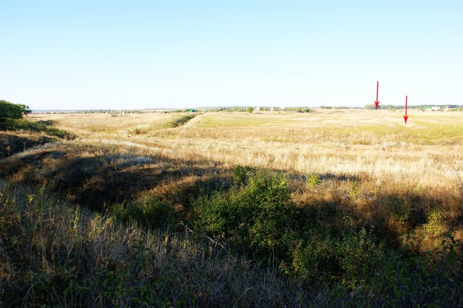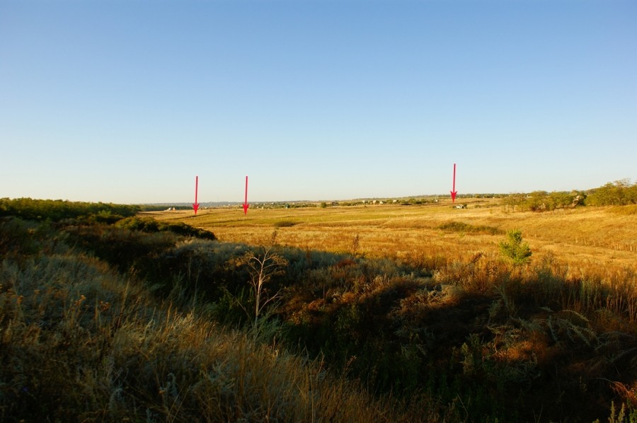 А на этом фото видны обе линии рвов на правом берегу Темерника. Темная тень внизу: это ров, проходящий с севера на юг. Этот район очень трудно охватить объективом, широкий простор и теряющиеся в траве рвы. Старался фотографировать при низком солнце, чтобы ярче проступили их контуры.