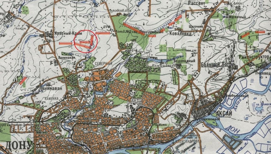 Рассказ о всех сохранившихся оборонительных сооружениях в районе Ростова-на-Дону не поместится в короткую интернет-статью. Я расскажу вам только о месте, где на одной из главных дорог, ведущих в Ростов, во время войны было построено оборонительное сооружение, от которого осталась двойная линия противотанковых рвов. Нигде в районе нашего города не сохранилось больше двойной линии рвов. И нигде не сохранилось такого участка рвов, дающего представление о системе обороны целого района, как в этом месте. На предыдущей карте я обвел это место кругом.