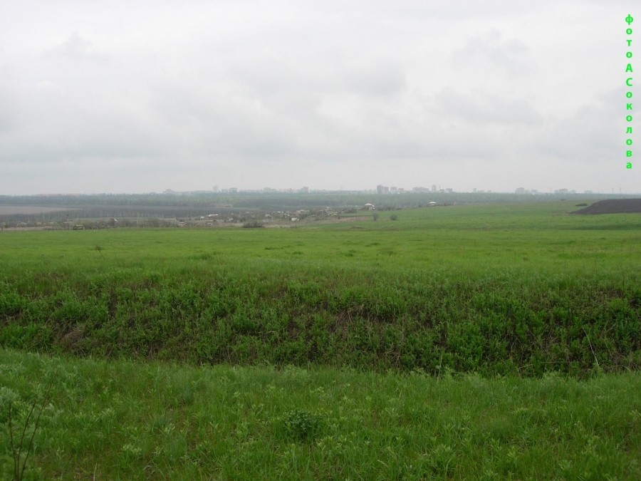 А это кварталы Ростова, а точнее ул. Орбитальной. На переднем плане один из правобережных рвов, поросший молодой зеленой травой.