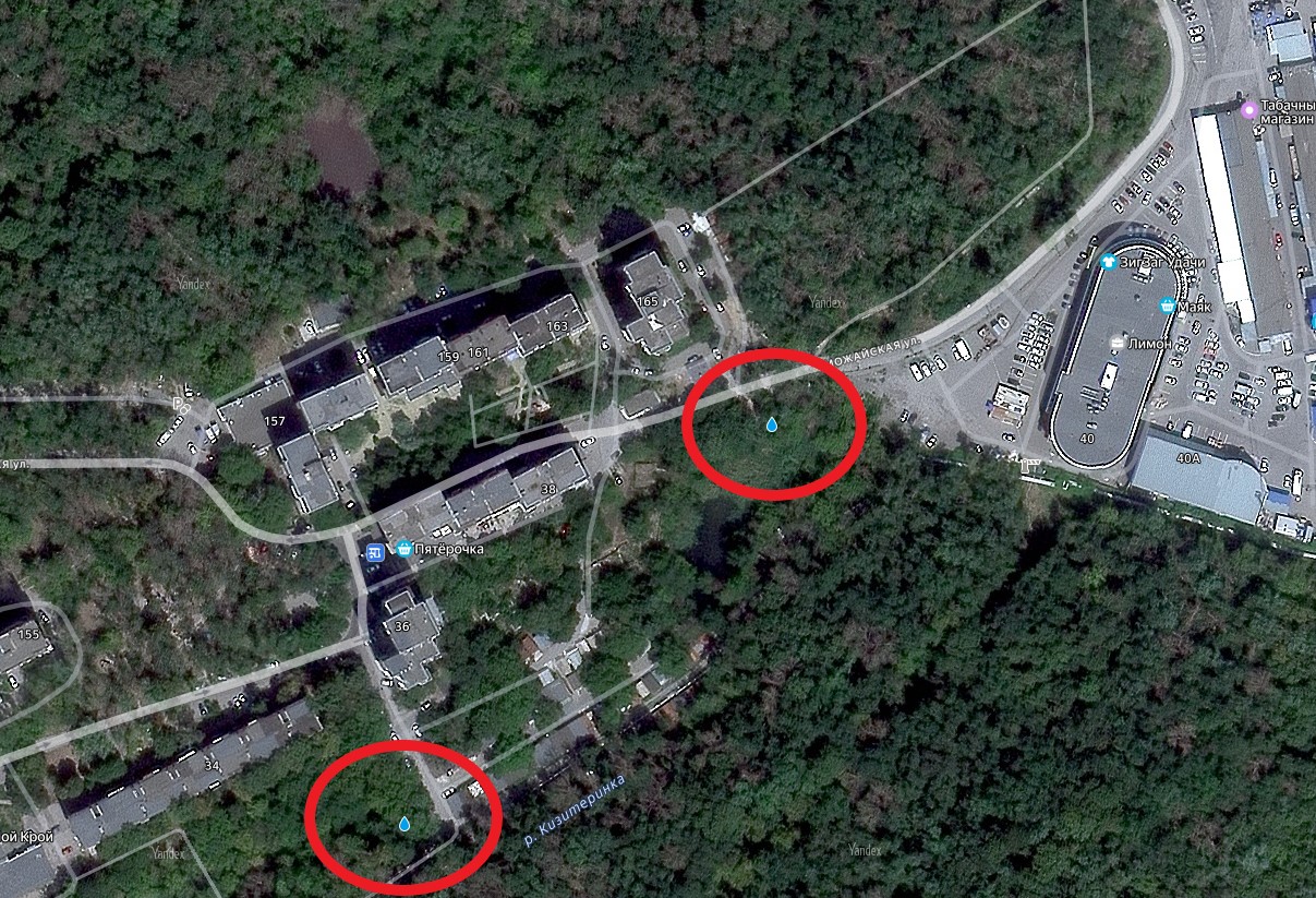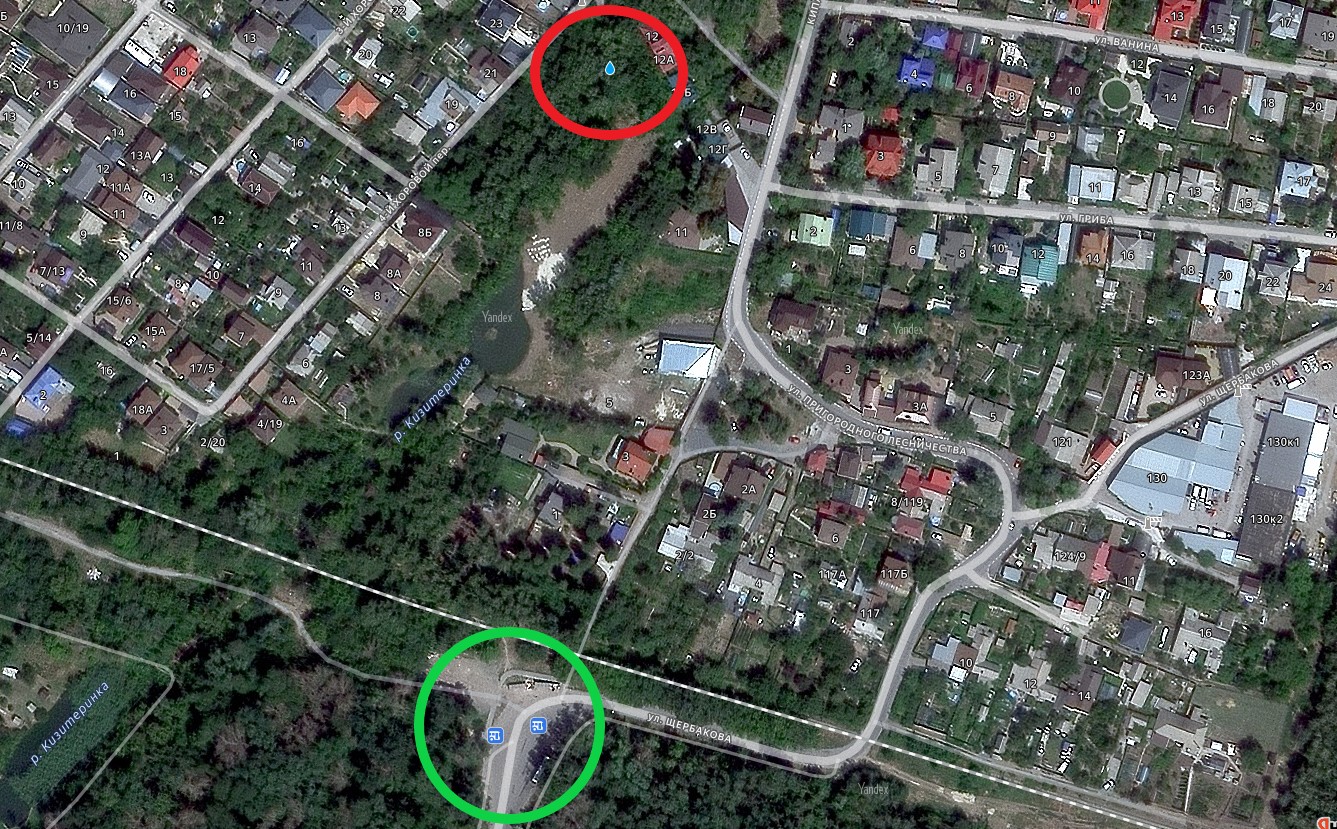 Если бы я захотел посетить истоки Кизитеринки, я бы приехал к ТЦ "Лимон" на ул. Можайской, и от него дошел бы до родника. Вероятно там легко пройти. Возможно пройти от жилых домов на Можайской.А ко второму истоку надо идти от конечной остановки автобуса 3, обведено зелёным. Не факт, что там легко пройти. Возможно проход придется искать.