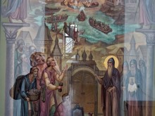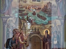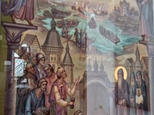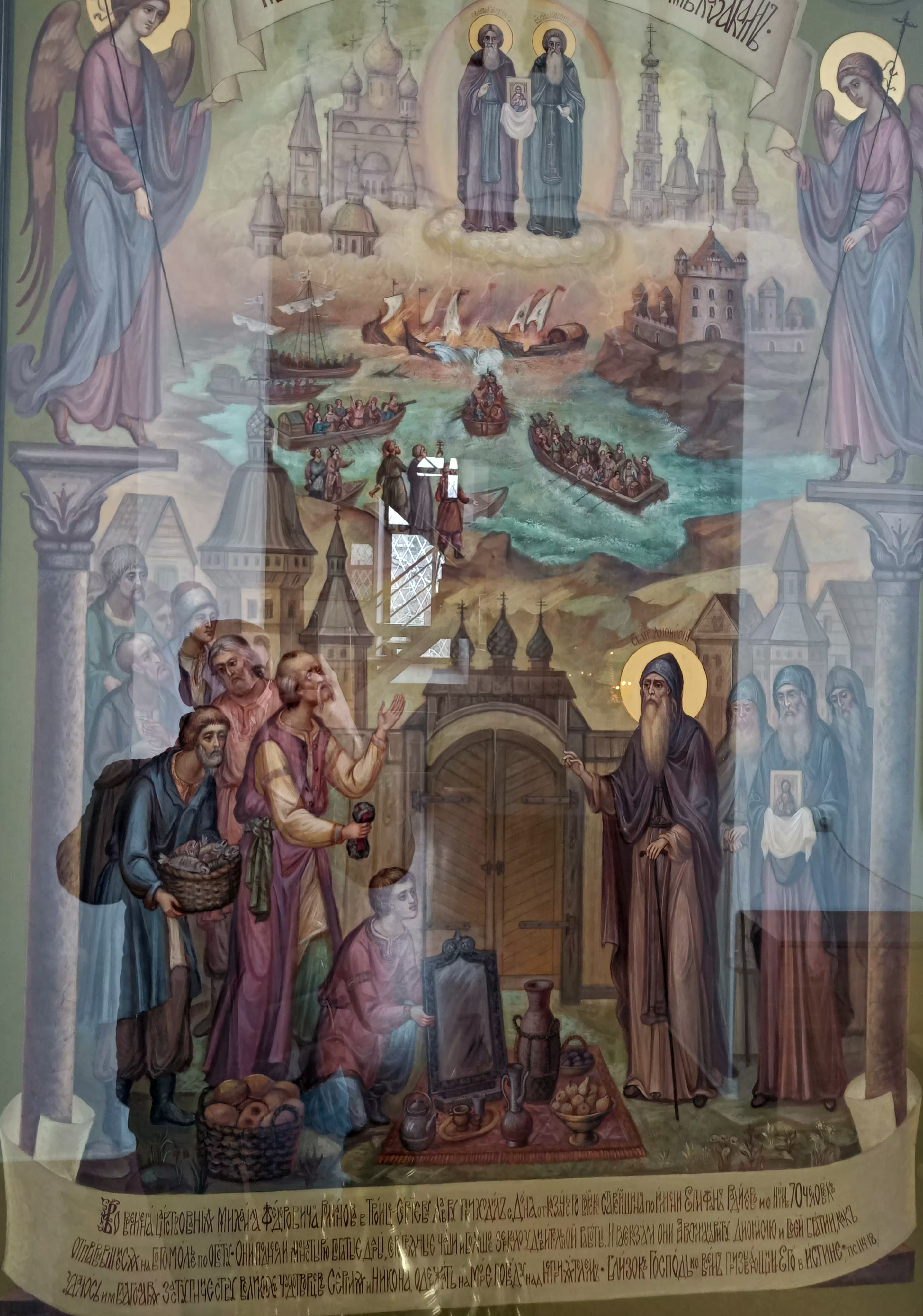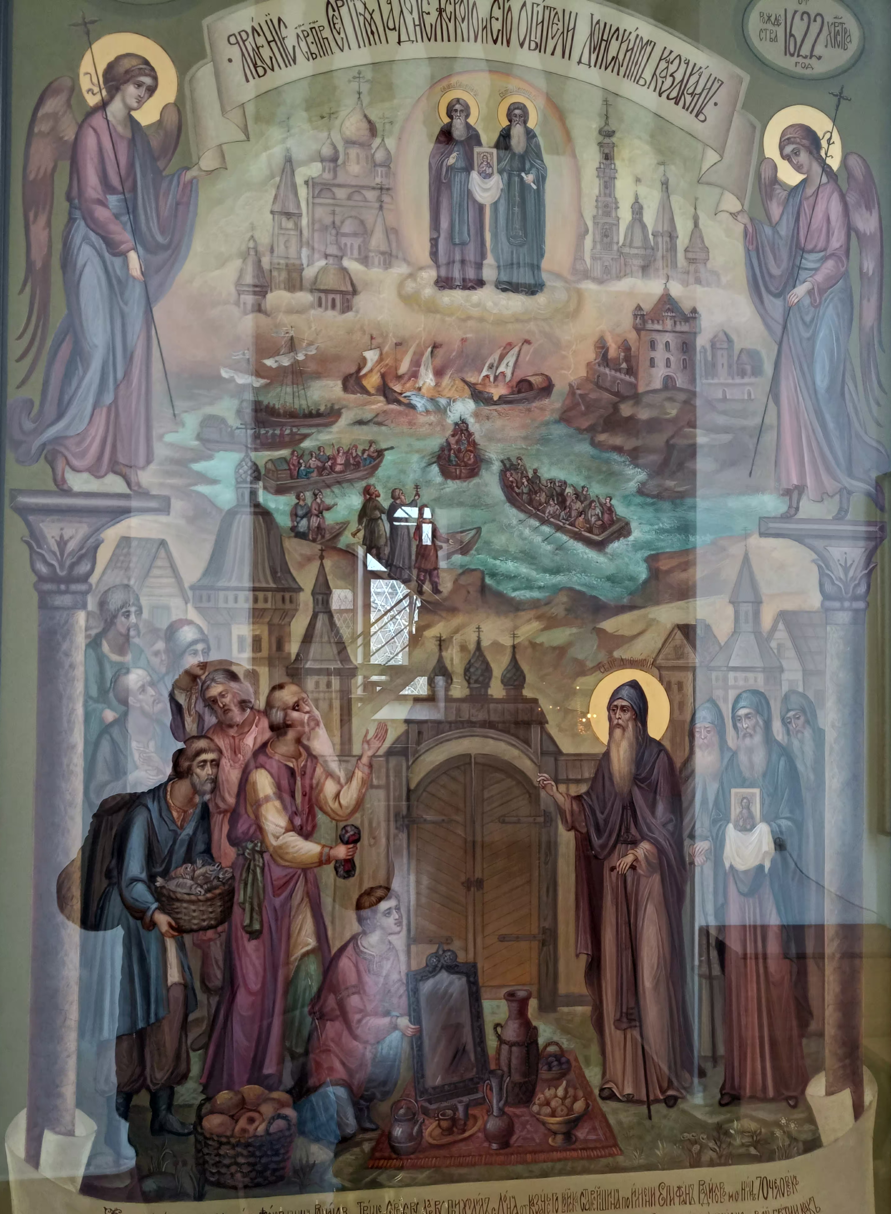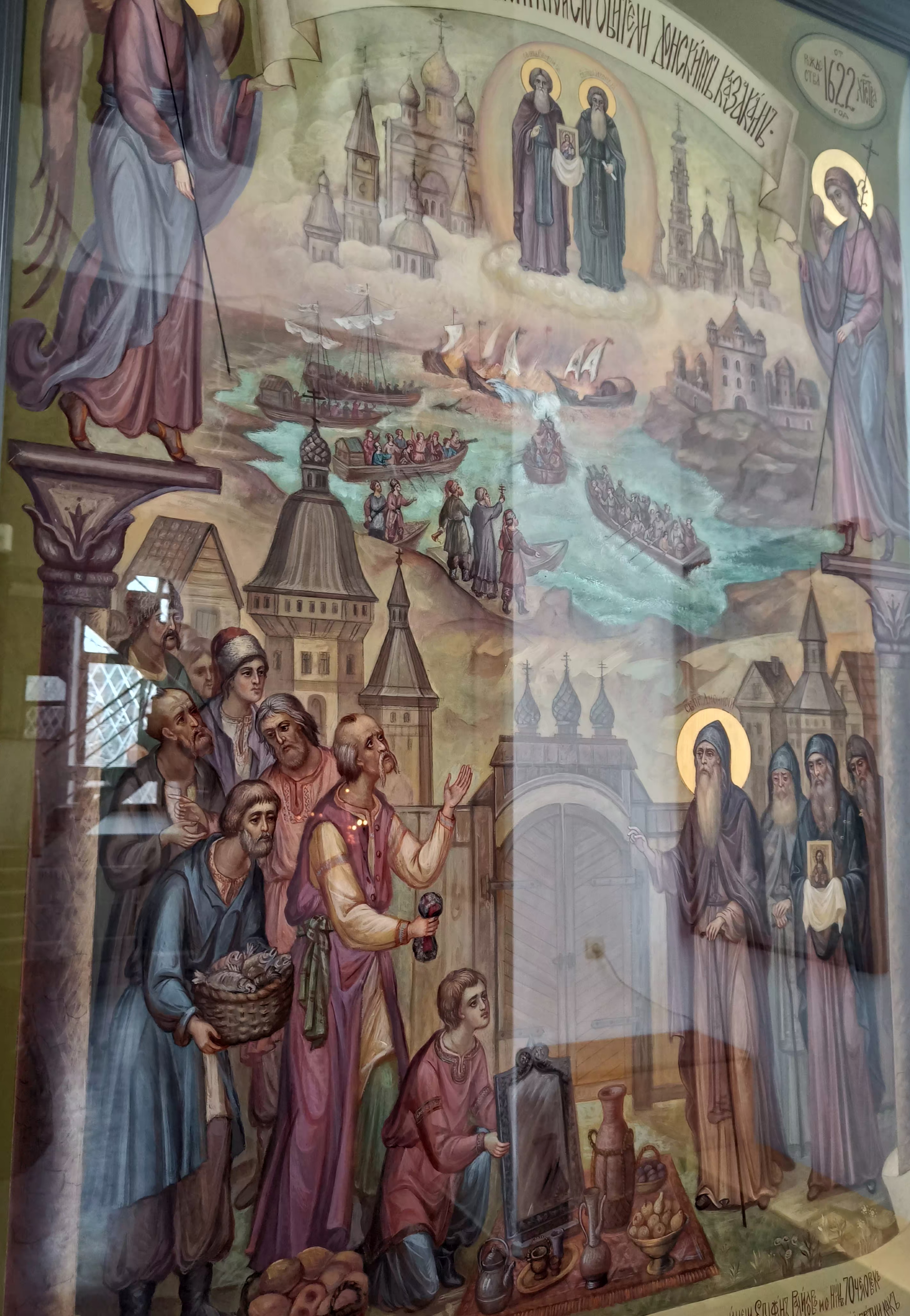 Изображен довольно успешный совместный морской поход Донских и Запорожских казаков на Царьград(Стамбул). В верхней части изображена сцена морского сражения , горящие турецкие галеры и казаки на стругах/чайках,как их представлял художник. В нижней части - благодарственные дары монастырю за заступничество Святых (добыча в походе).Освещение очень неудачное там и многочисленные блики мешали сфотографировать одним ракурсом все.