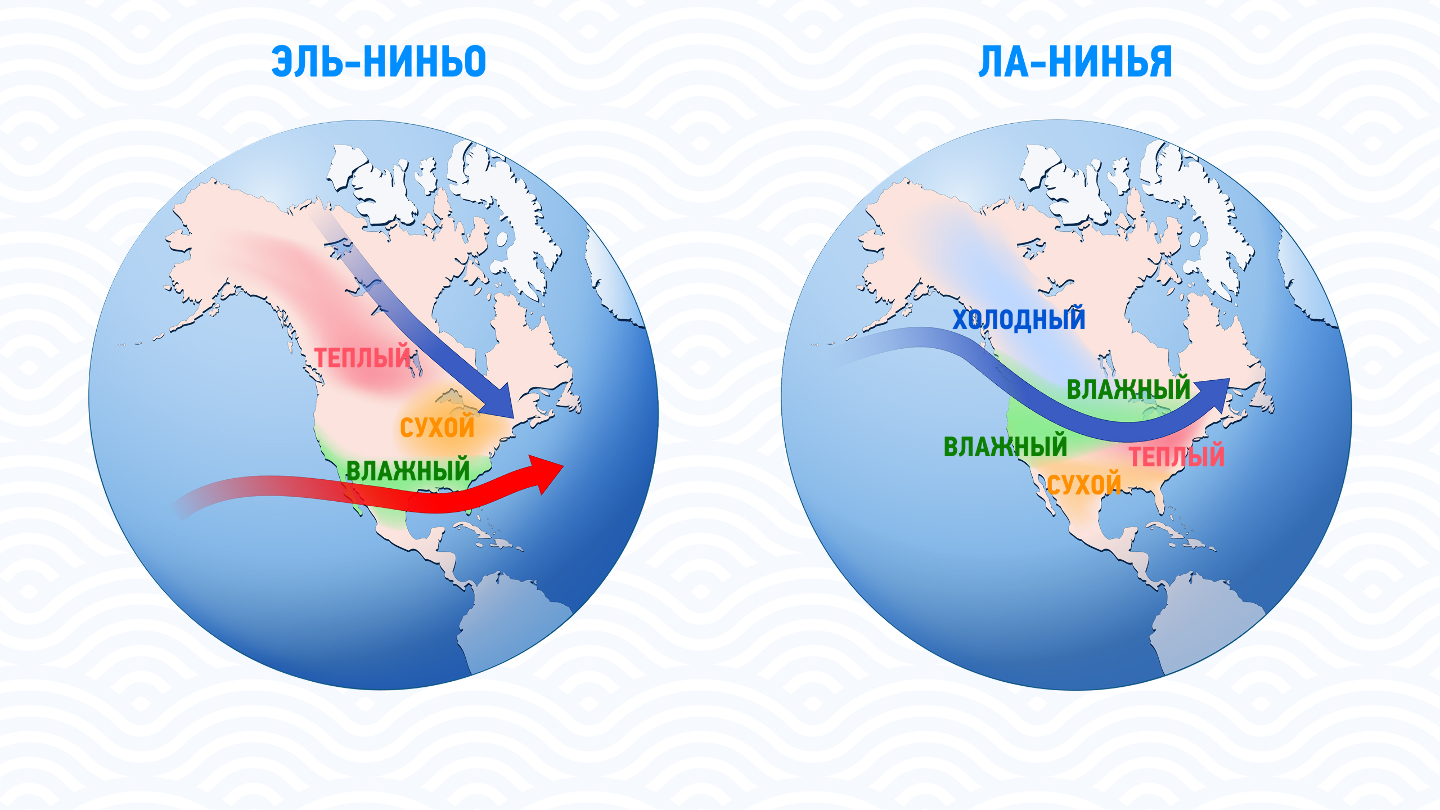 В этом году усилилось влияние Ла-Ниньо, поверхностные воды океана стали холоднее, перенос тёплых масс из Атлантики ослабел, поэтому, в частности, такая погода у нас - Арктическому воздуху легче пробиться к югу. Кроме Эль-Ниньо и Ла-Ниньо на погоду в Европе оказывает положение и мощность Азорского антициклона, который существует постоянно. Обычное его место дислокации - Азорские острова, откуда он и получил своё название. Он него во многом зависят летние засухи у нас.