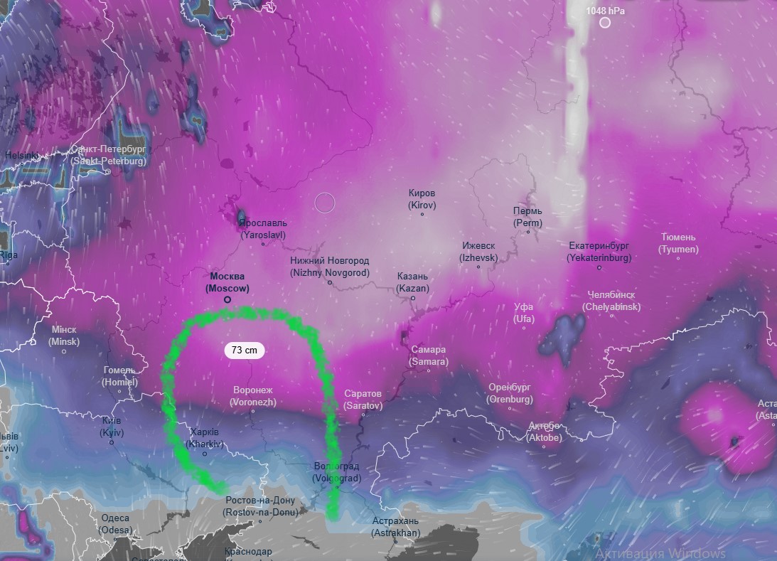 На этой карте показана толщина снежного покрова в России. На Северном Урале она достигает 270 см. А в верховьях нашей замечательной реки, снега выше семидесяти сантиметров. Бассейн Дона с притоками я очень примерно обозначил зелёной полосой. Стоит приготовиться к паводку. Если ваша океанская яхта на даче привязана тонкой верёвкой, стоит привязать её покрепче. Только не перегоняйте её куда-то в тёплые края. Там Бог весть что творится.
