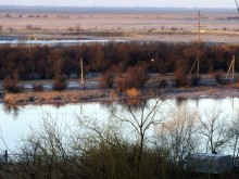 Дует крепкий тёплый суховей с юго-востока. Ещё три дня назад штормовой ветер дул в противоположную сторону, был сильный нагон воды. И сейчас можно наблюдать такую контрастную картину: на правобережье ветер иссушил всё и гоняет пыль, а перейдёшь через мост - картина иная. Лужи с поющими лягушками, и во многих местах без сапог не пройти, чтобы не промочить обувь.