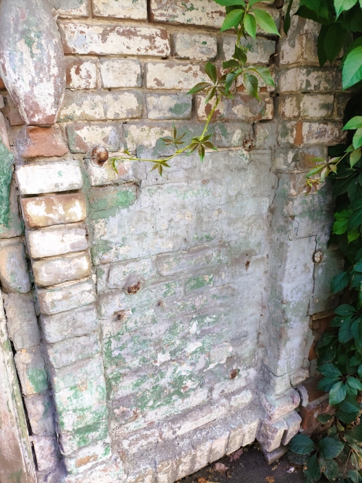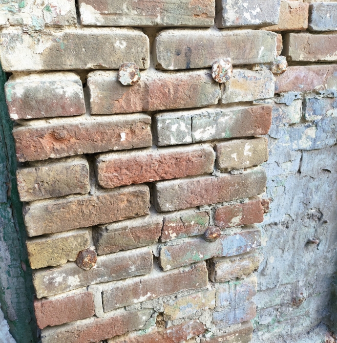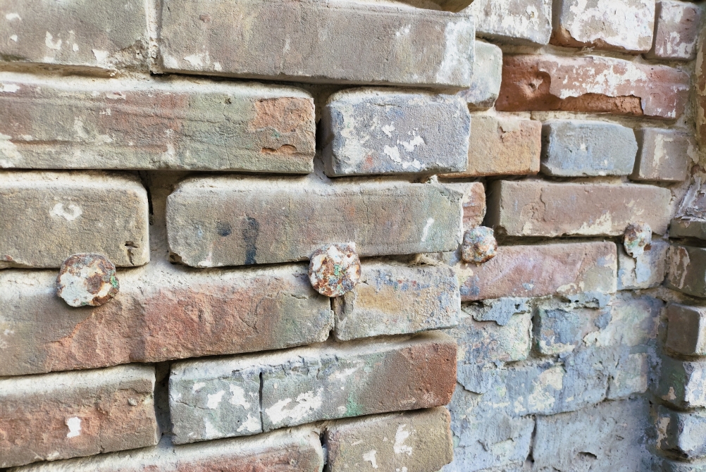 Но главное, гвозди. На этом снимке видно восемь. А всего в небольшой по размерам фасад их забито 24. И вероятно, под слоем штукатурки я не все заметил. Видимых причин присутствия этих гвоздей, нет.