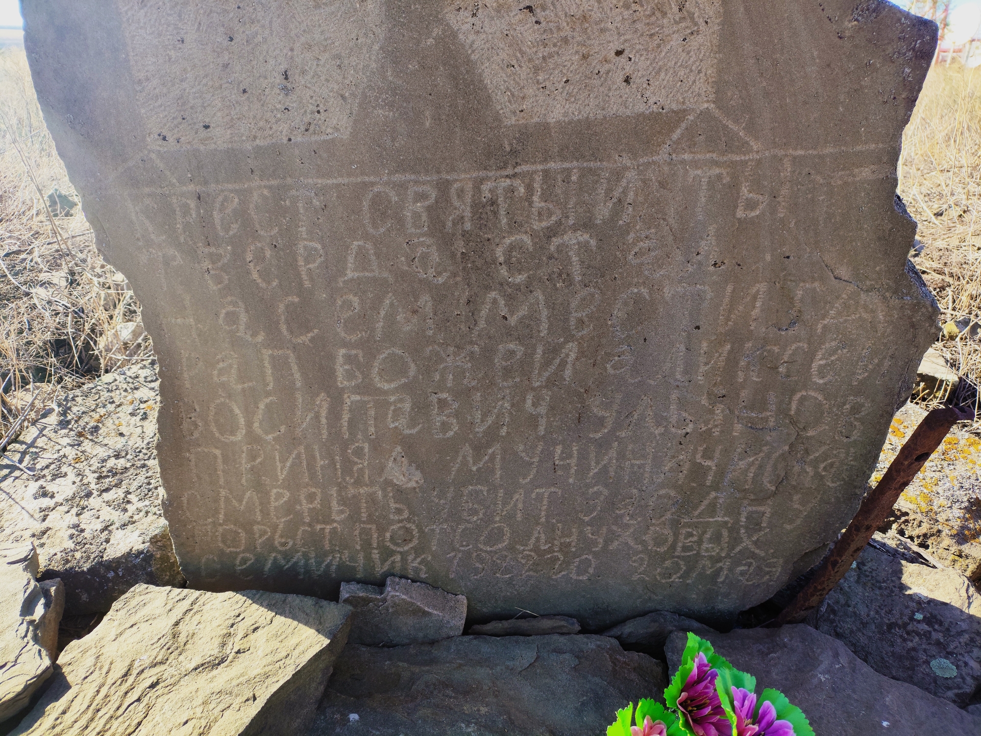 Надпись на памятнике сделана явно без помощи образованного хуторского начальства. Неровные буквы сообщают, что 20 мая 1922 г. раб Божий Алексей Осипович Ульянов принял на этом месте мученическую смерть за одну горсть подсолнуховых семечек.