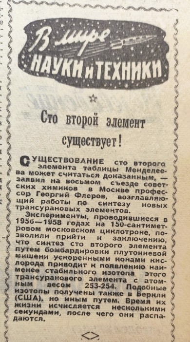 В юности попалась мне в библиотеке небольшая книжка в мягкой обложке - "Взятие 104-го". Автор - Валерий Аграновский. Взял её среди прочих - почитаю, думаю, детективчик на досуге (название -то как у детективного романа). Был удивлён и немного разочарован, когда понял, что в книге говорилось не об агенте с кодовым позывным "Сто четвёртый", а об очередном элементе таблицы Менделеева. Но разочарование быстро прошло - книга захватила, как настоящий детектив. В процессе "взятия" 104 элемента принимал активное участие и Георгий Флёров.