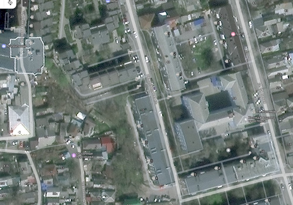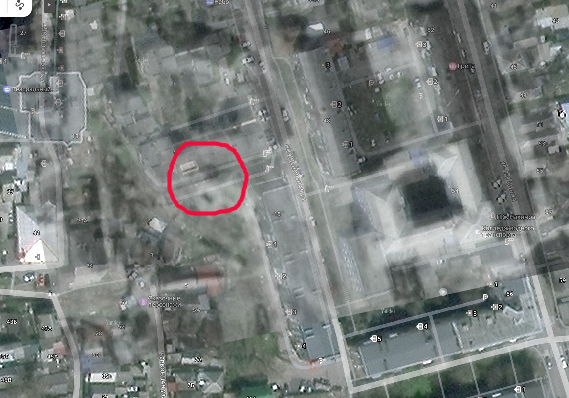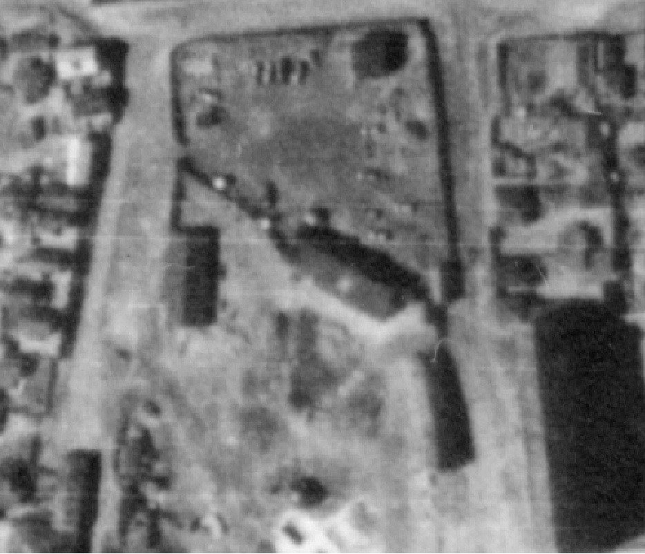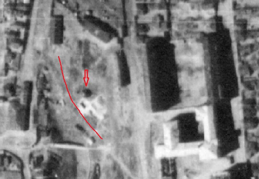 На снимке, между улицами Нижненольная и Искусственная, хорошо видно отдельно стоящее сооружение. Оно округлой формы и судя по тени, достаточно высокое. Можно предположить, что объект имел навершие в форме купола или сферы.