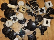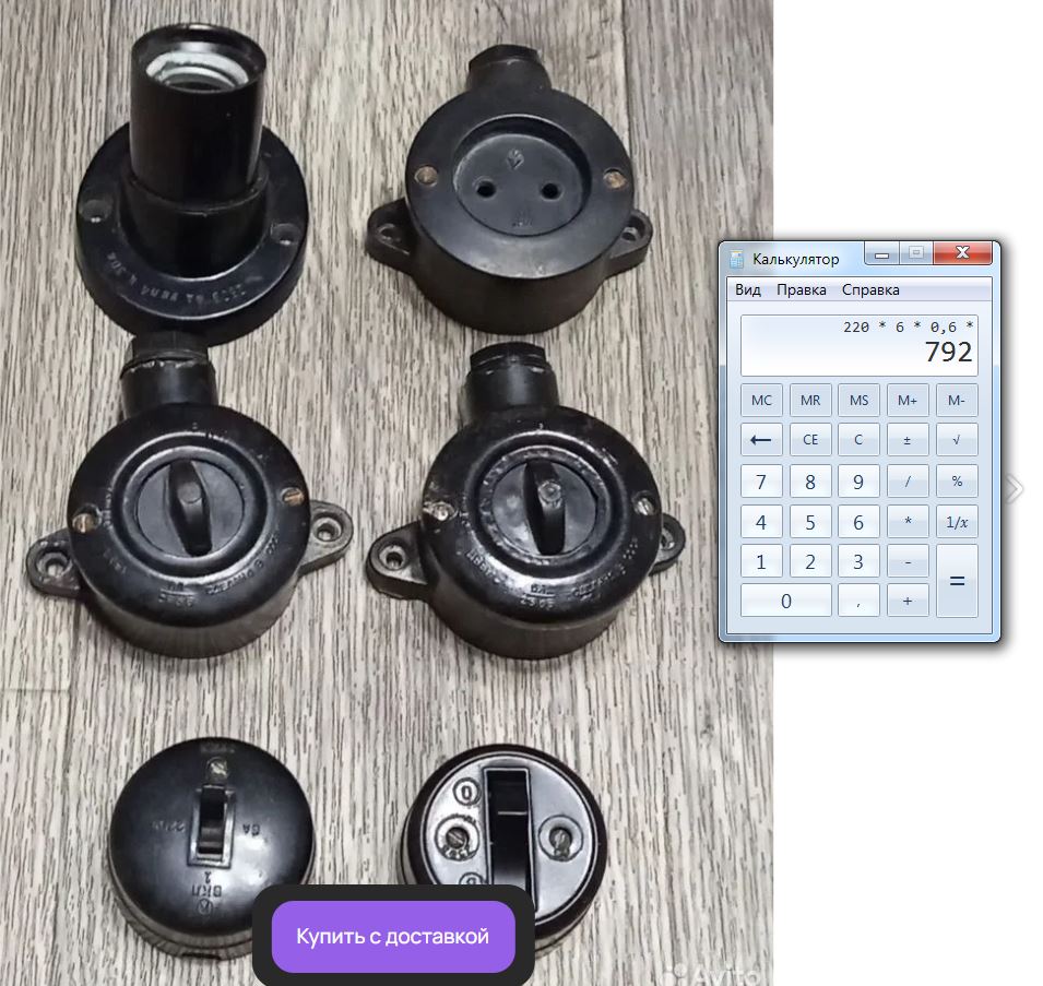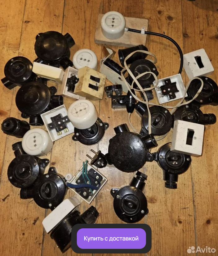 В большом ассортименте, на любой вкус детства, в состоянии от нового до обветшалого можно купить на авито (поиск на авито "выключатель СССР"). По цене - жалко выбросить, в большом количестве по 30р за шт. Интересно другое - на оборудовании 60х указан рабочий ток 6А, после 70х уже 10А, нетрудно посчитать мощность подключаемых устройств. Получаем умножением: ток х напряжение х косинус фи, где косинус фи, скорее всего, не очень высокий в силу условий развитого социализьма - 220*6*0,6 = 792 Вт. Любителям ретро проводки особо не разгуляться, обогреватель лучше не подключать, хотя в карболитовую розетку евровилку просто так не вставить. Однако в х.Богатов постоянно использовали самодельную печку с нихромовой спиралью из двух кирпичей и твердым как палка проводом с ушатанной карболитовой вилкой и раздолбаной черной розеткой. Правда напряжение в сети было 170в, телевизор только со стабилизатором.