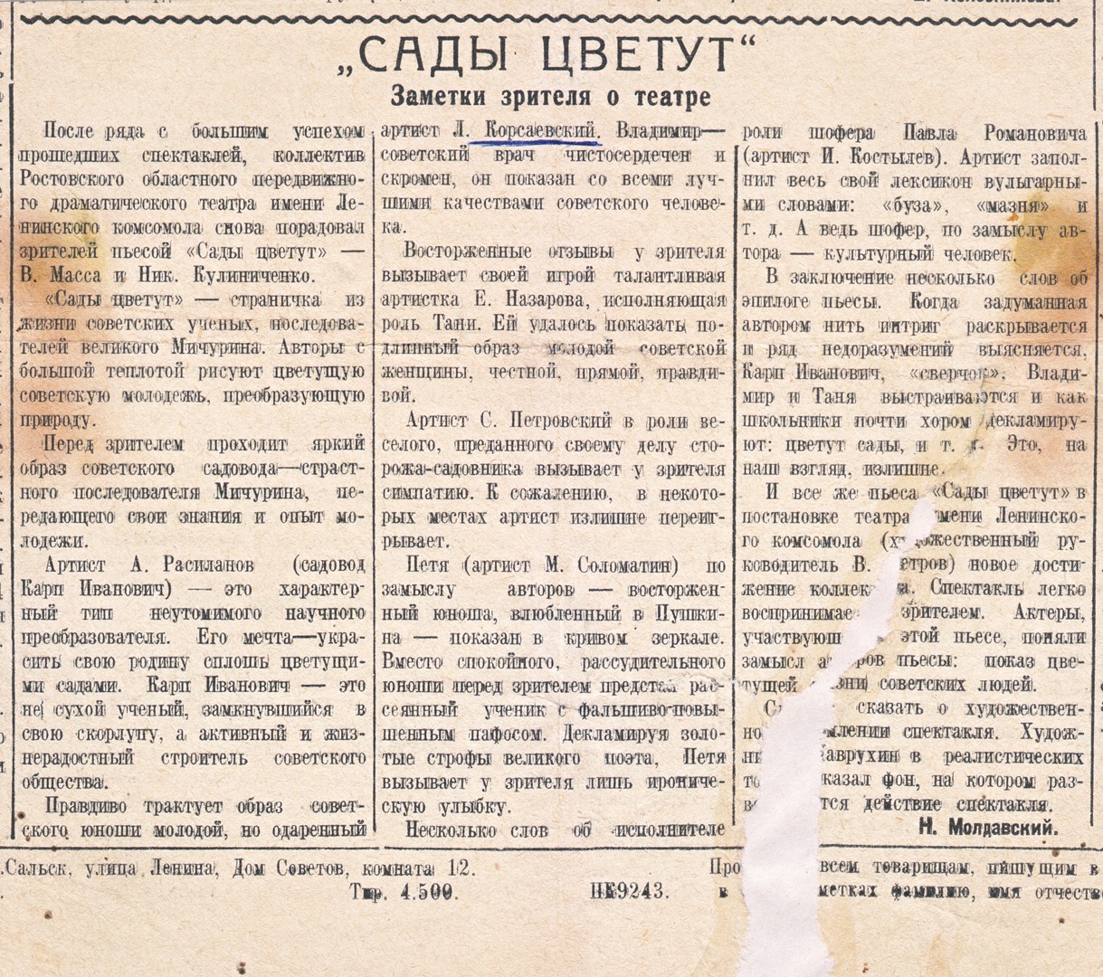 | 29 | марта | 1942: | "...Был от Лёни из Сальска директор театра ??? газетный отзыв о постановке "Сады цветут." |
