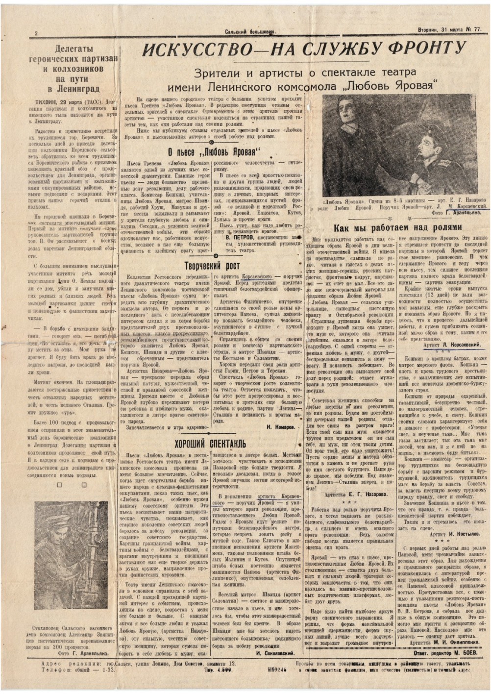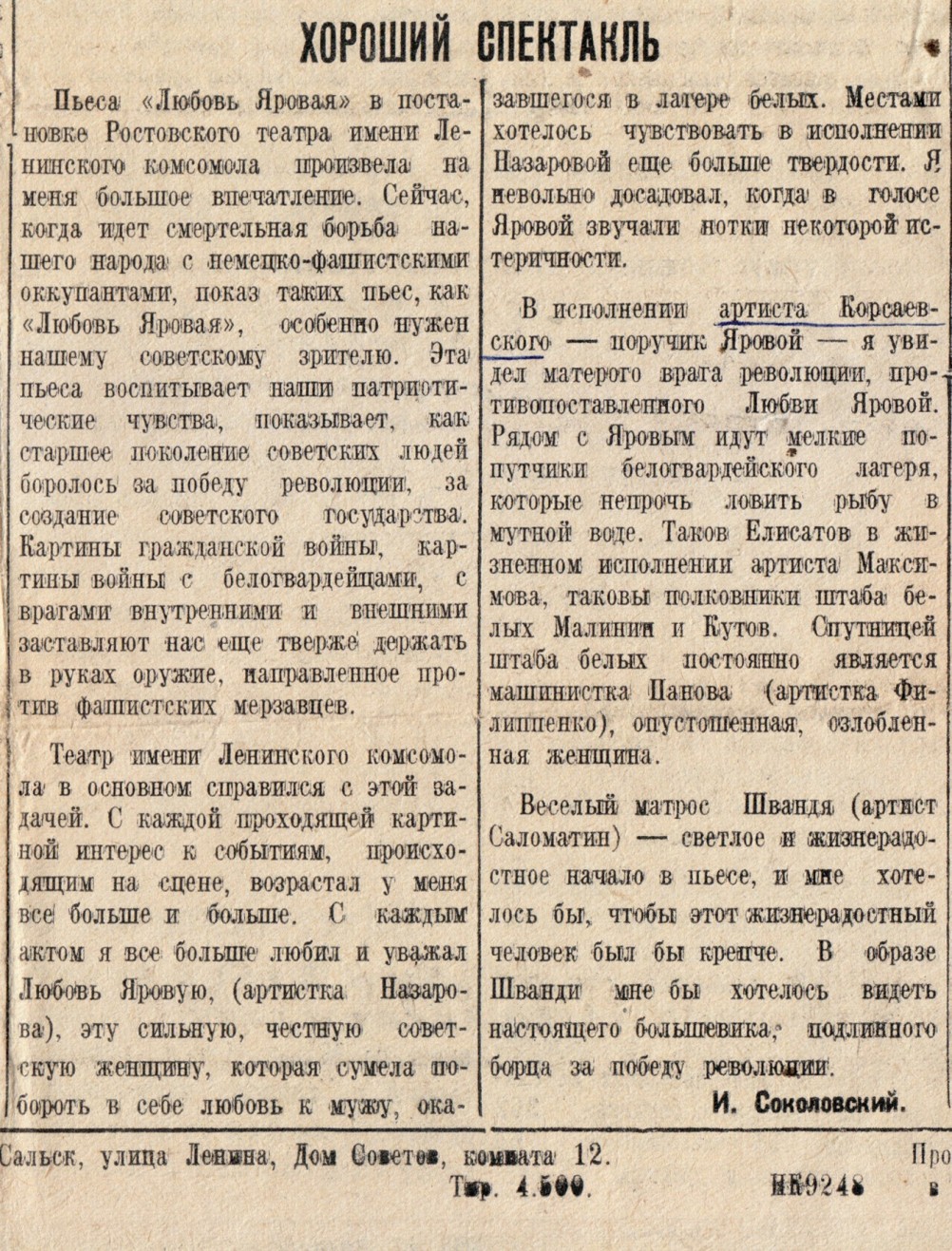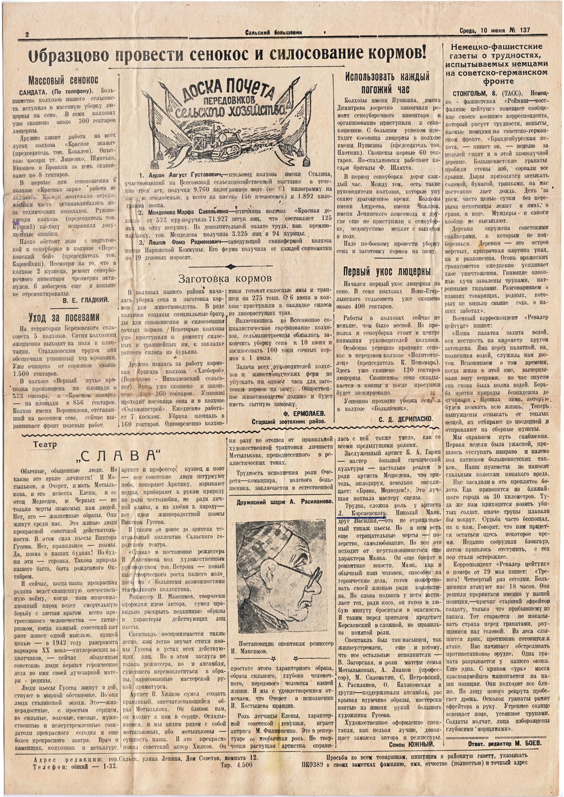 | 13 | июня | 1942: | "...Письмо от Лёни и газета с отзывом о постановке "Славы" Громова. Лёня играет Маяка (Николай Маяк), отзыв хороший. Газета "Сальский большевик" №137, 10/VI-42г." |