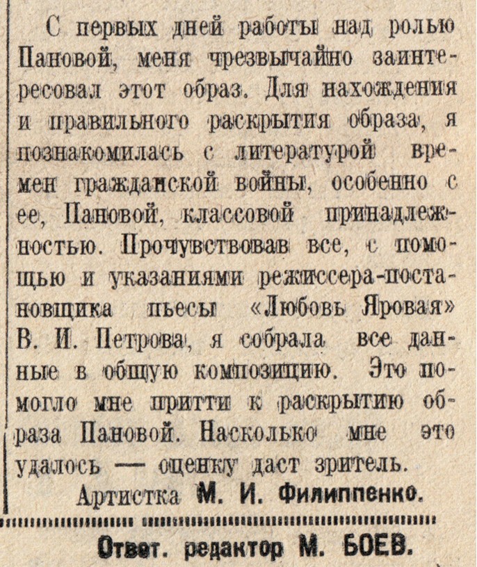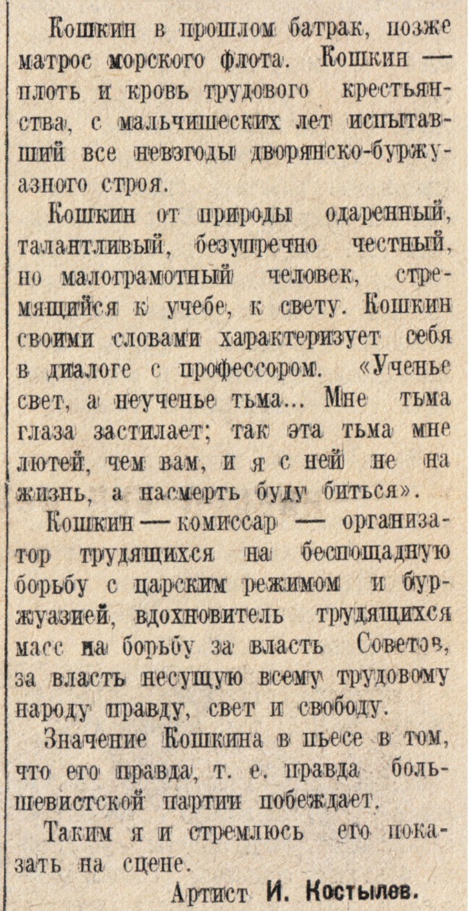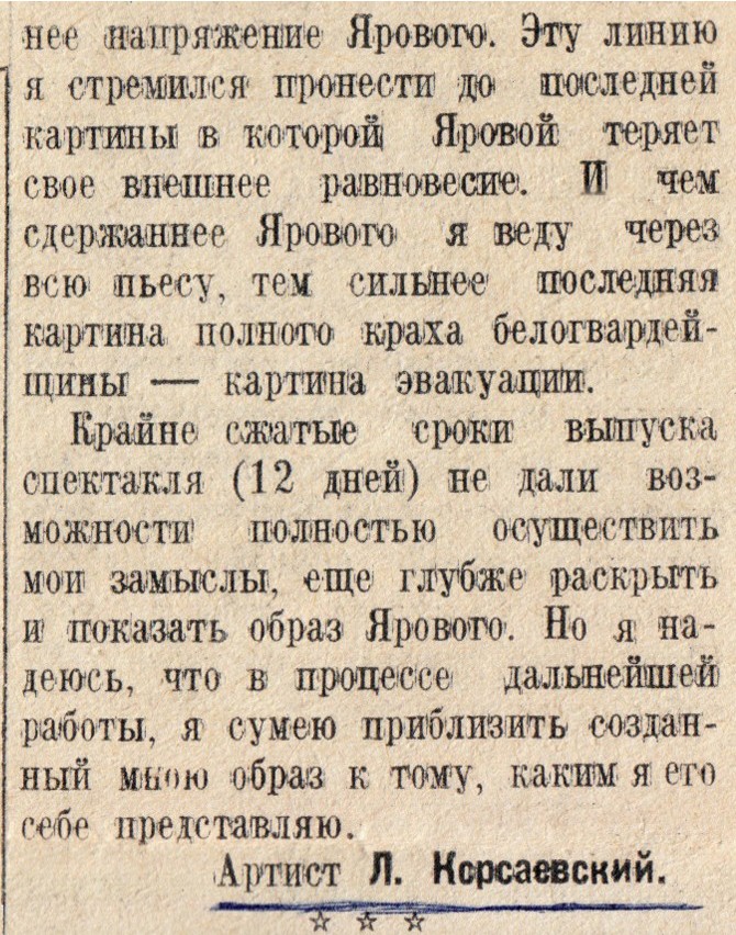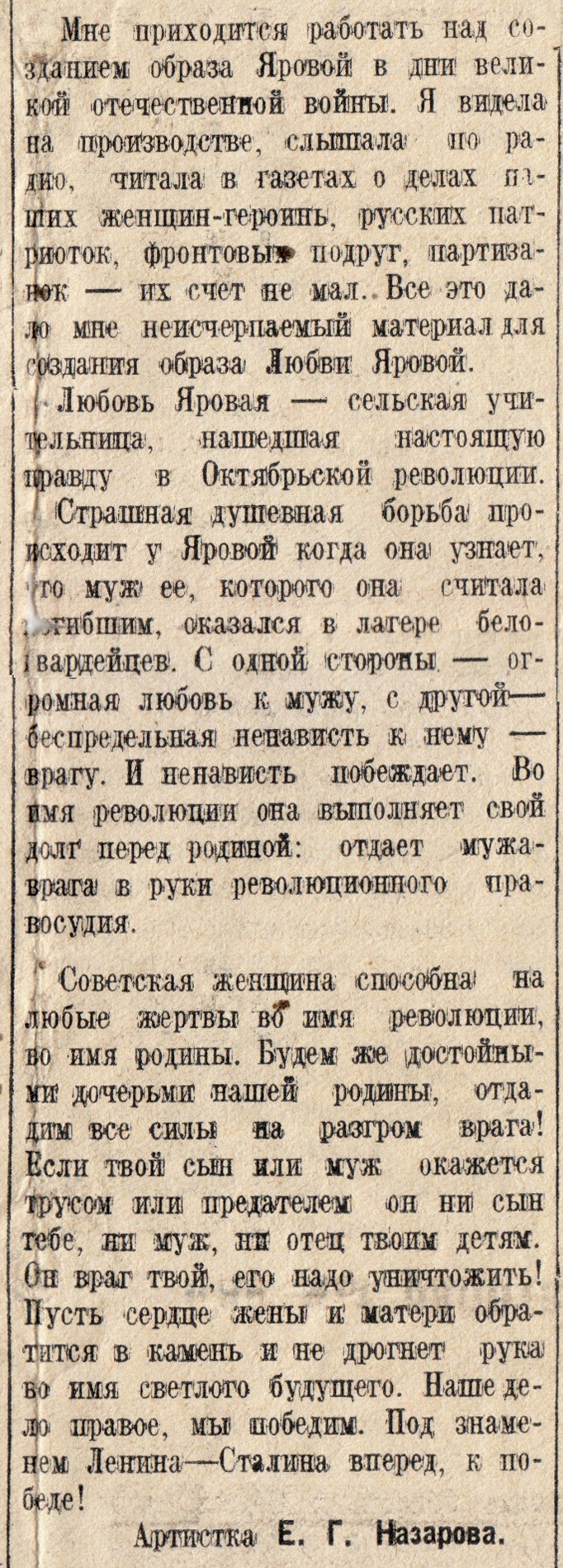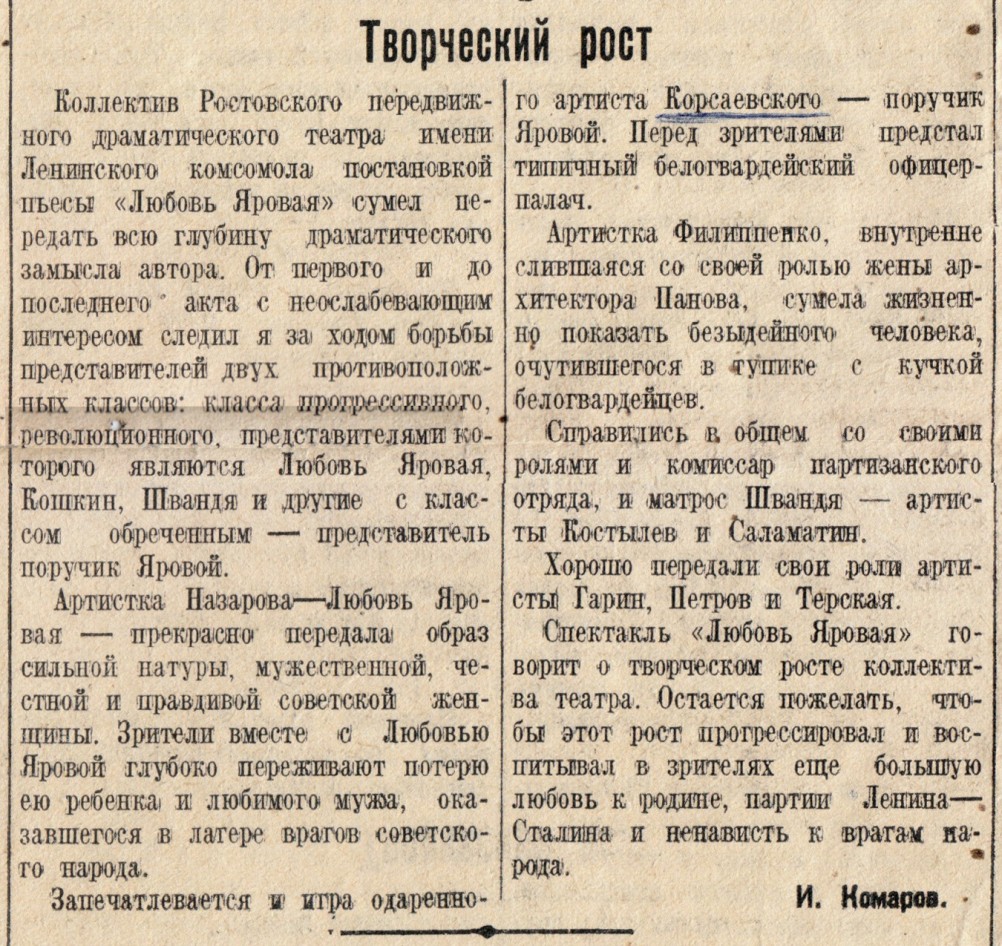 | 13 | июня | 1942: | "...Письмо от Лёни и газета с отзывом о постановке "Славы" Громова. Лёня играет Маяка (Николай Маяк), отзыв хороший. Газета "Сальский большевик" №137, 10/VI-42г." |