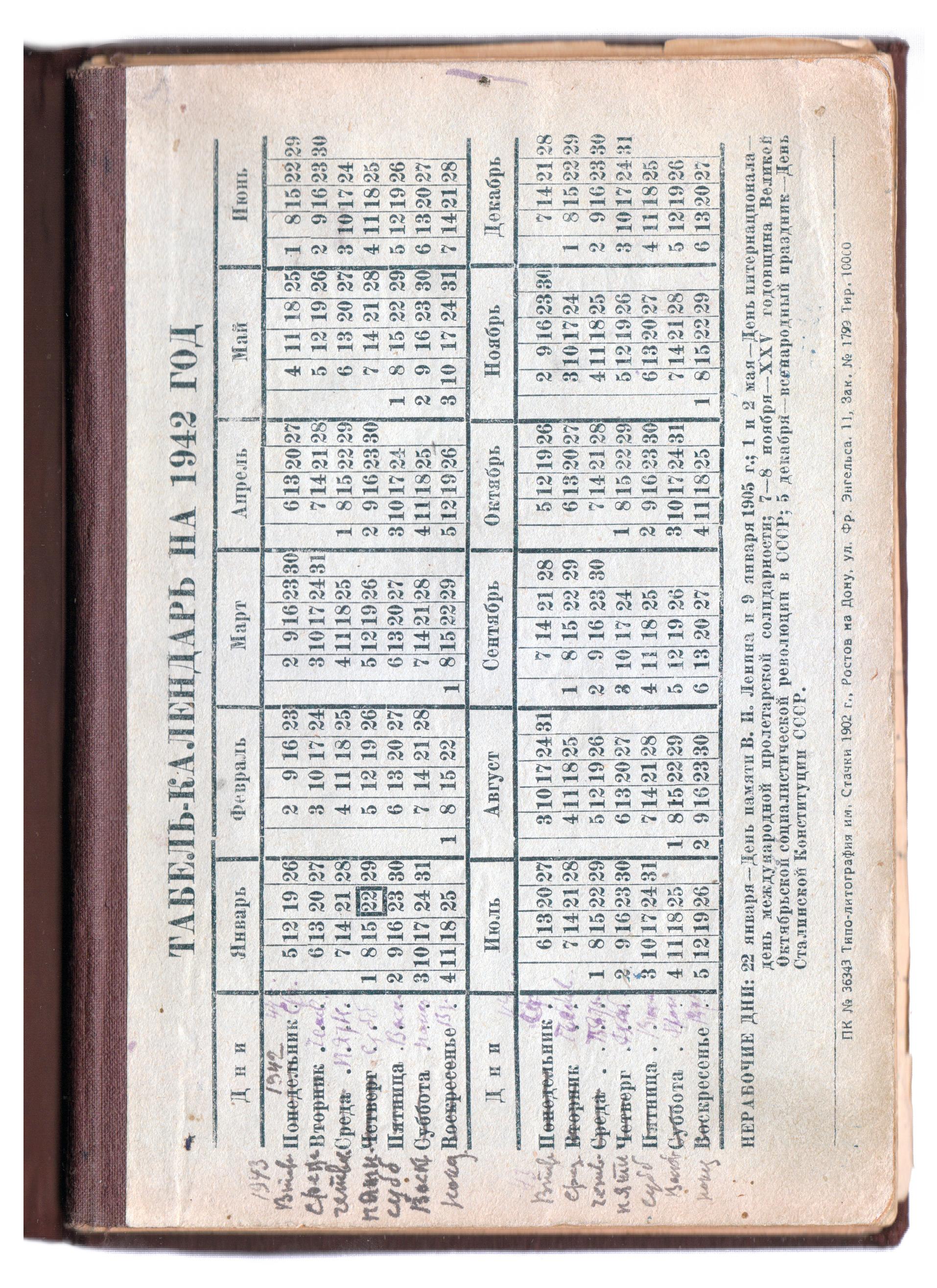 | 06 | июля | 1942: | "...Жителям Синявки, Чалтыря и других приказано скосить несозревшие посевы. Они выселяются из деревень. Из города очень многие выезжают ...От Наташи ничего нет. " |