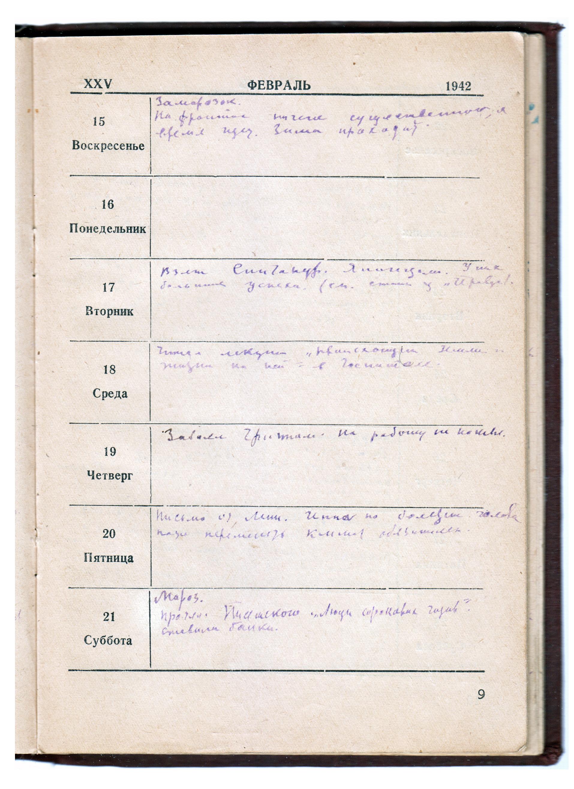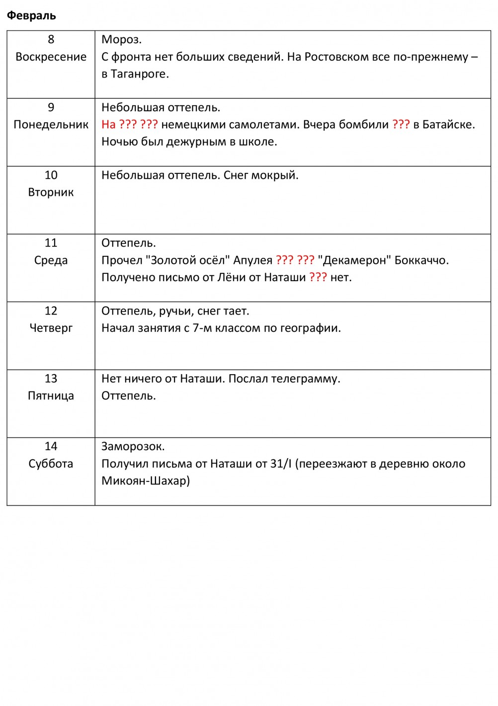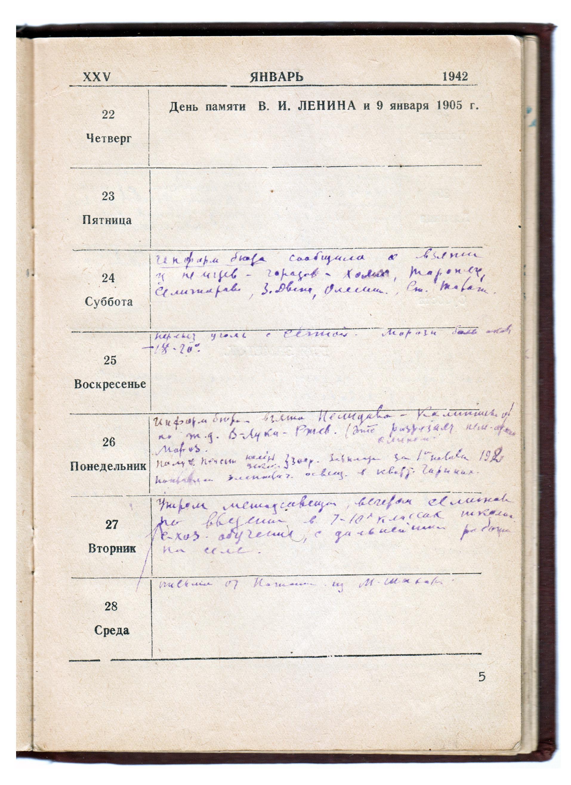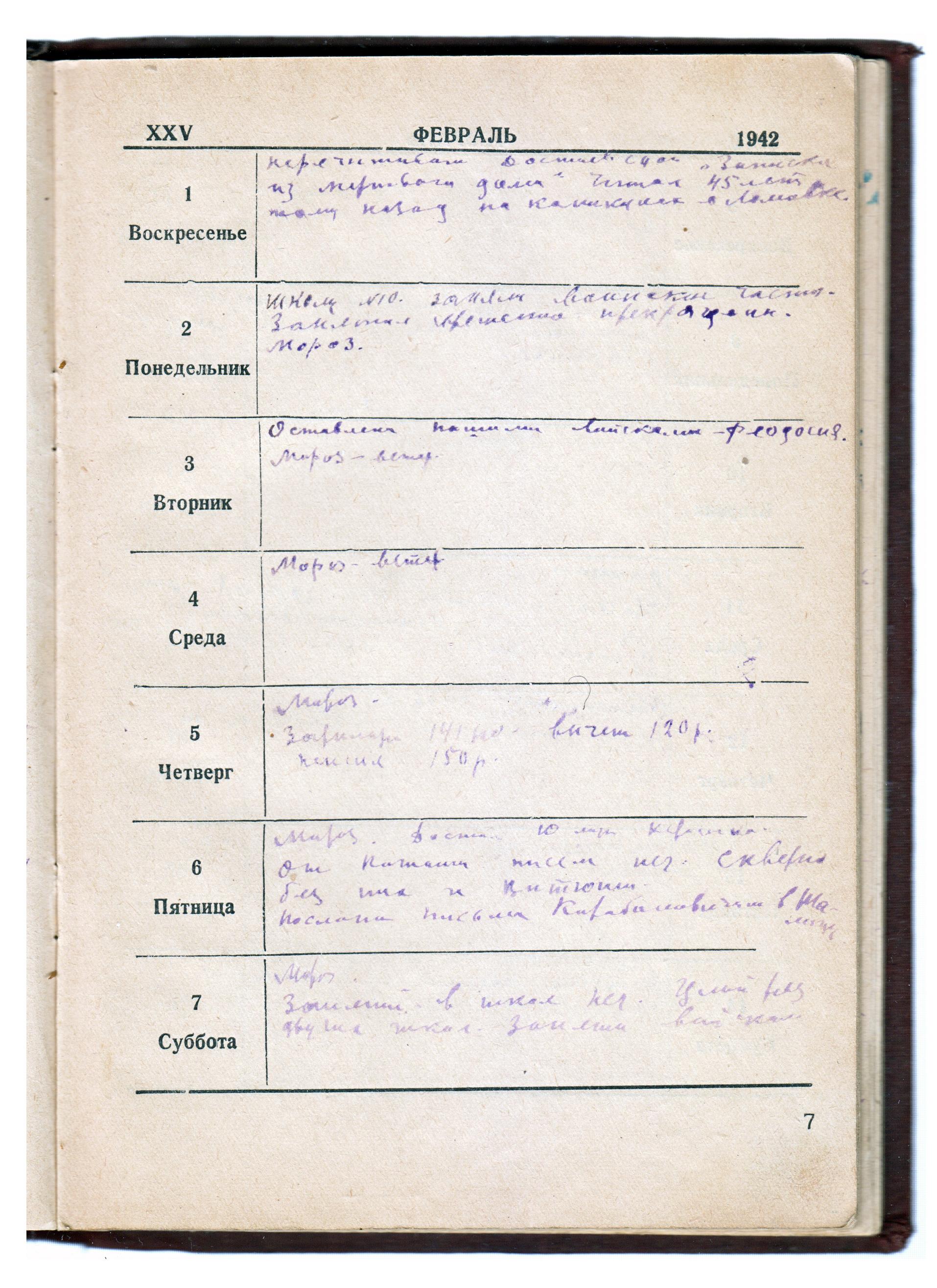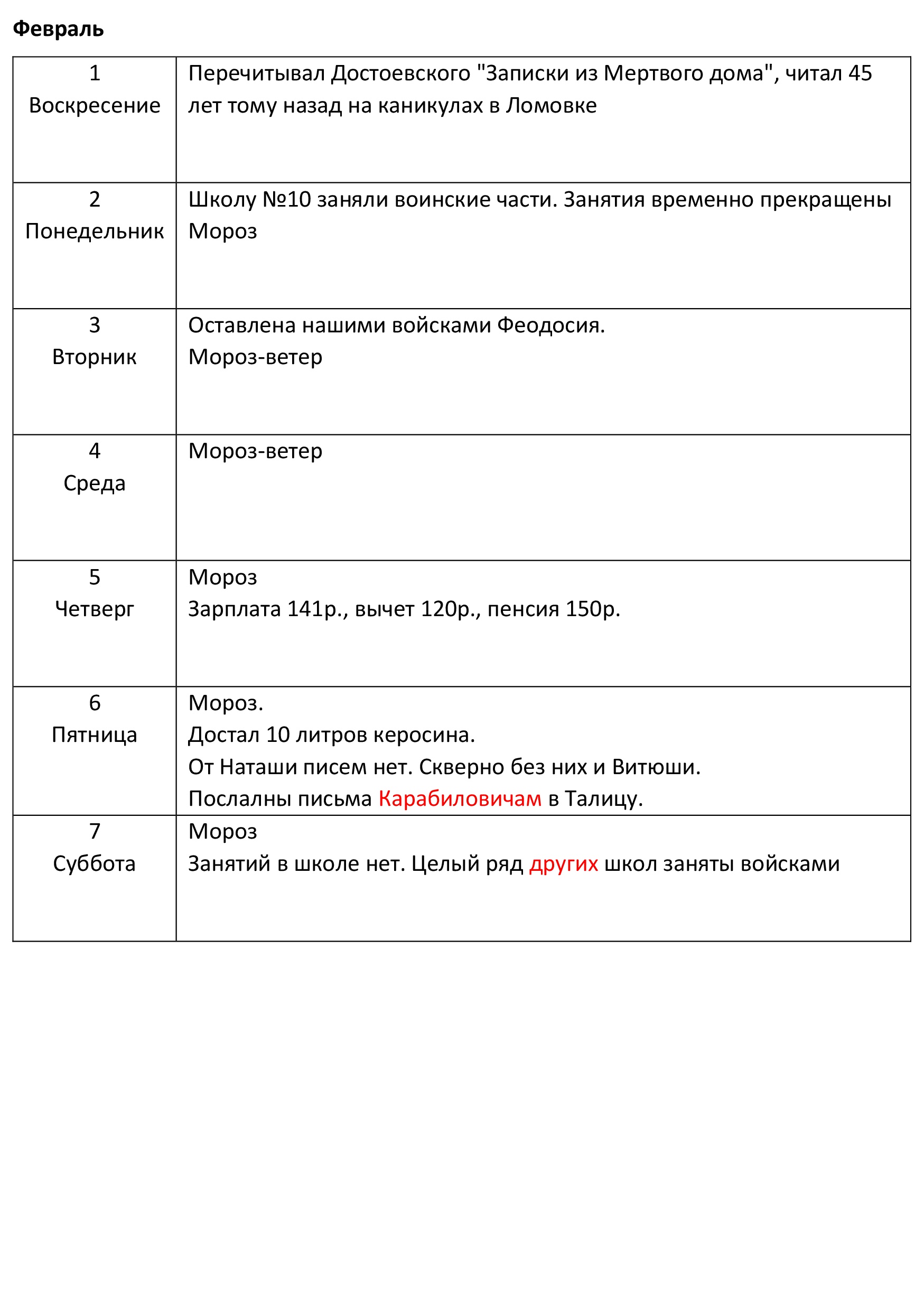 | 07 | февраля | 1942: | "…Занятий в школе нет. Целый ряд других школ заняты войсками." |