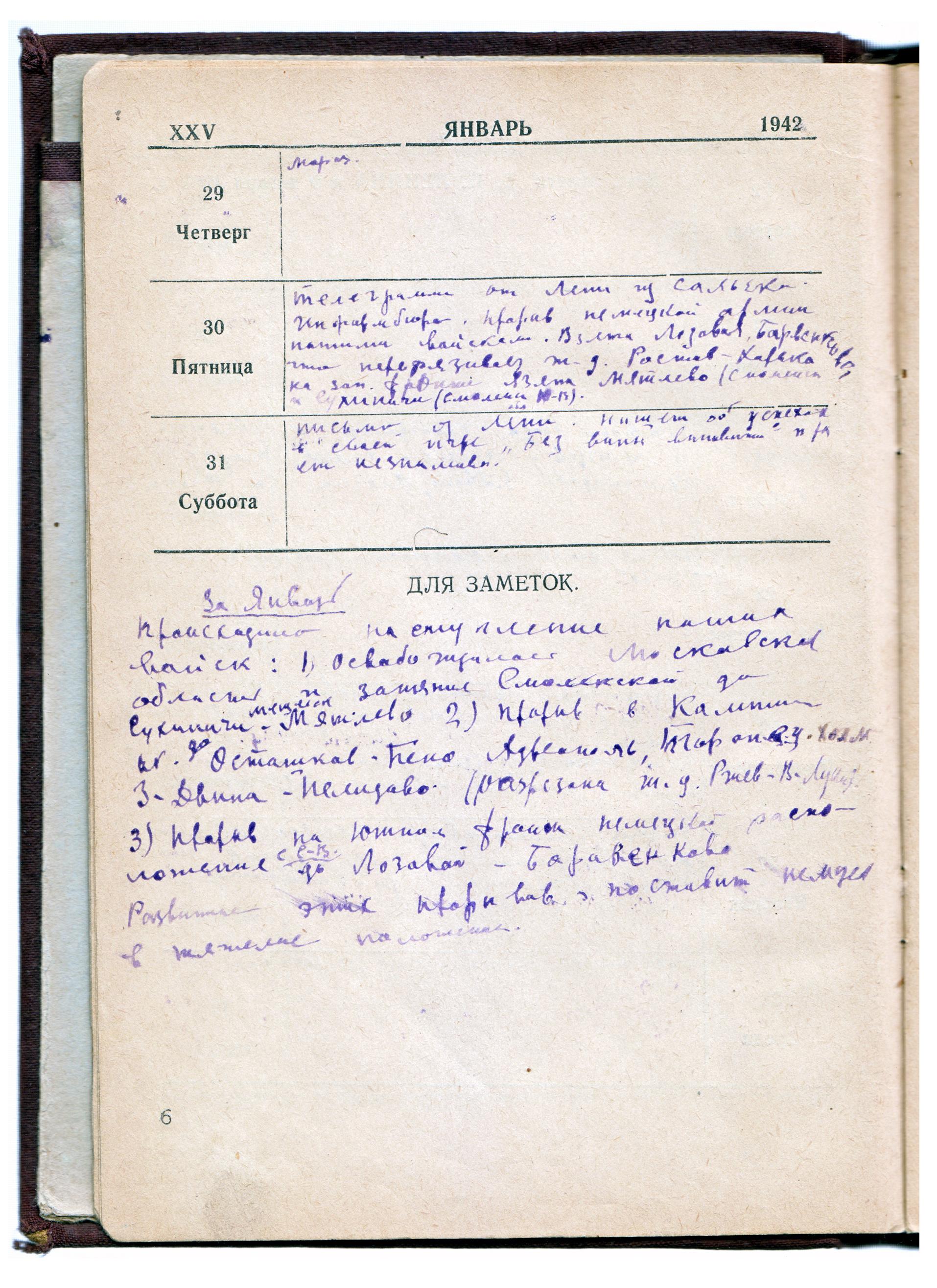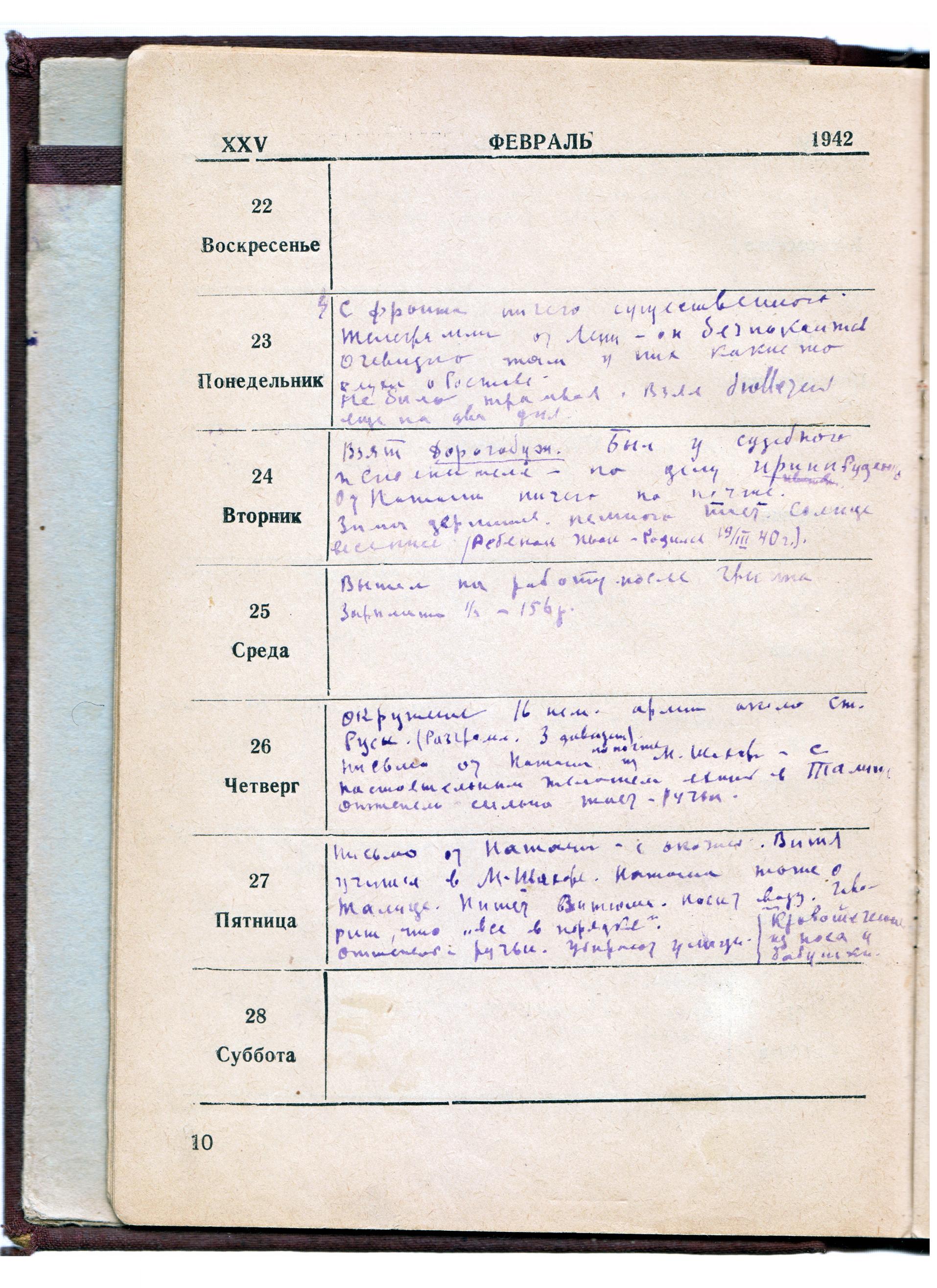 Февраль 1943 (Сальск): "Прошёл целый месяц. Сколько неописуемых событий. Приход Советских войск и уход немцев. Так надоел мне немецкий военный сапог. Ни одной минуты я не чувствовал себя свободным. Неметчина (?) давила меня. Теперь надо узнавать о Наташечки и Витюше. Какая радость у меня за них, если, конечно, у них до сих пор было благополучно. Милые мои, скорее бы узнать о вас, скорее бы видеть вас. Жаль, что нет Лёни. Куда они запропастились?"