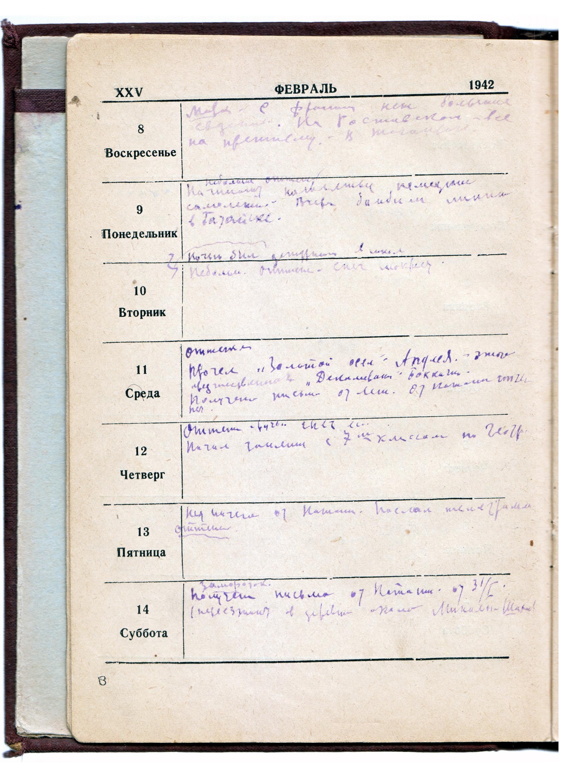 | 27 | февраля | 1942: | "...Письмо от Наташи с оказией. Витя учится в М.-Шахаре. Наташа тоже о Талице." |
