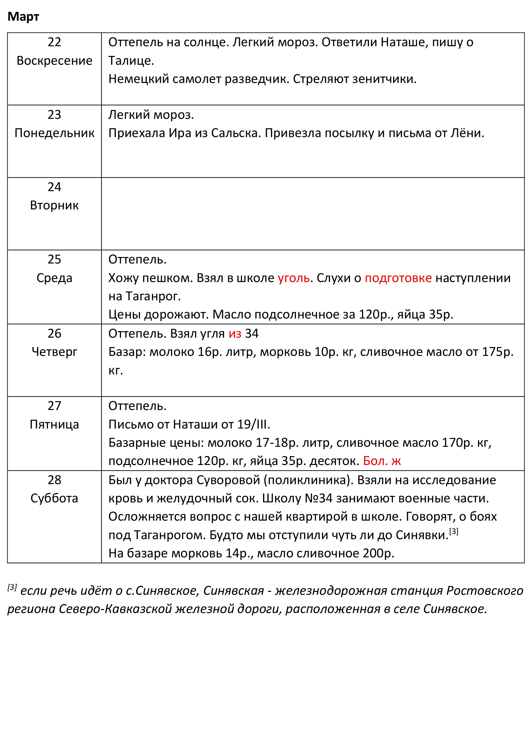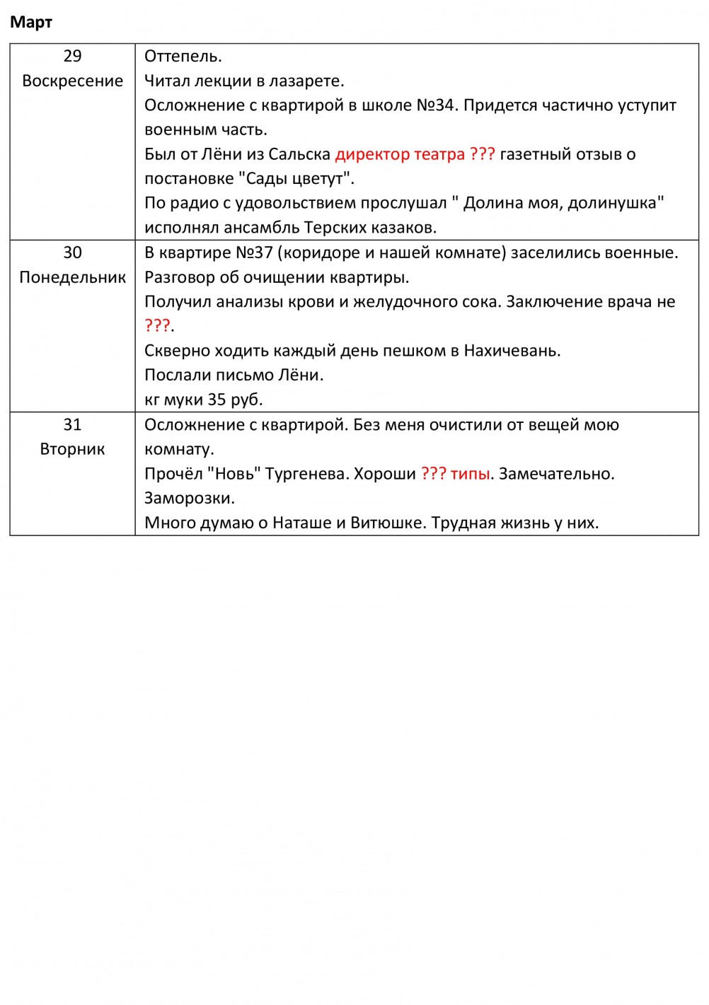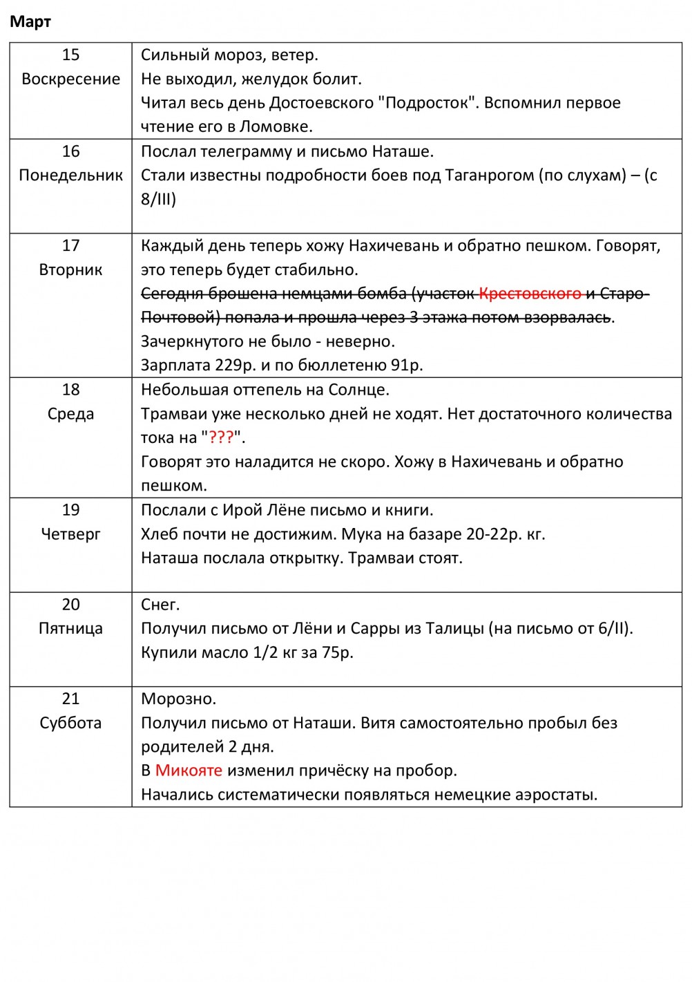 | 17 | марта | 1942: | "...Каждый день теперь хожу Нахичевань и обратно пешком. Говорят, это теперь будет стабильно." |