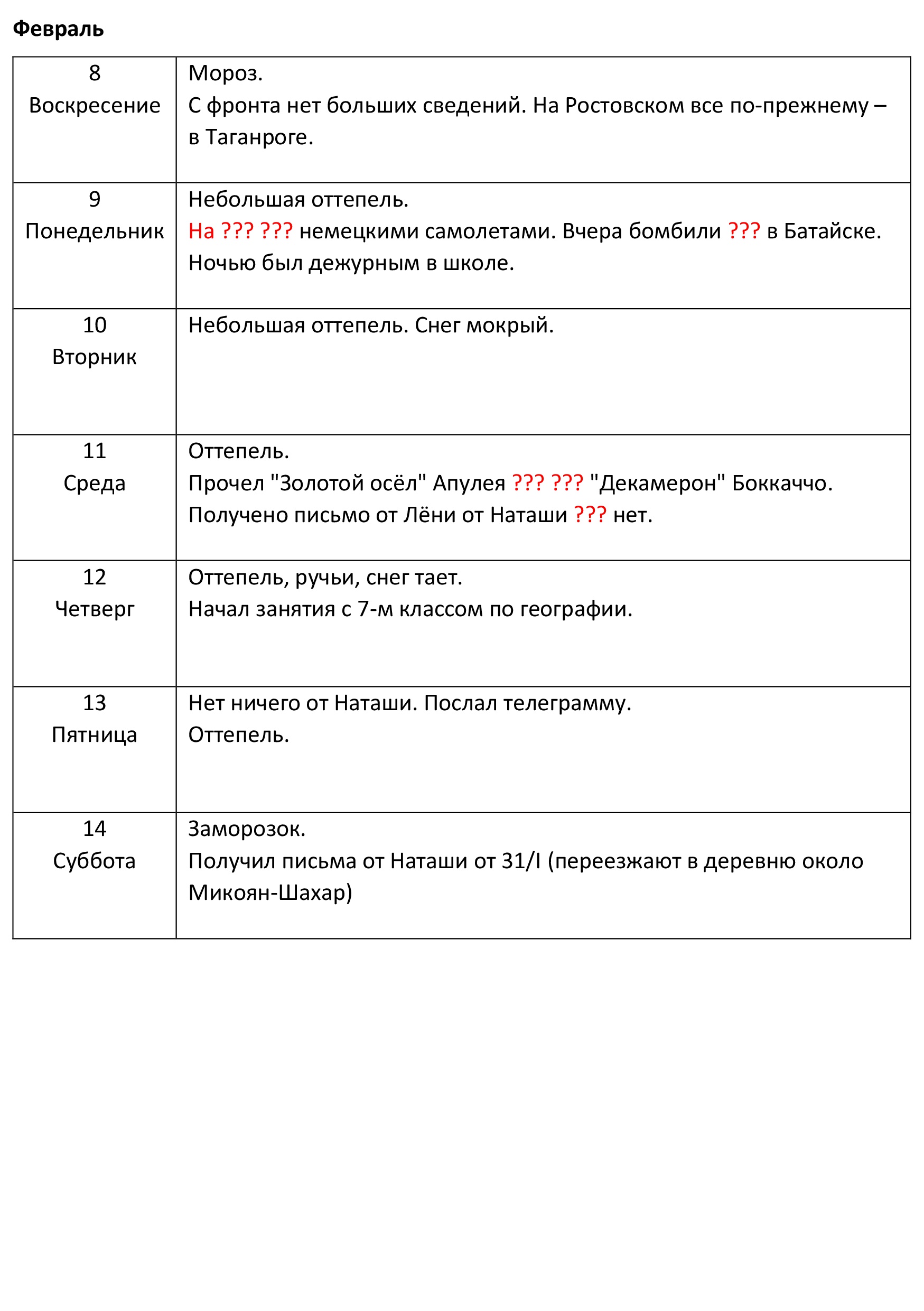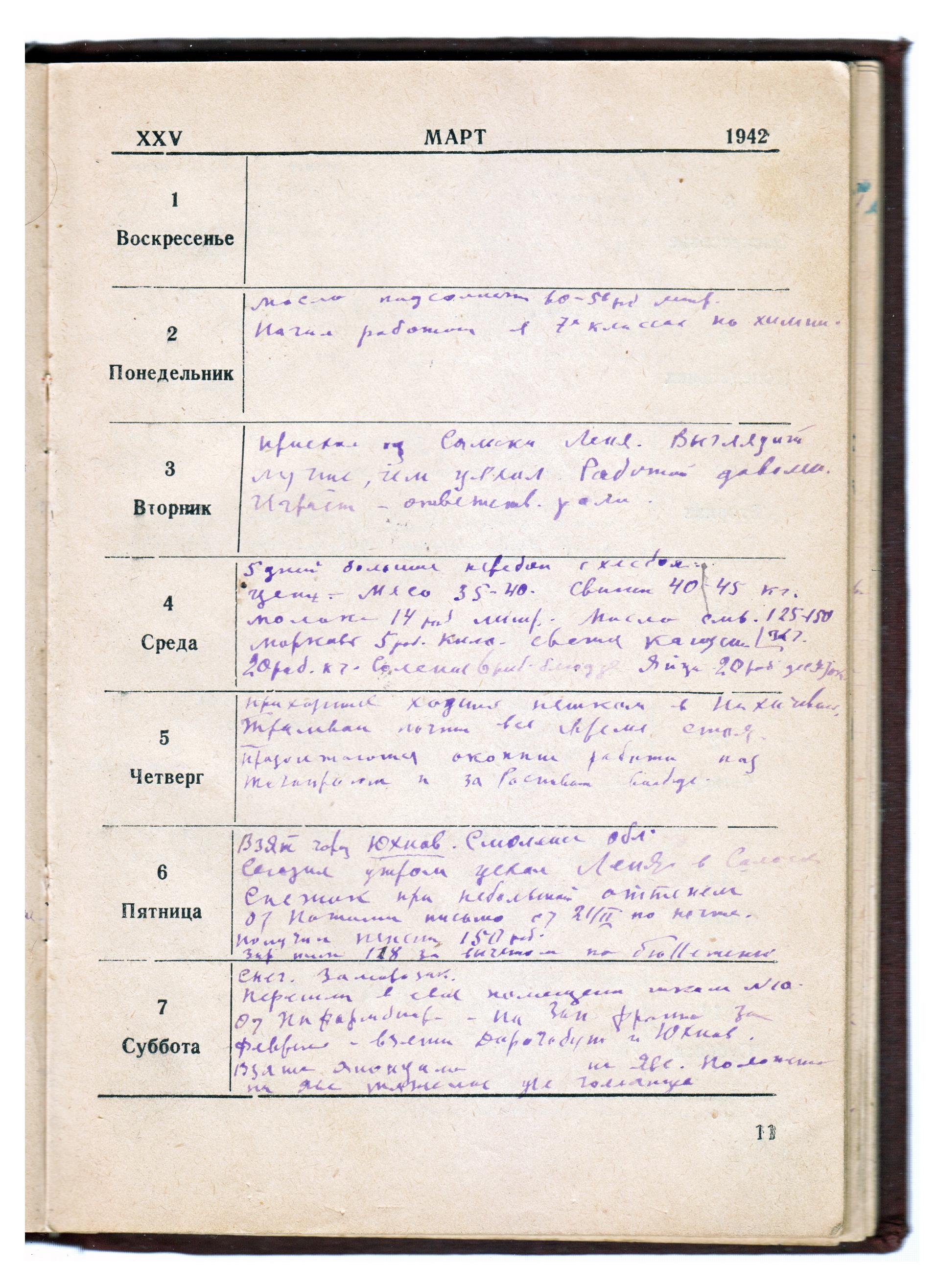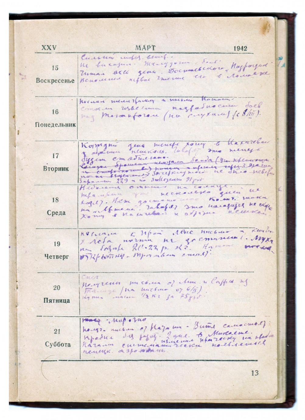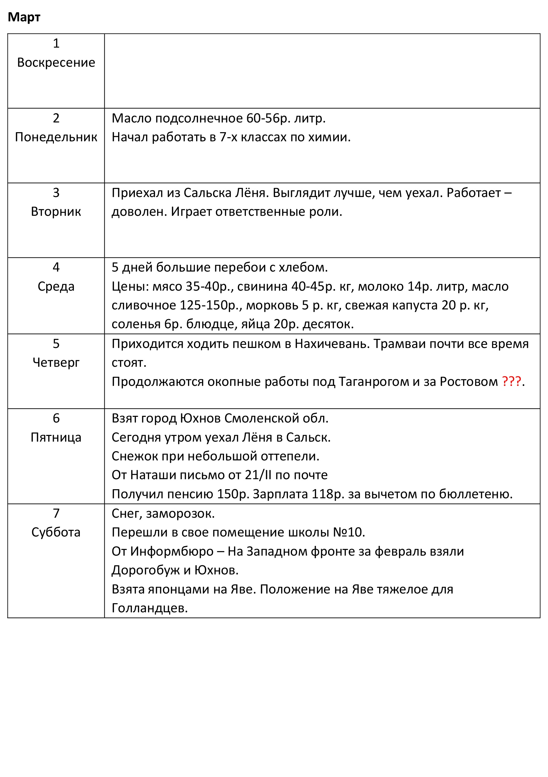 | 17 | марта | 1942: | "...Каждый день теперь хожу Нахичевань и обратно пешком. Говорят, это теперь будет стабильно." |