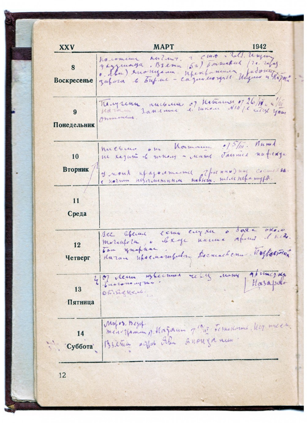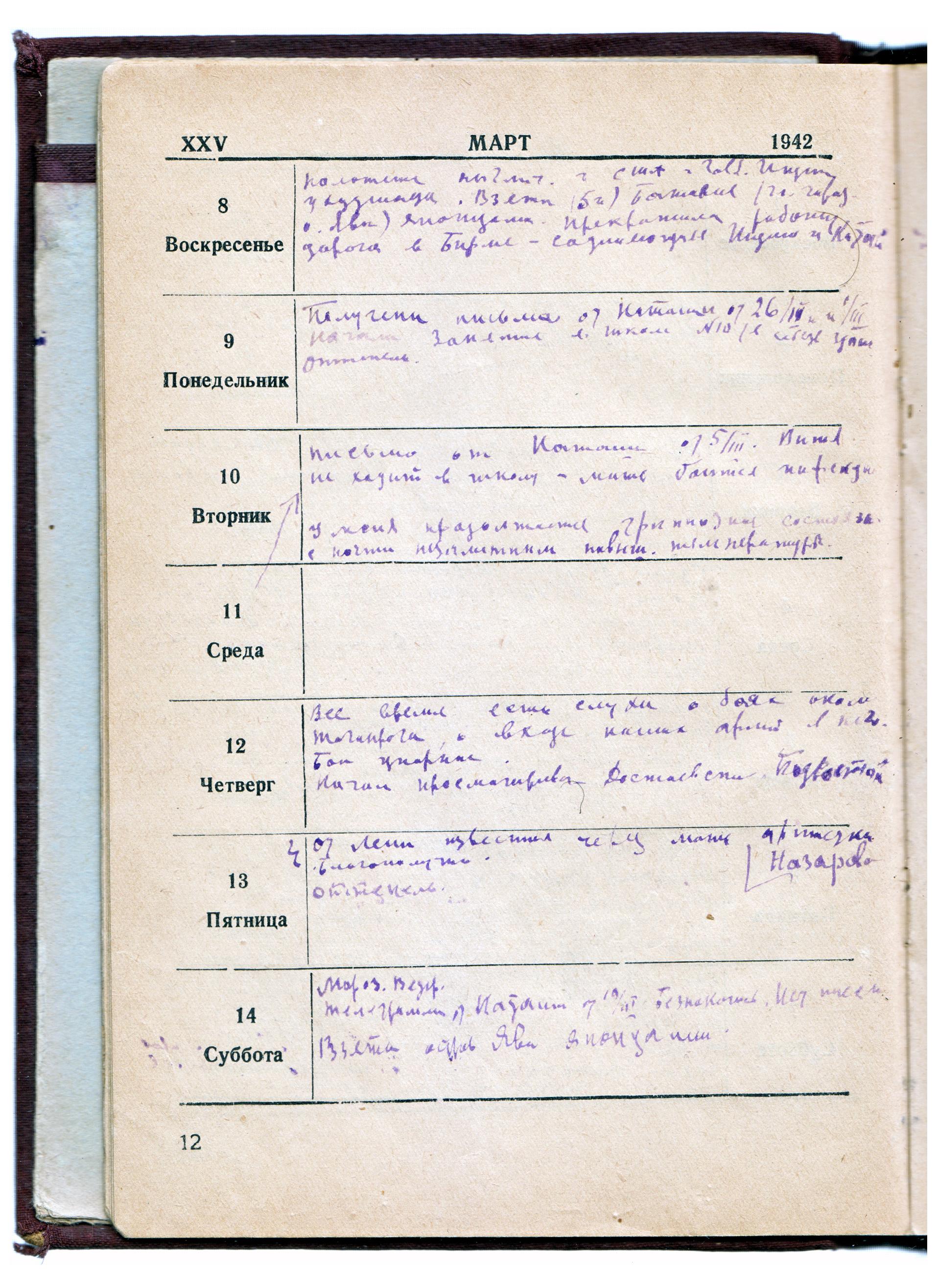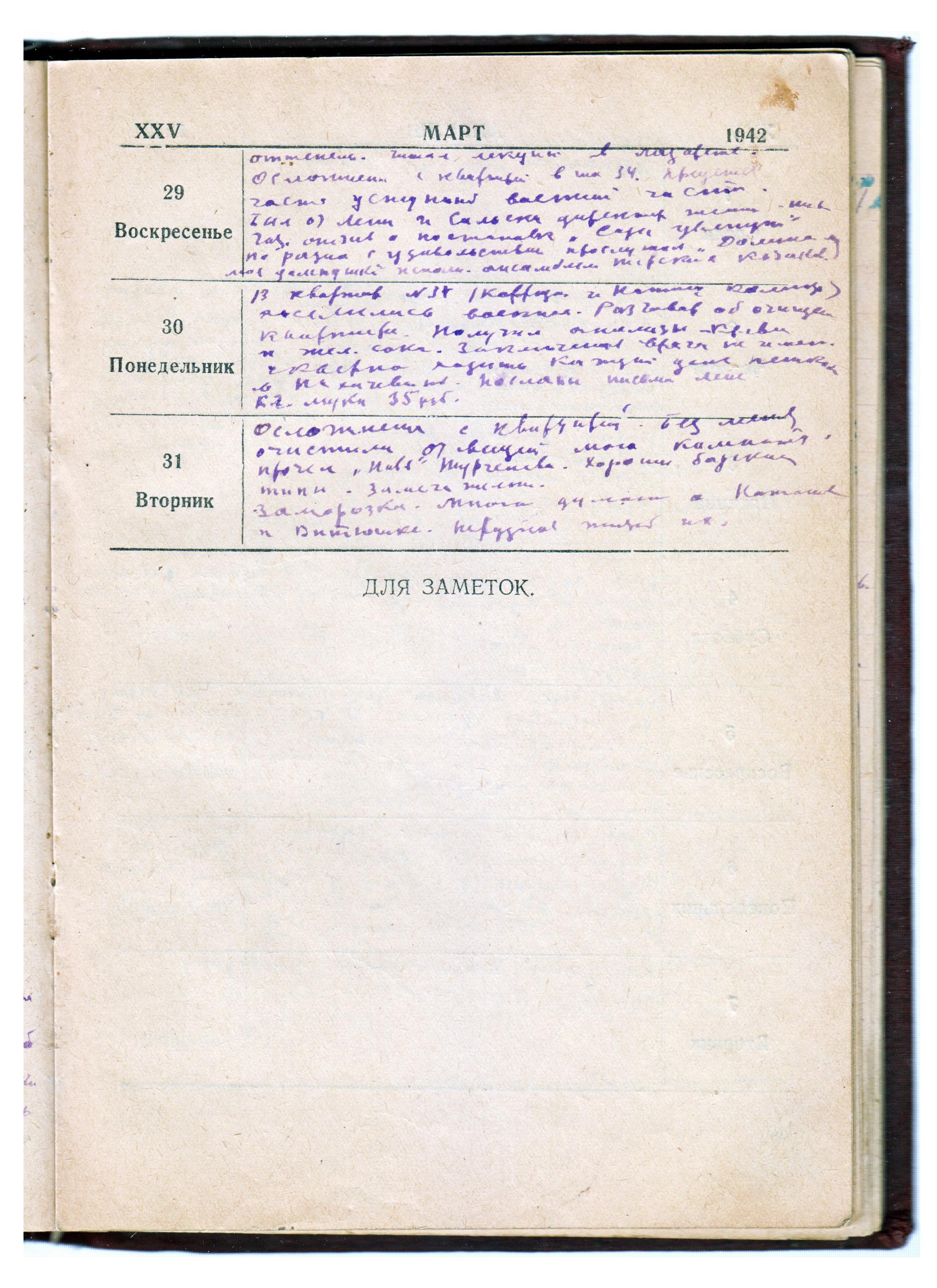 | 31 | марта | 1942: | "…Осложнение с квартирой. Без меня очистили от вещей мою комнату." |