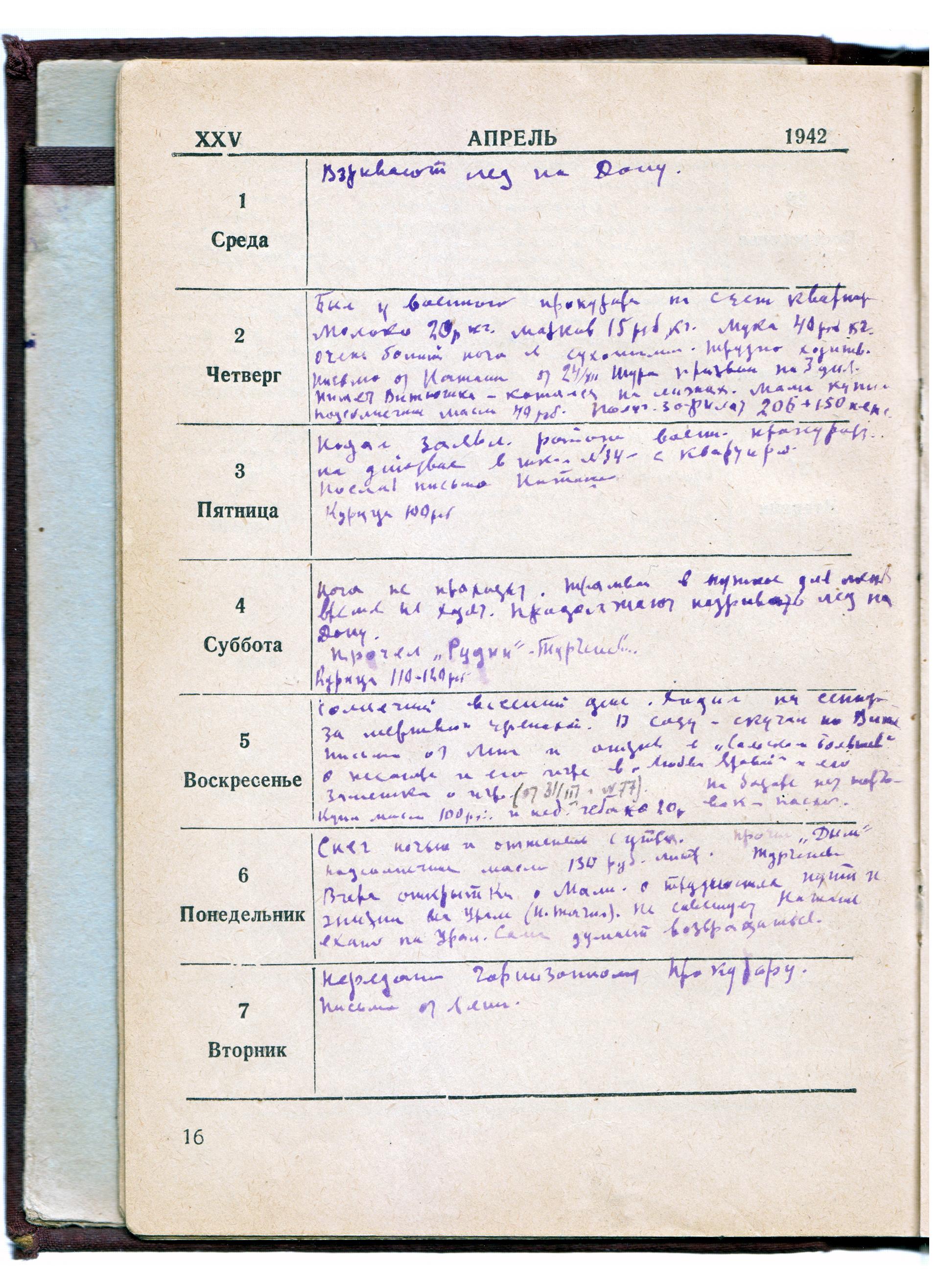 | 04 | апреля | 1942: | "...Нога не проходит. Трамвай в нужное для меня время не ходит." |