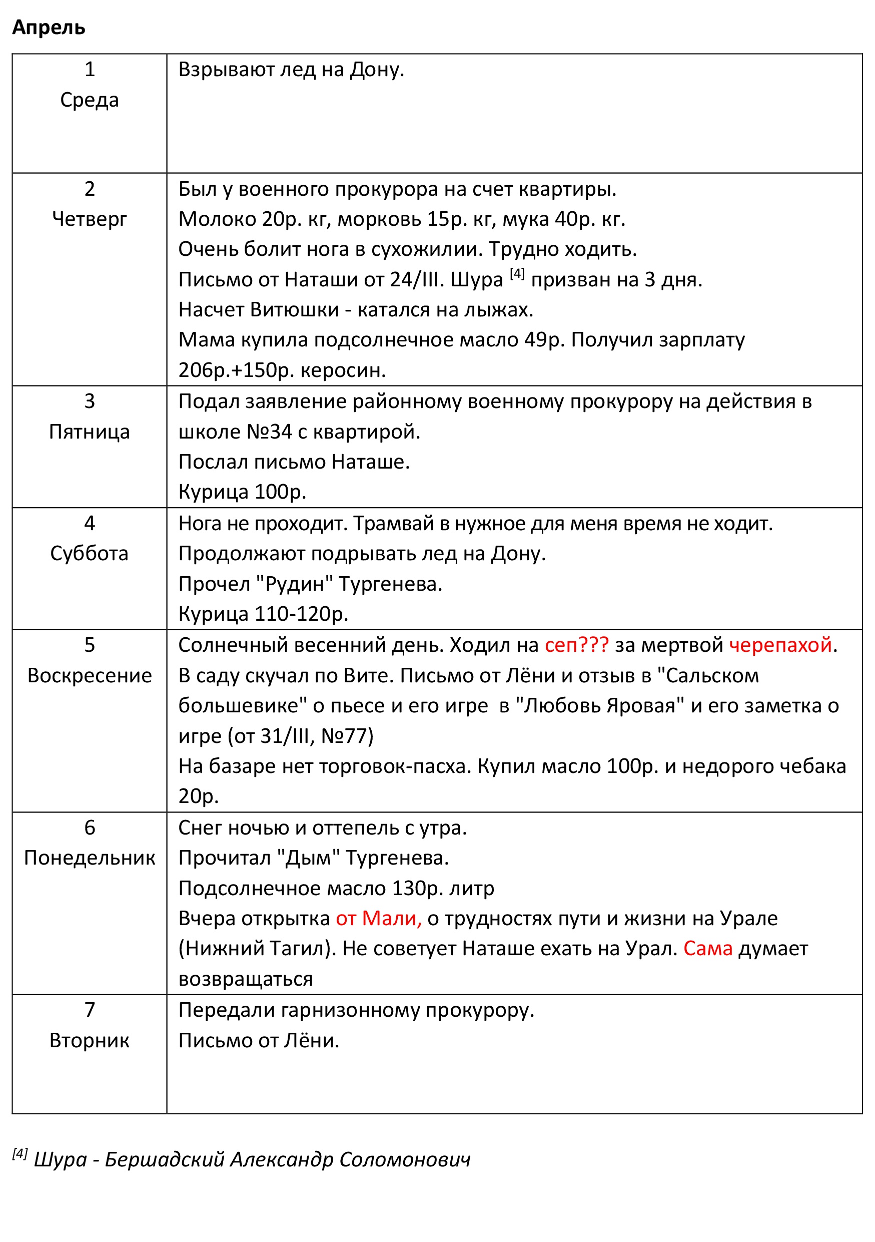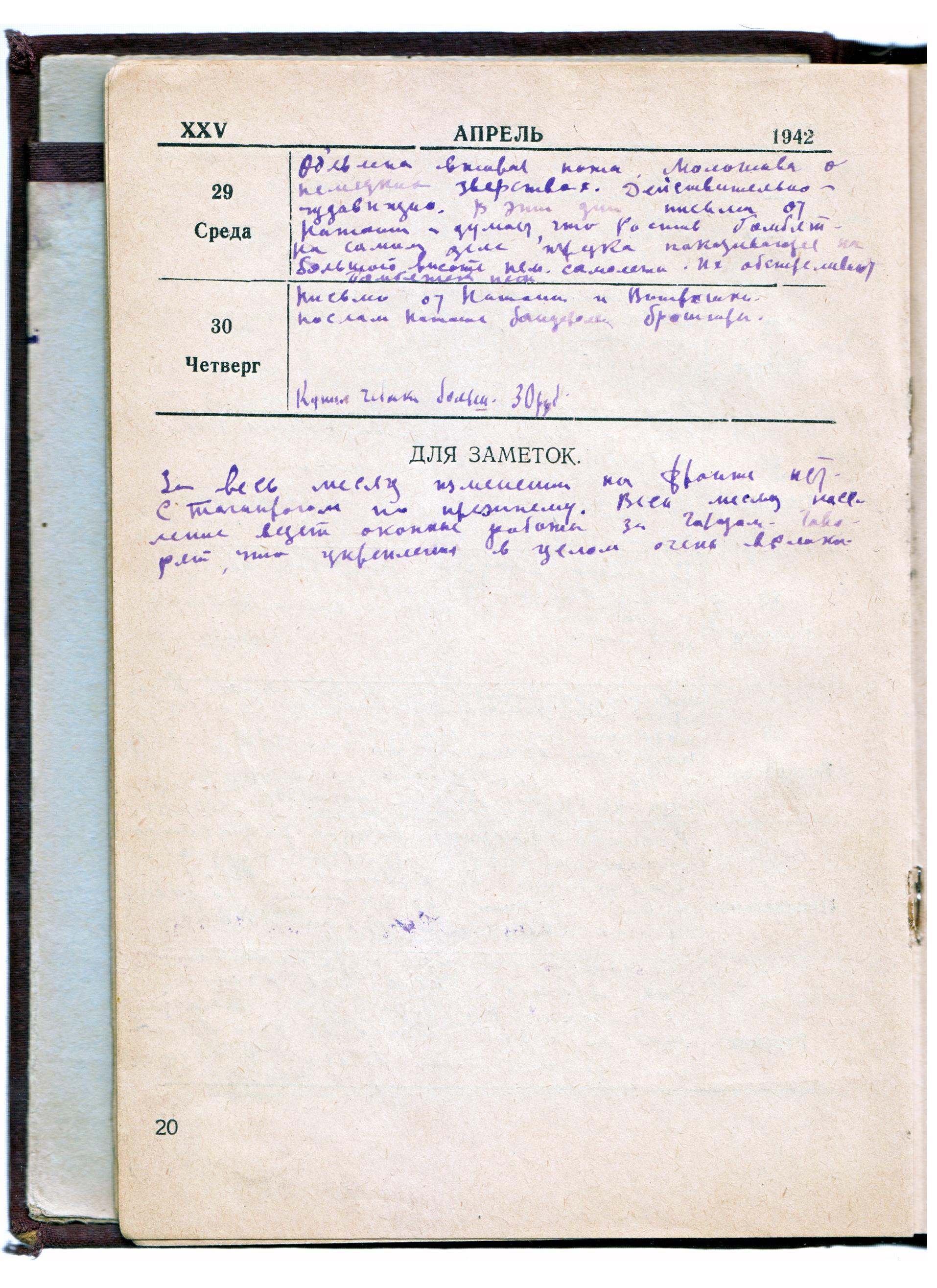 | 03 | апреля | 1942: | "…Подал заявление районному военному прокурору на действия в школе №34 с квартирой." |