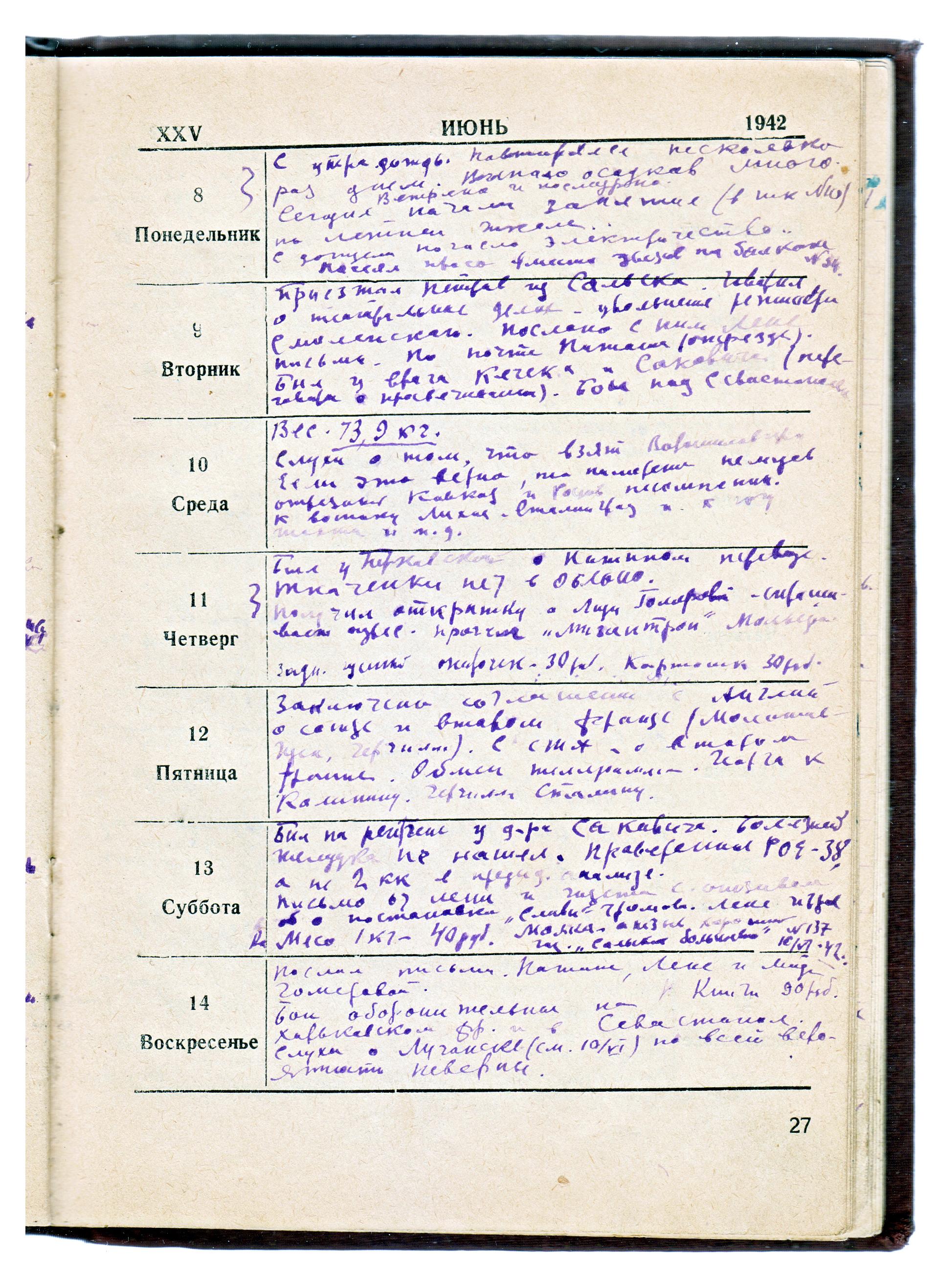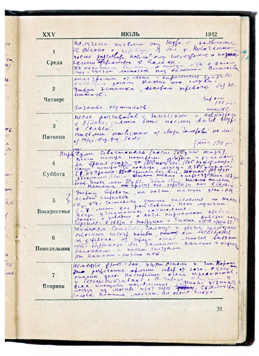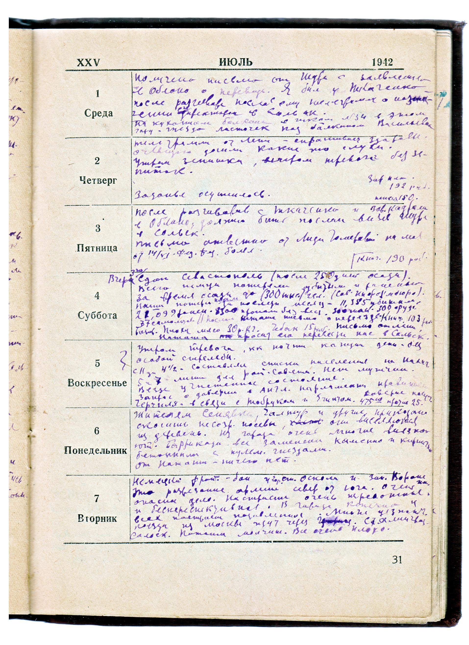 | 07 | июля | 1942: | "...Настроение очень тревожное и бесперспективное. В городе, конечно, у всех настроение подавленное. Многие уезжают. Поезда из Москвы идут через Сталинград-Сальск. Наташа молчит, все очень плохо." |