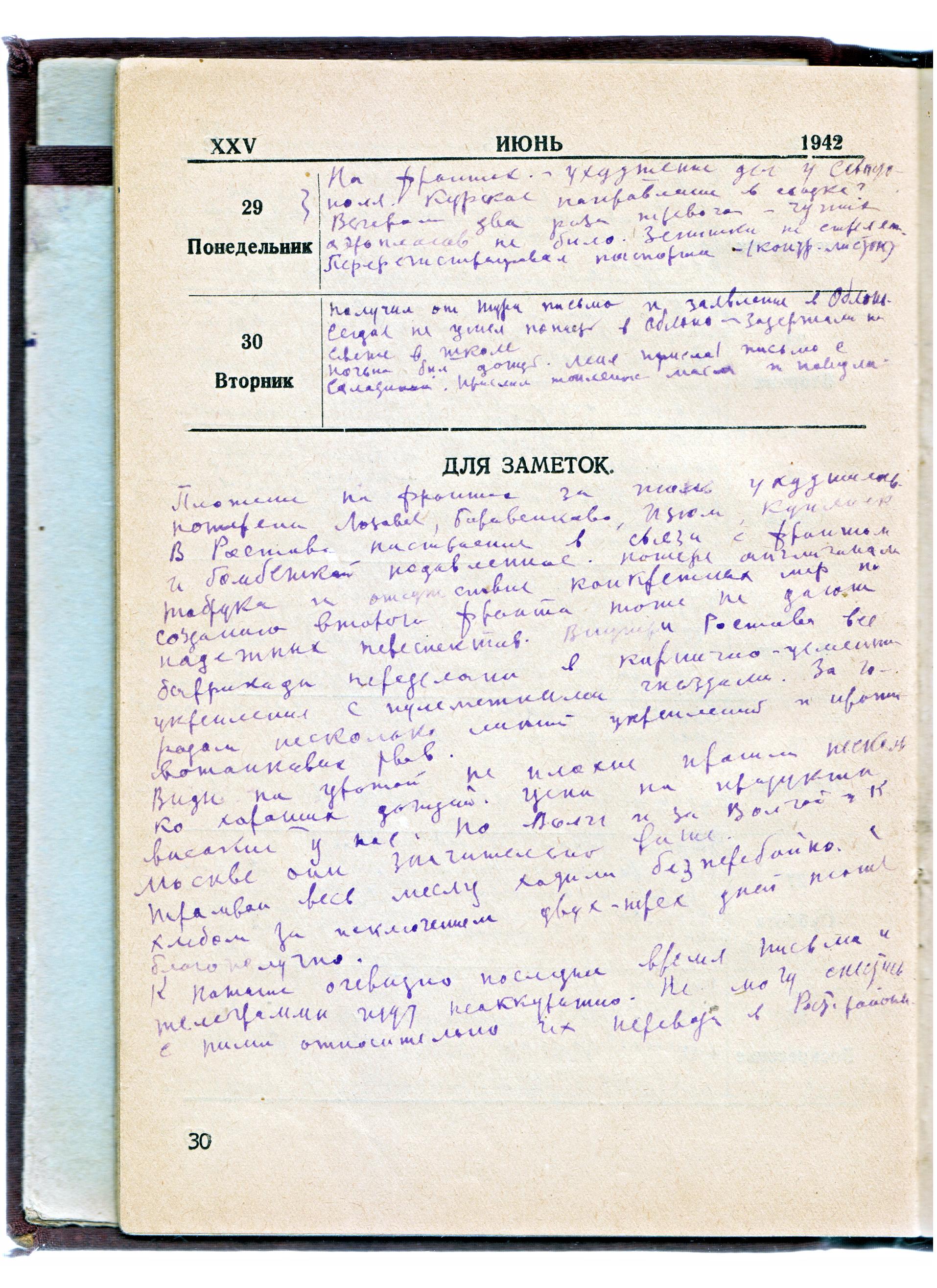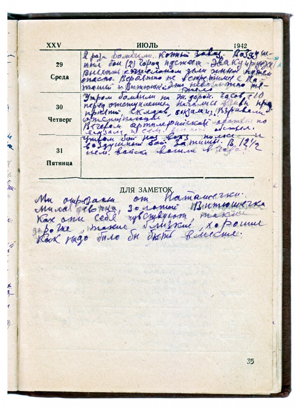 | 29 | июля | 1942: | "...2 раза бомбили конный завод. Воздушные бои (2). Город пустеет, эвакуируется. Выехать с эшелоном или иным путем опасно. Вероятно, не встретимся с Наташей и Витюшкой. Это невозможно тяжело." |