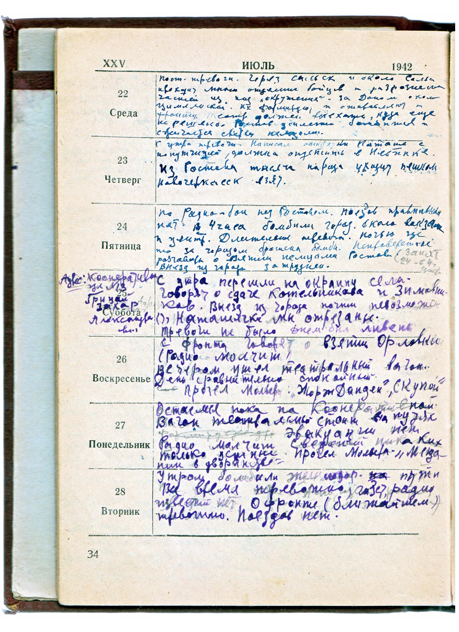 | 28 | июля | 1942: | "...Утром бомбили железнодорожные пути. Все время тревожно. Газет, радио, известий нет о фронте (ближайшем) тревожно. Поездов нет." |
