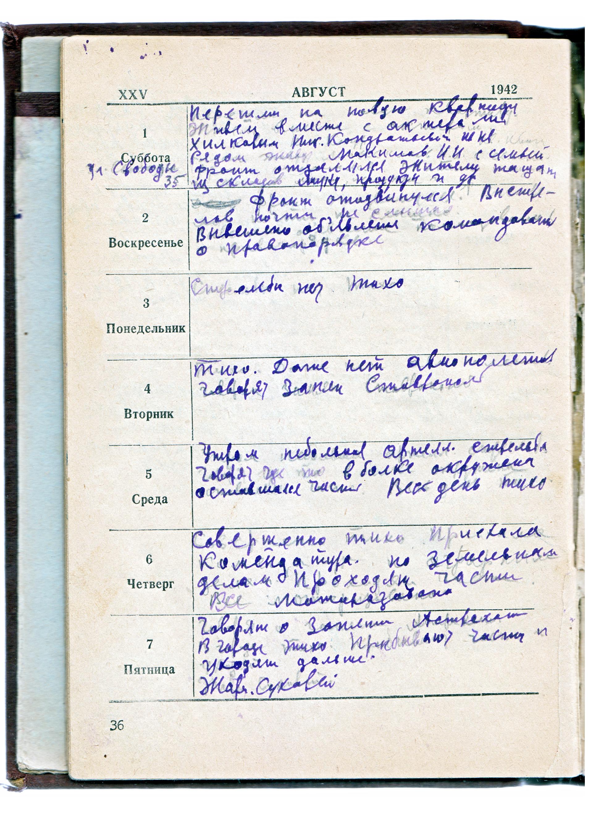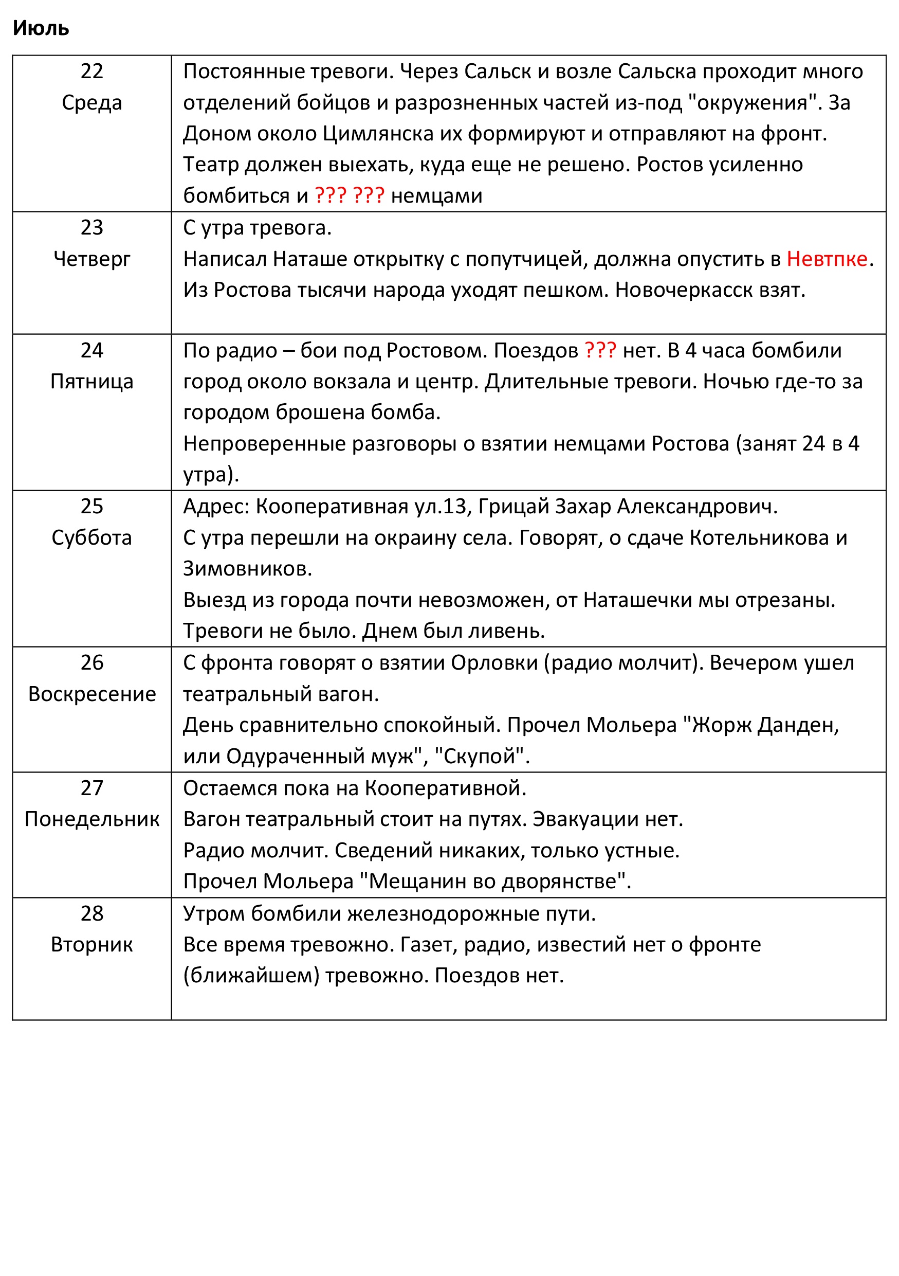 | 25 | июля | 1942: | "...Адрес: Кооперативная ул.13, Грицай Захар Александрович. С утра перешли на окраину села. Говорят, о сдаче Котельникова и Зимовников. Выезд из города почти невозможен, от Наташечки мы отрезаны." |