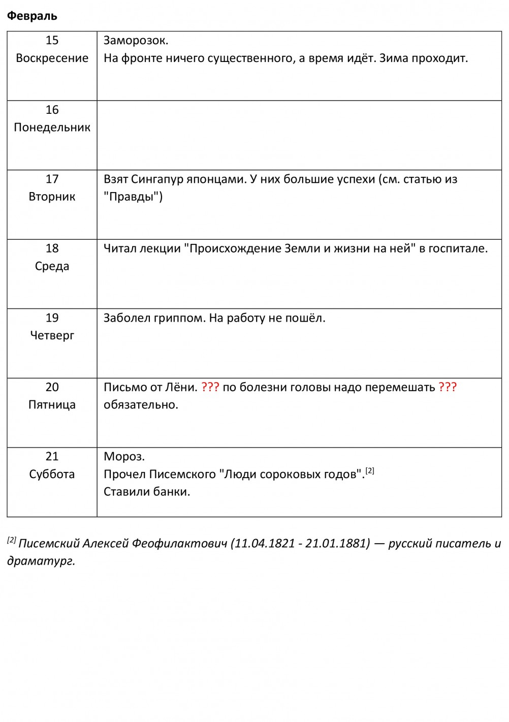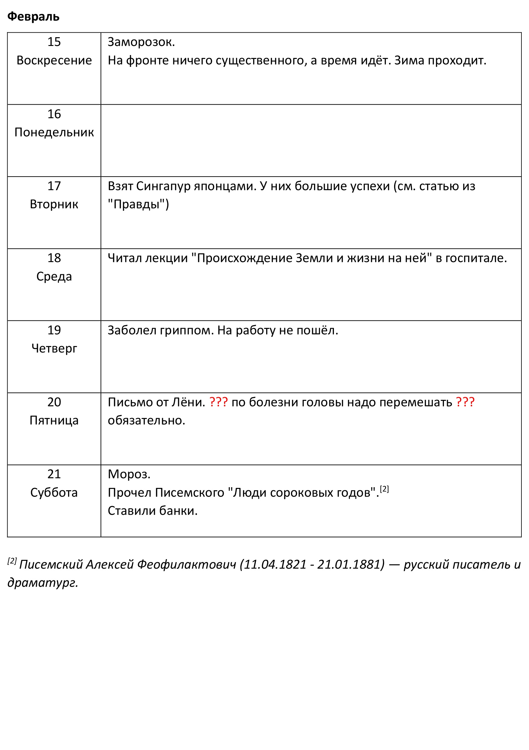 | 18 | февраля | 1942: | "…Читал лекции "Происхождение Земли и жизни на ней" в госпитале." |
