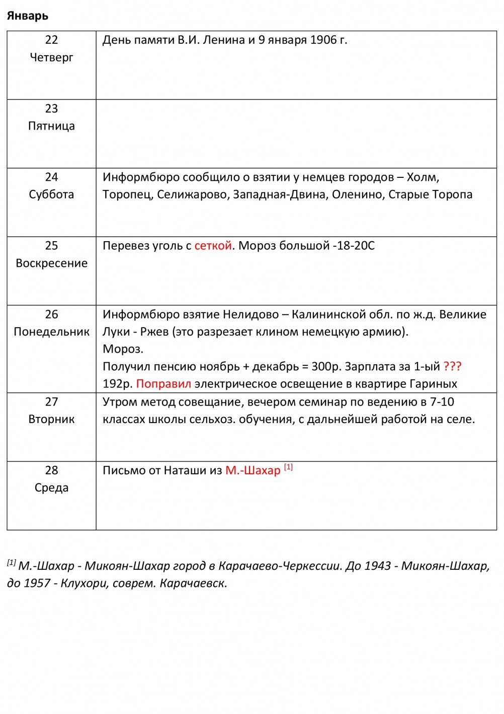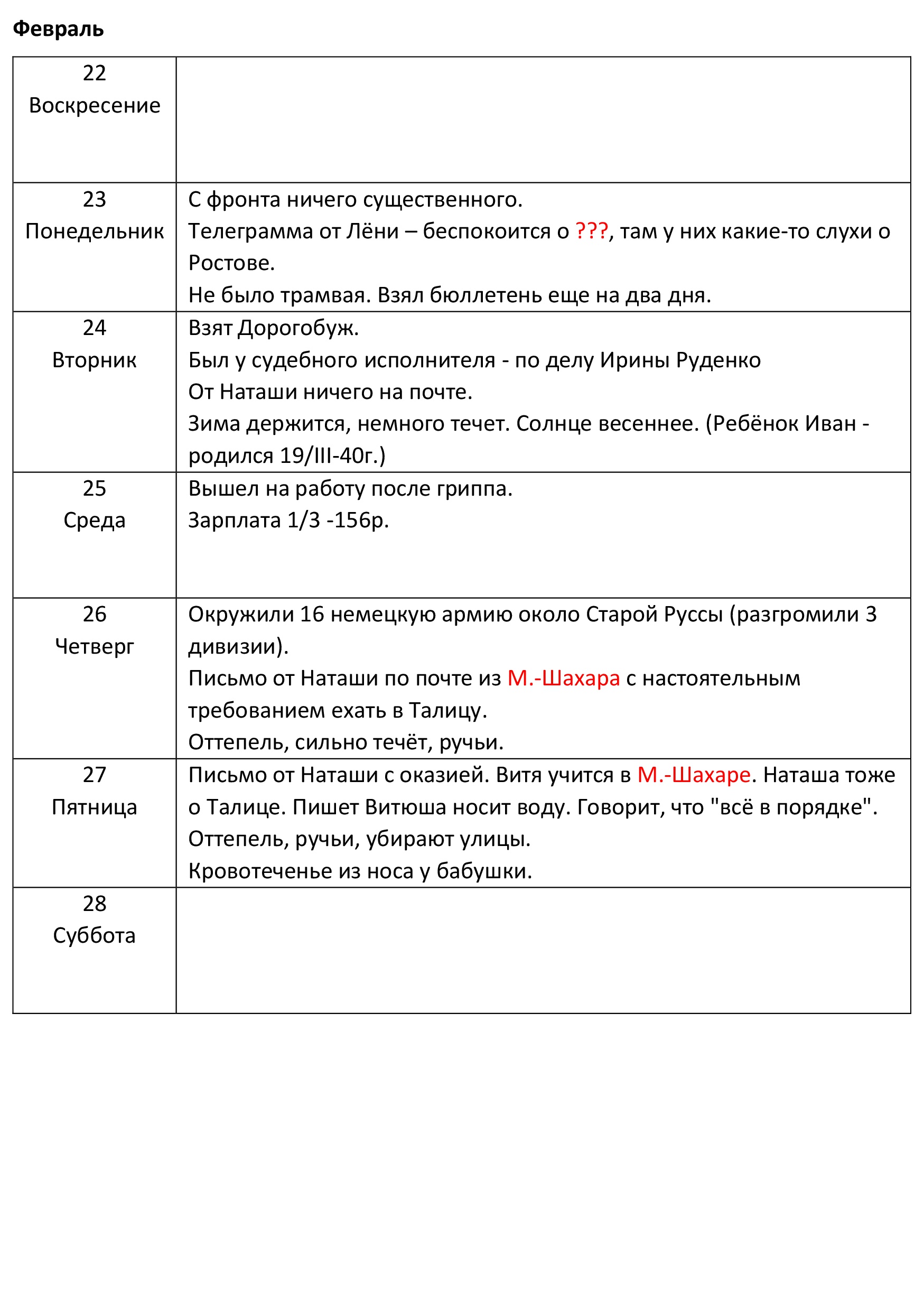 | 26 | февраля | 1942: | "...Письмо от Наташи по почте из М.-Шахара с настоятельным требованием ехать в Талицу." |