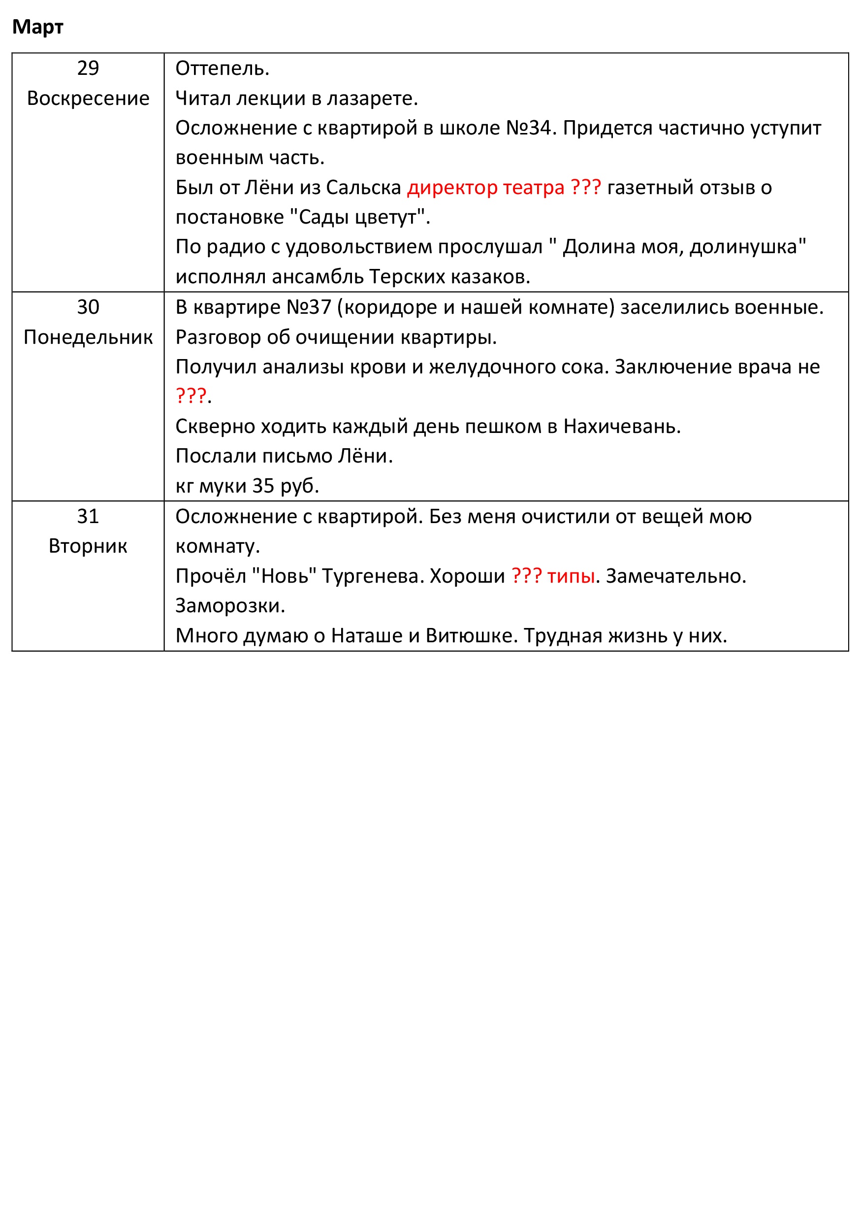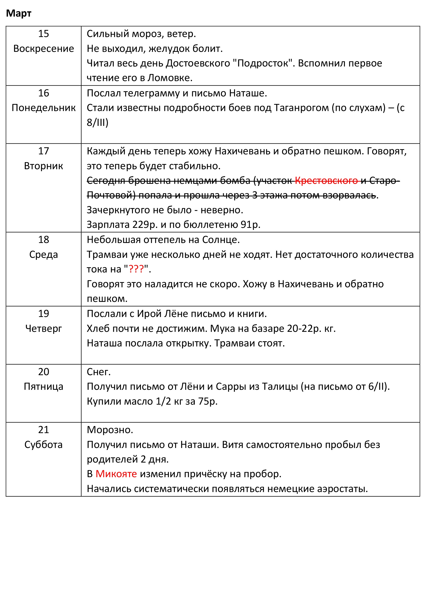 | 18 | марта | 1942: | "...Трамваи уже несколько дней не ходят. Нет достаточного количества тока на "???". Говорят это наладится не скоро. Хожу в Нахичевань и обратно пешком." |