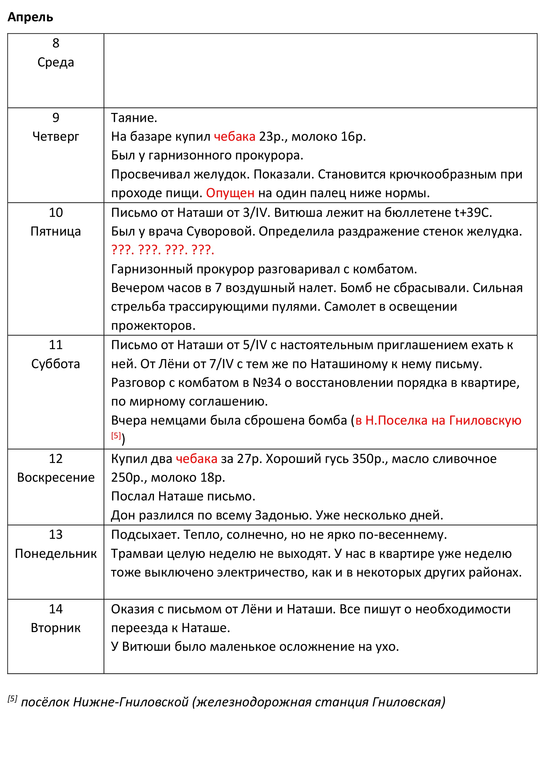 | 14 | апреля | 1942: | "...Оказия с письмом от Лёни и Наташи. Все пишут о необходимости переезда к Наташе." |