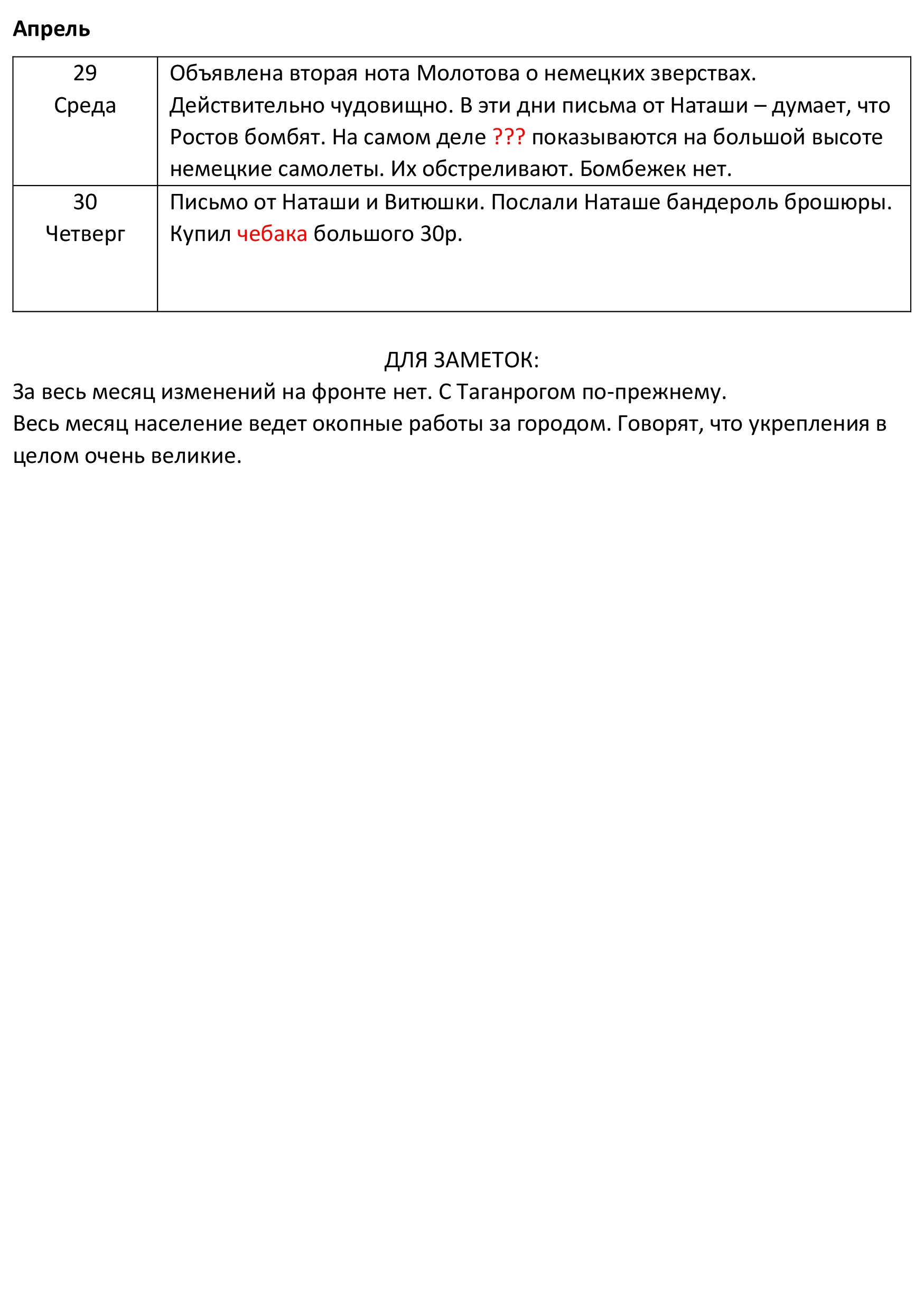 | 30 | марта | 1942: | "...Скверно ходить каждый день пешком в Нахичевань." |