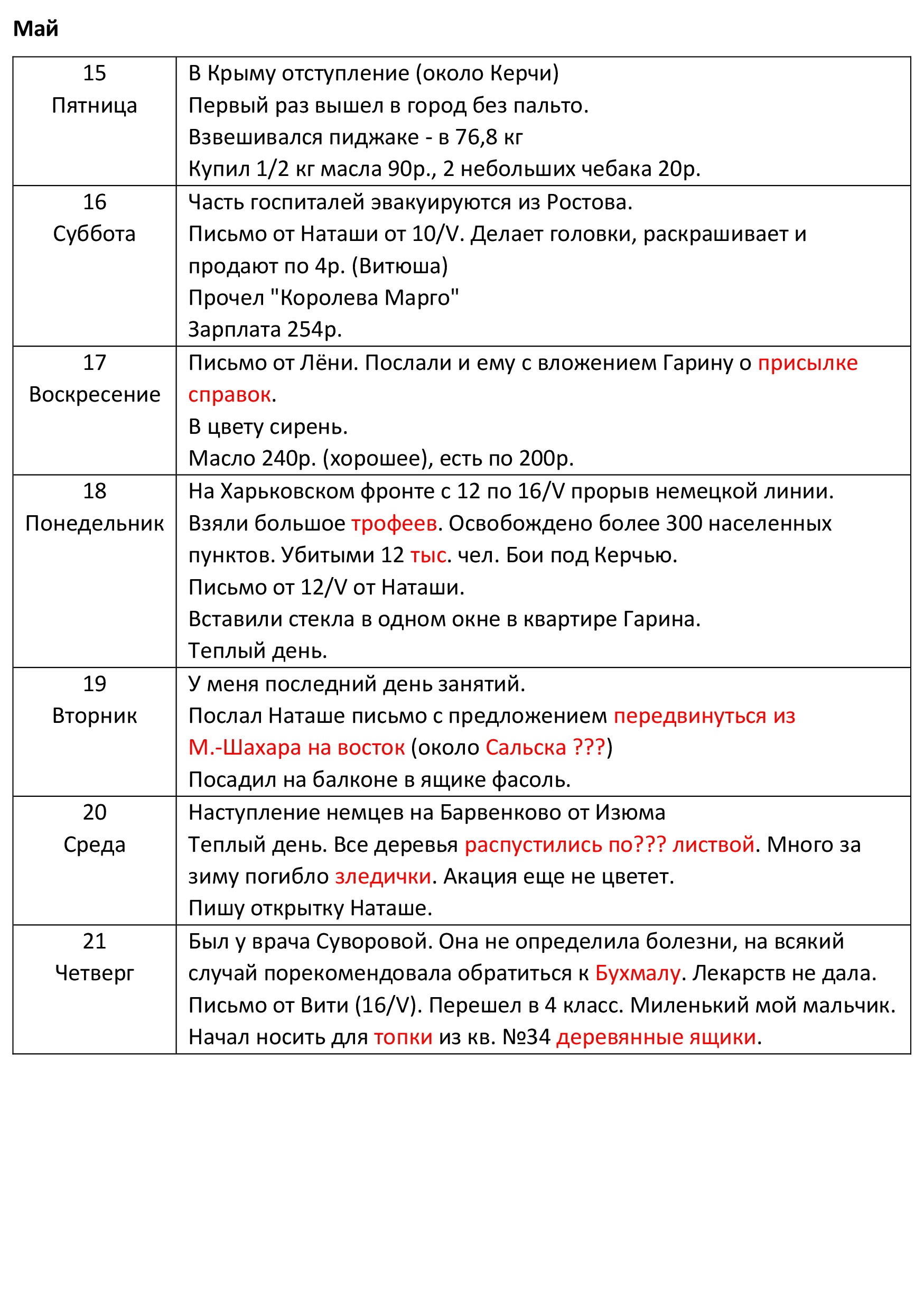 | 04 | мая | 1942: | "...Письмо от Лёни – Наташа просит перевезти нас в Сальск." |