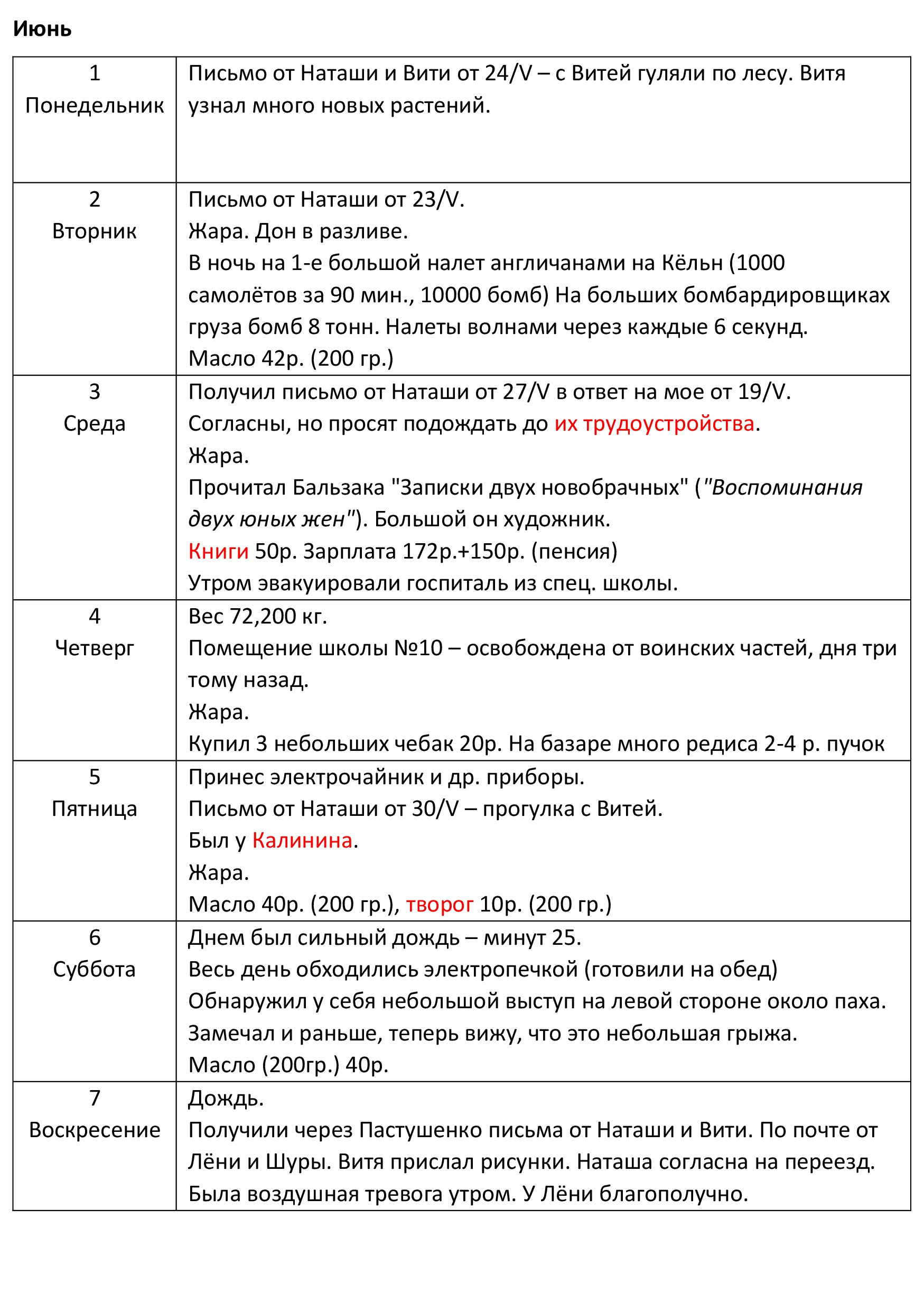 | 03 | июня | 1942: | "...Получил письмо от Наташи от 27/V в ответ на мое от 19/V. Согласны, но просят подождать до их трудоустройства." |