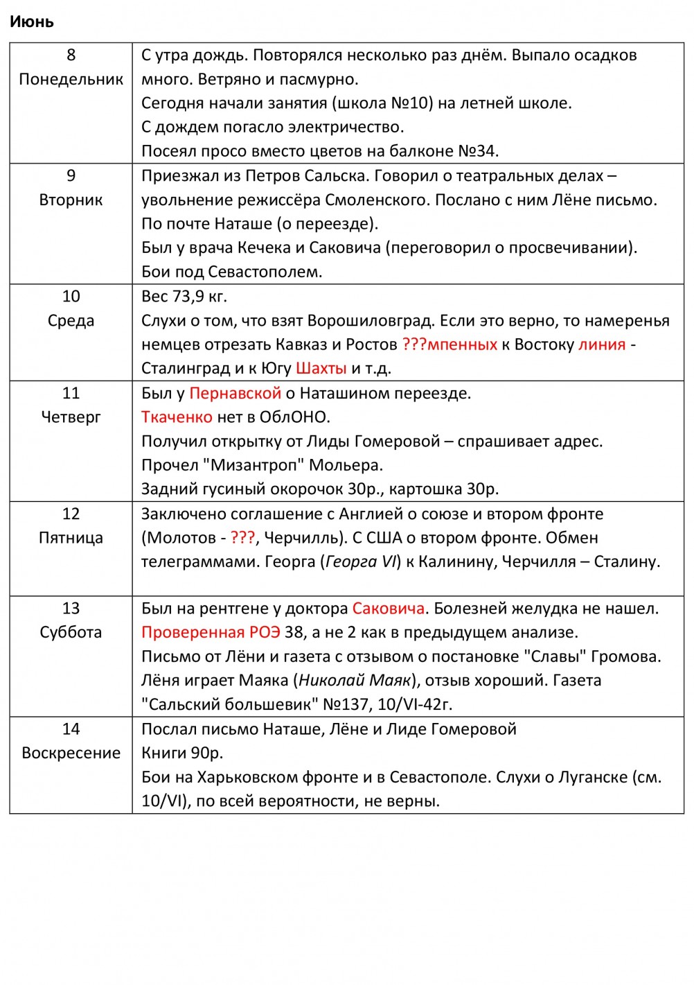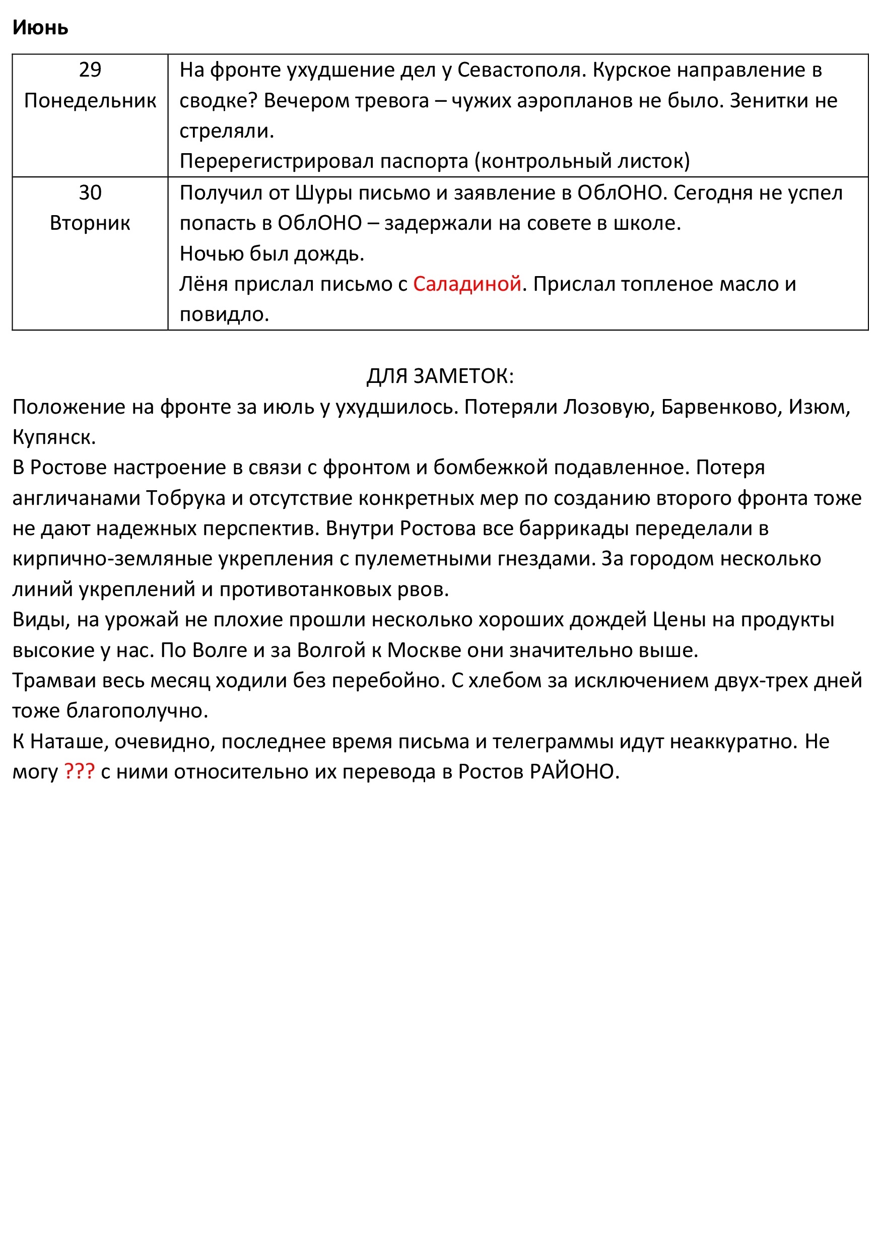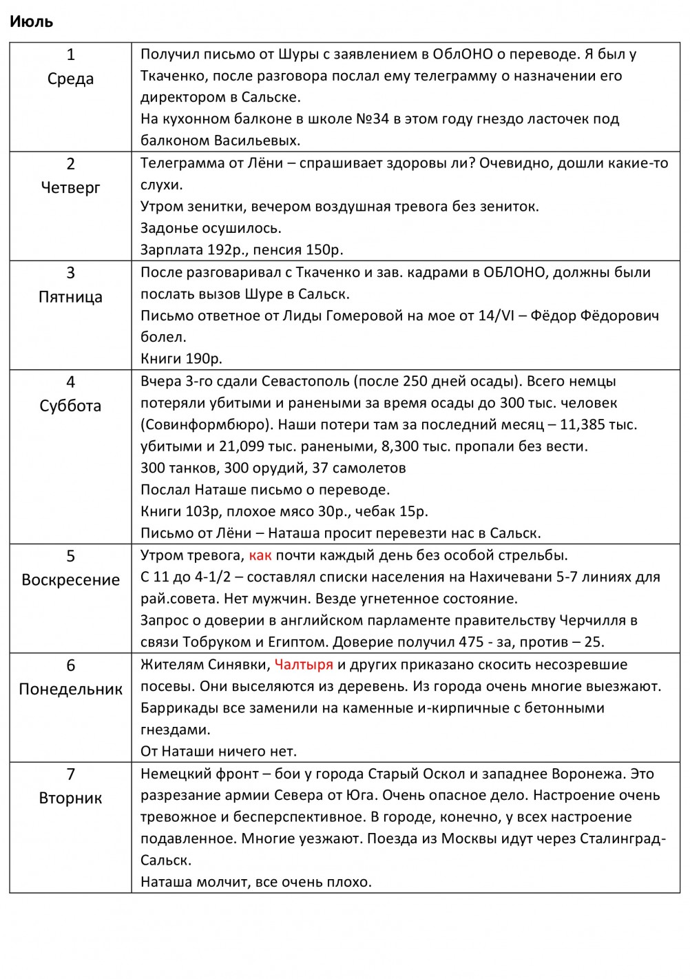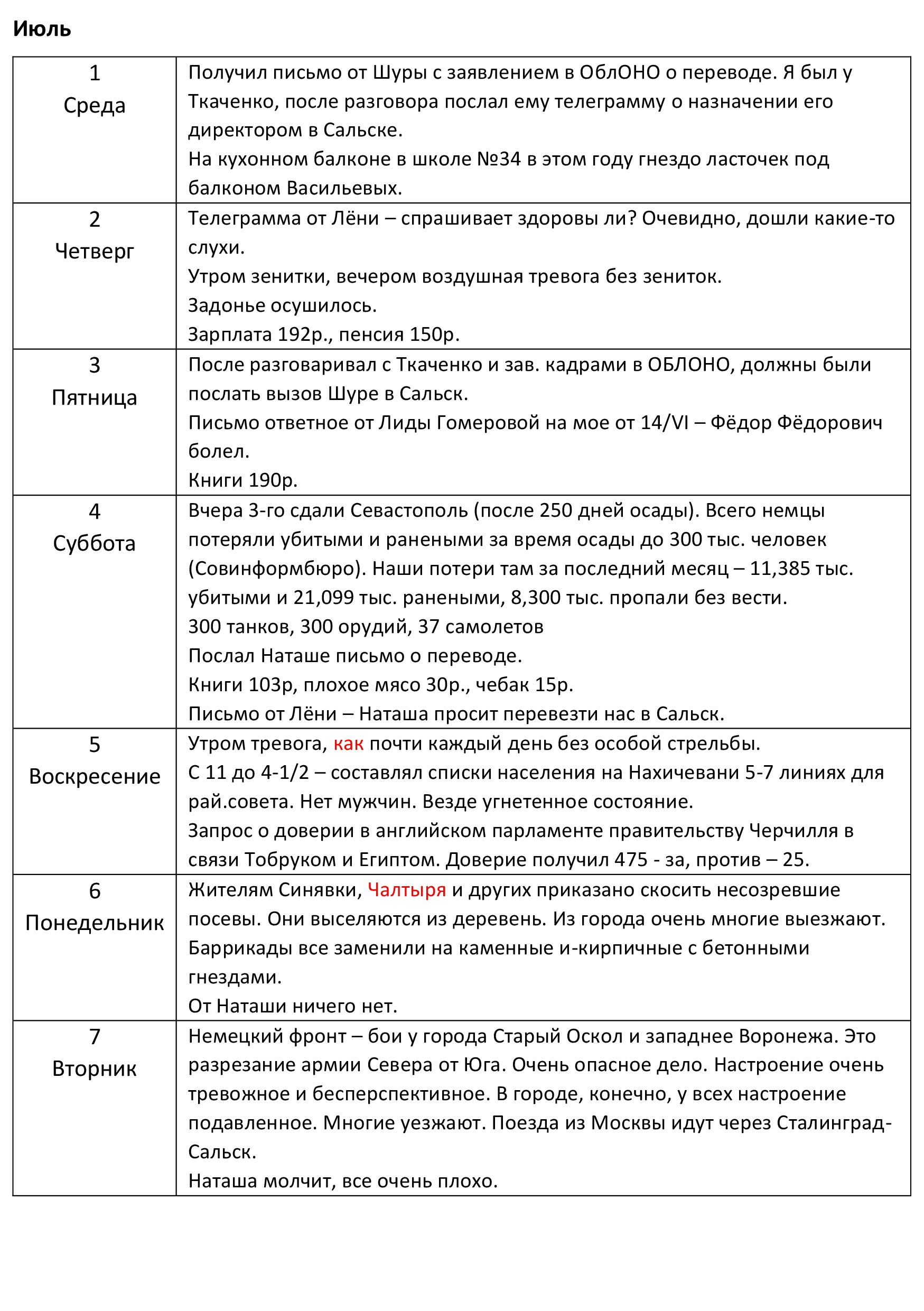 | 01 | июля | 1942: | "...Получил письмо от Шуры с заявлением в ОблОНО о переводе. Я был у Ткаченко, после разговора послал ему телеграмму о назначении его директором в Сальск." |
