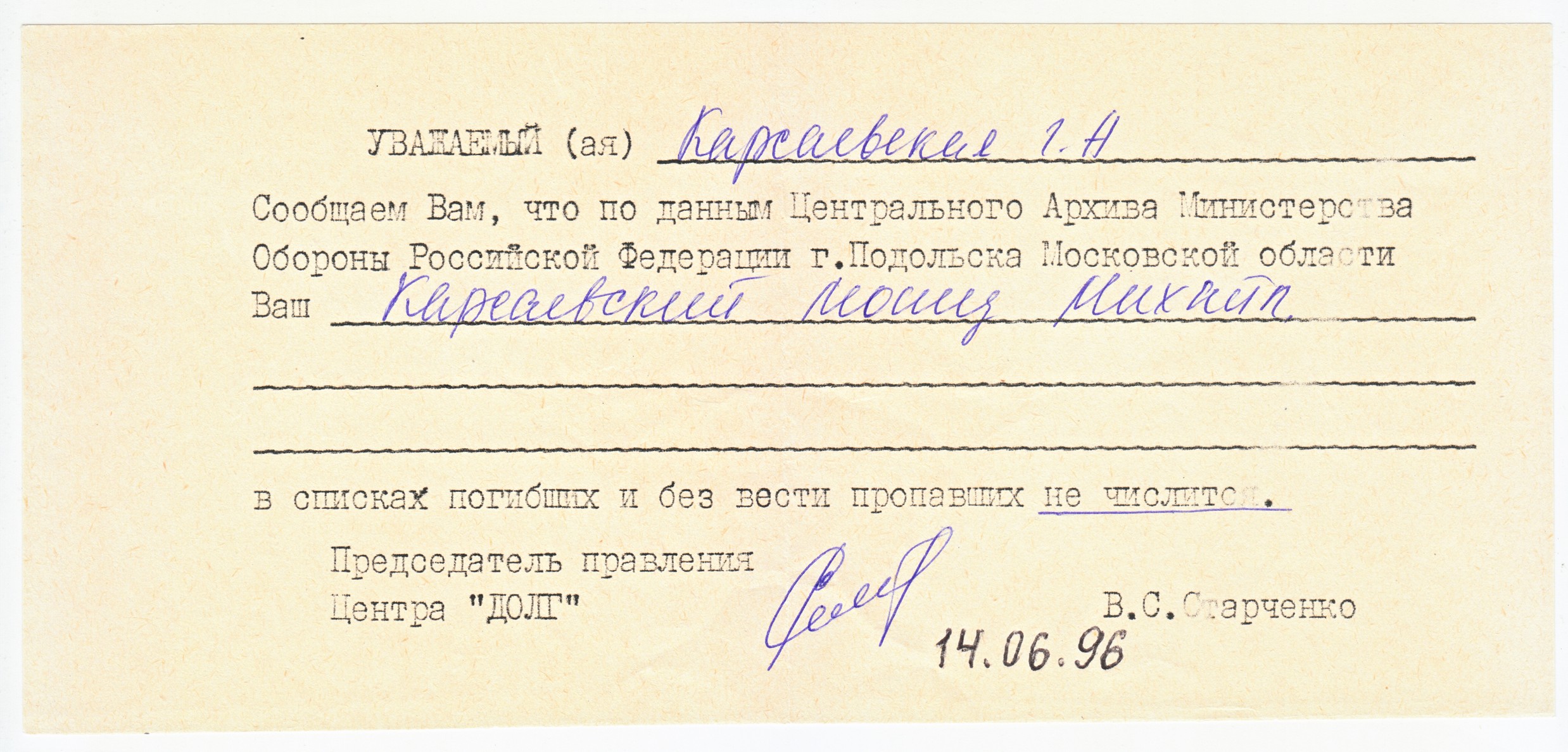 После освобождения Сальска и Ростова-на-Дону Михаил Фёдорович с супругой не сразу, но все же решают ехать к Наталье Михайловне. Квартира в Ростове разгромлена. Они еще некоторое время пытаются отыскать Леонида и его невесту Раису Шлыкову, но все попытки тщетны – они пропали без вести. Уже позже появится предположение, что они были схвачены немцами и угнаны на принудительные работы в Германию. По слухам, кто-то видел их на вокзале, когда немцы грузили угнанную молодежь в эшелоны. На протяжении долгих десятилетий Леонида пытались разыскивать сначала родители, потом Наталья Михайловна, а потом и мои родители. Последний запрос делали в 1996 году, но безуспешно. Родители Леонида до последнего надеялись, что ему удалось выжить и, возможно, после окончания войны он оказался на территории подконтрольной "союзникам" и, сначала не мог, а потом побоялся верниться в СССР - это так и осталось тайной.
