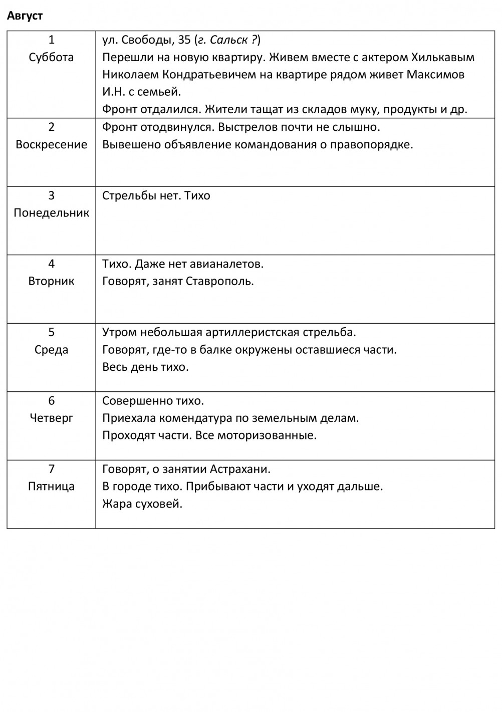 | 01 | августа | 1942: | "... ул. Свободы, 35 (г. Сальск) Перешли на новую квартиру. Живем вместе с актером Хилькавым Николаем Кондратьевичем на квартире рядом живет Максимовым И.Н. с семьей." |