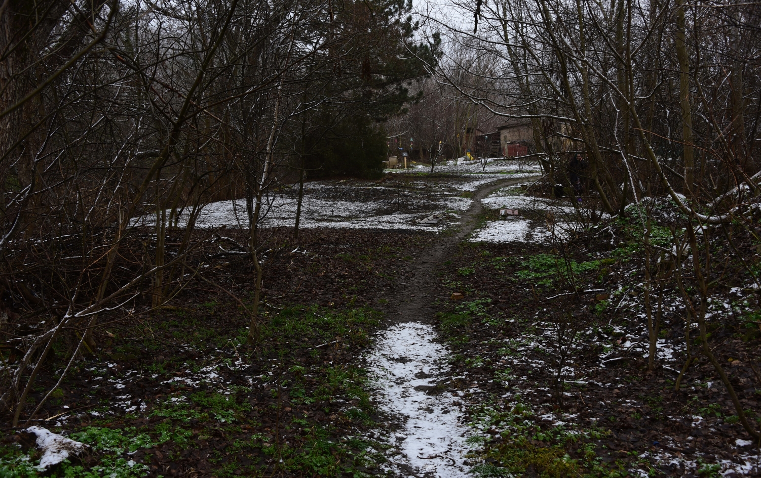 Лёг не ровно, как будто ища место, где можно лечь и не растаять сразу. То он лёг на тропинки, то на опавшие листья, то на траву, то опять на тропинки.