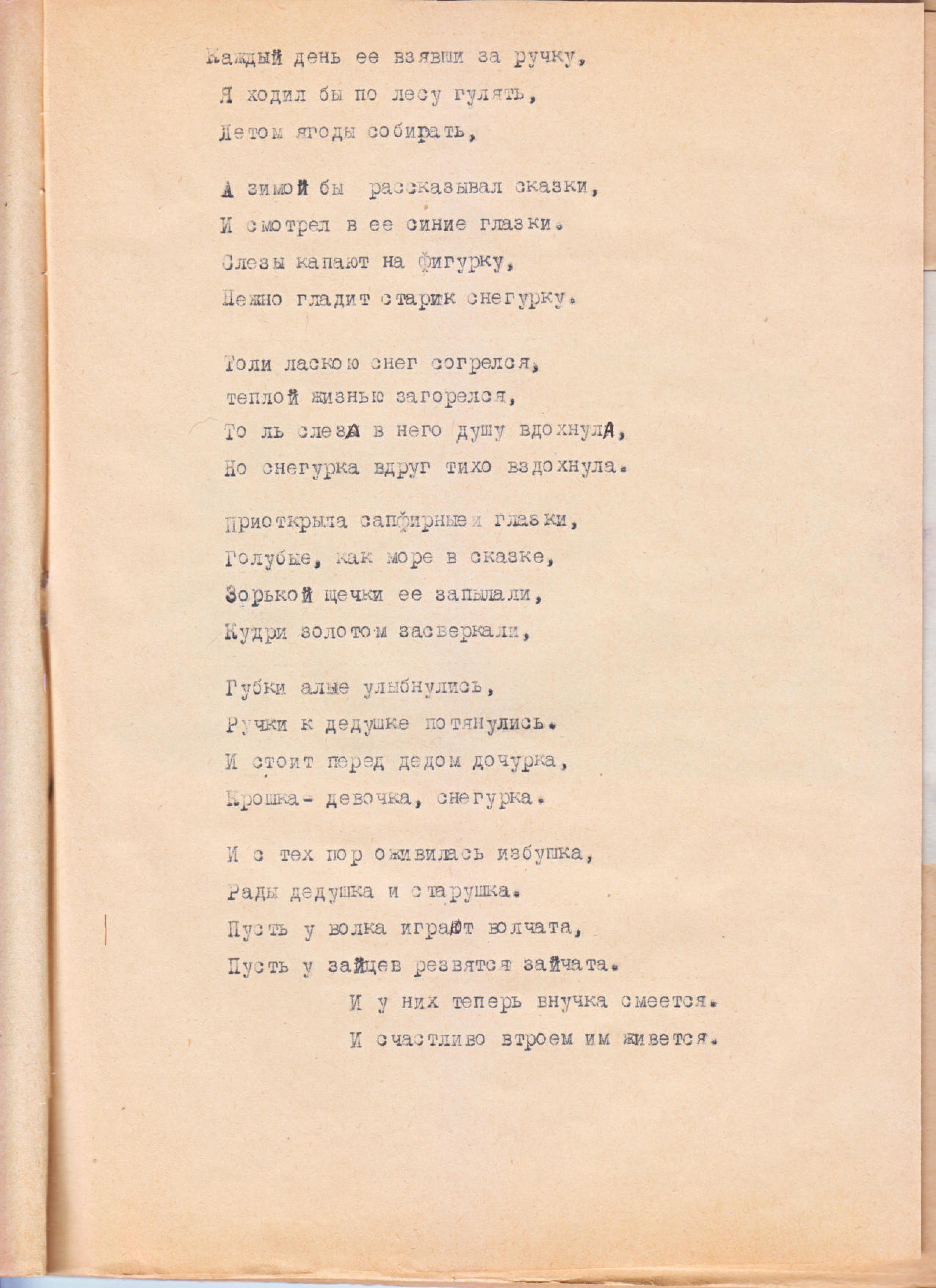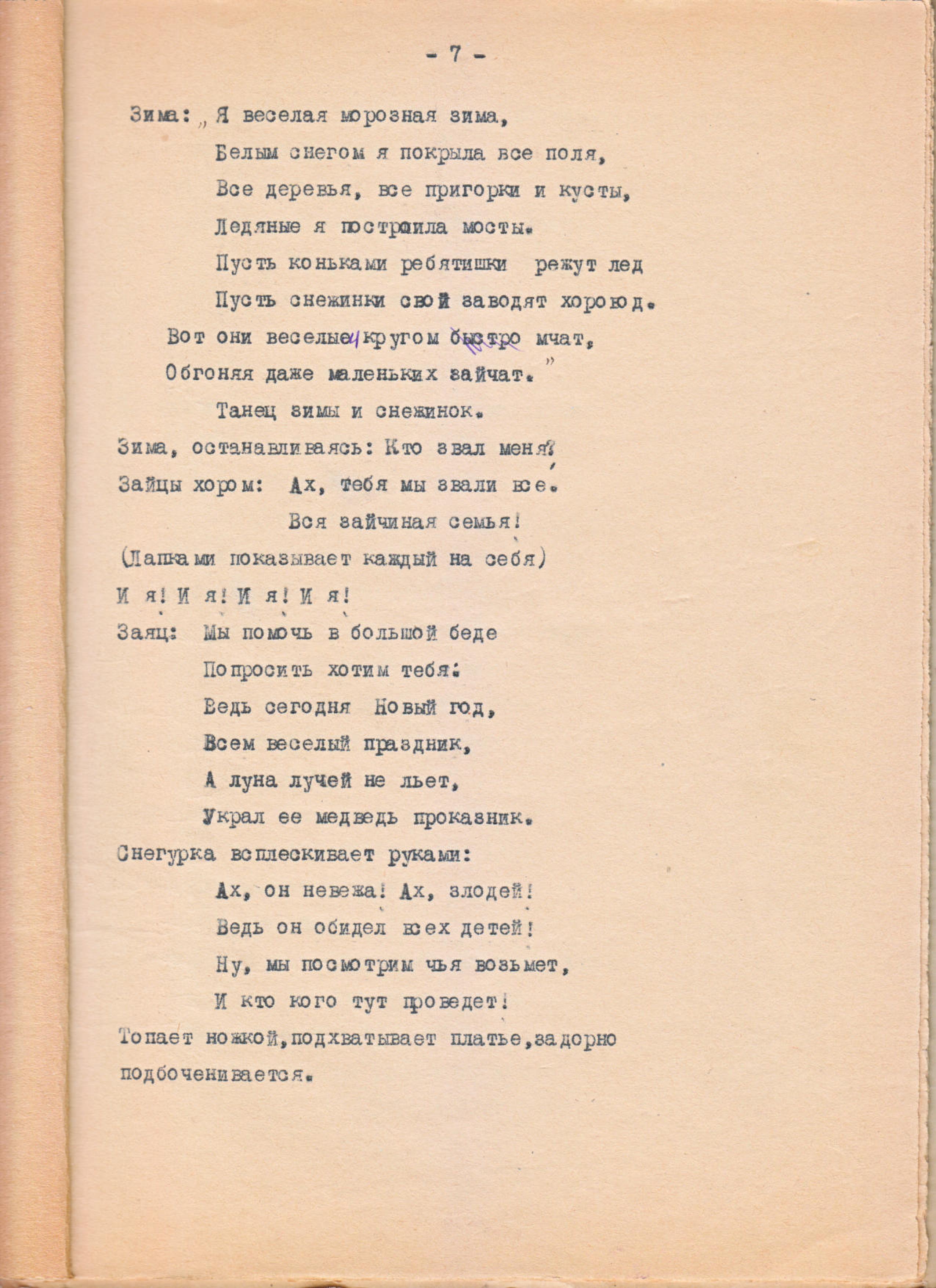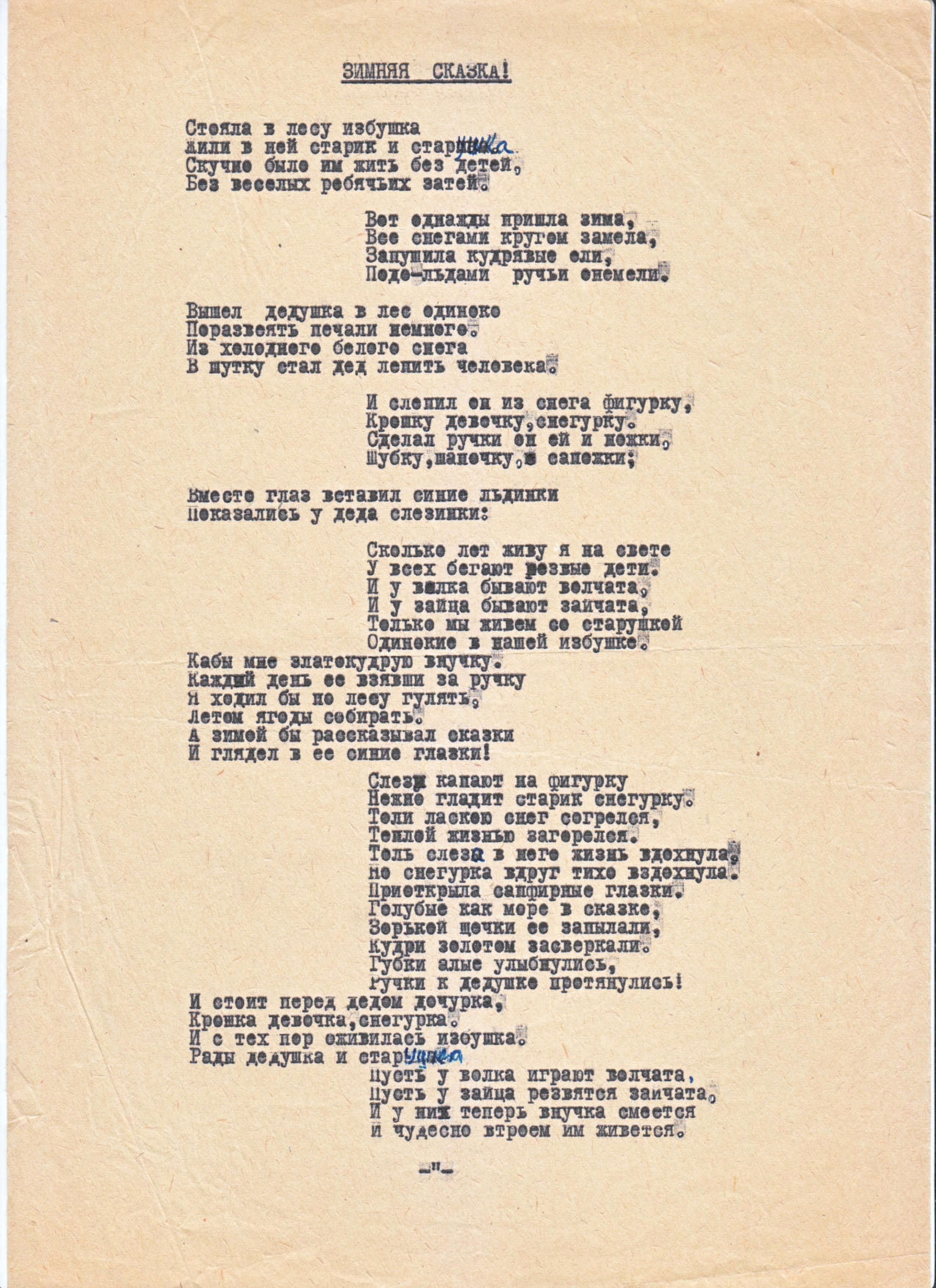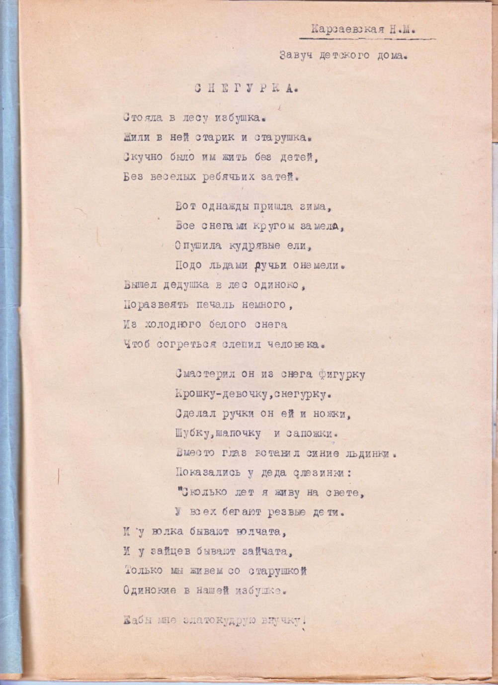 | Талицкий Детский дом. Сценарий к пьесе в 2-х действиях "Зимняя сказка" постановка Н.М. Карсаевской. | |||||