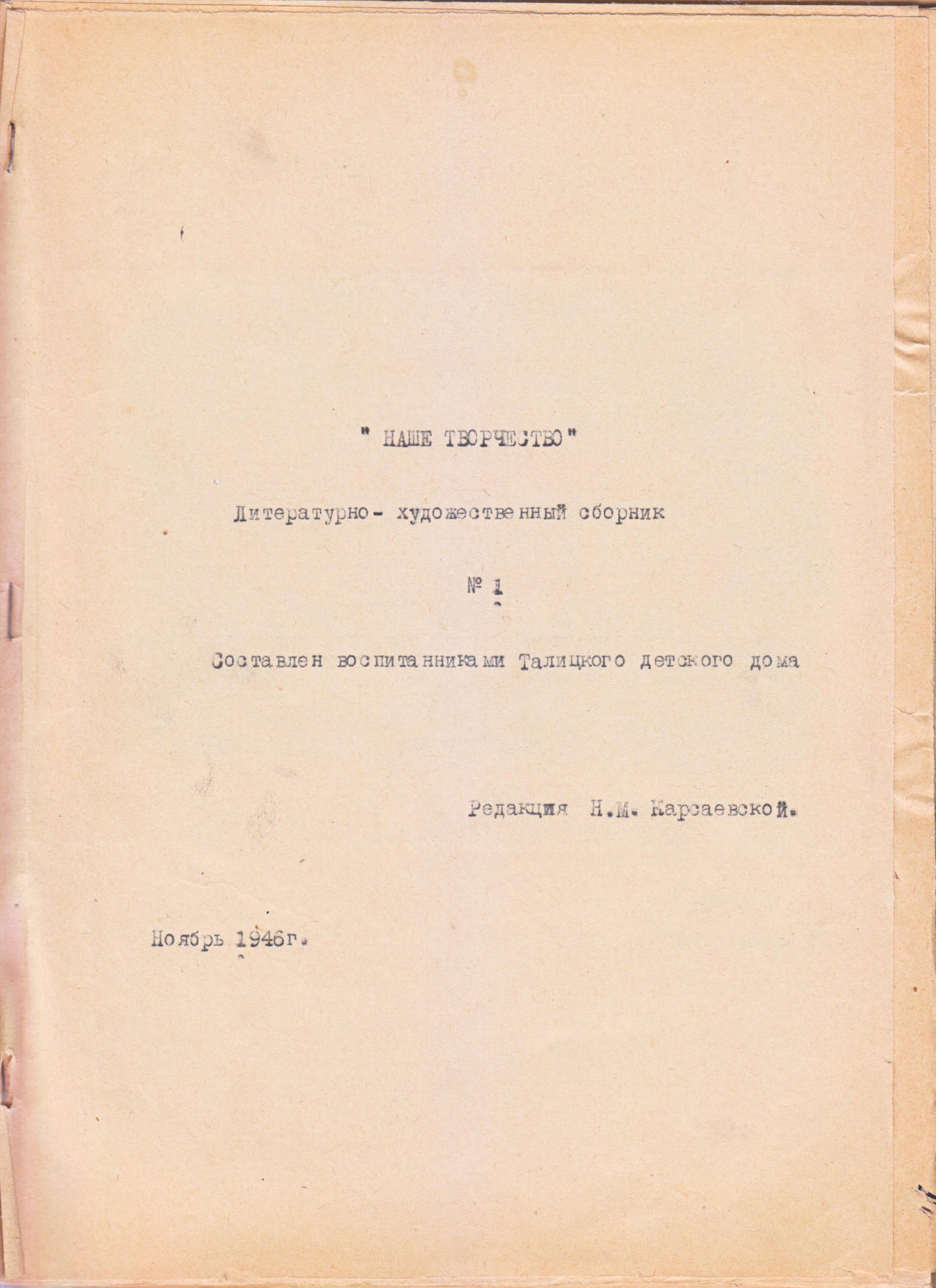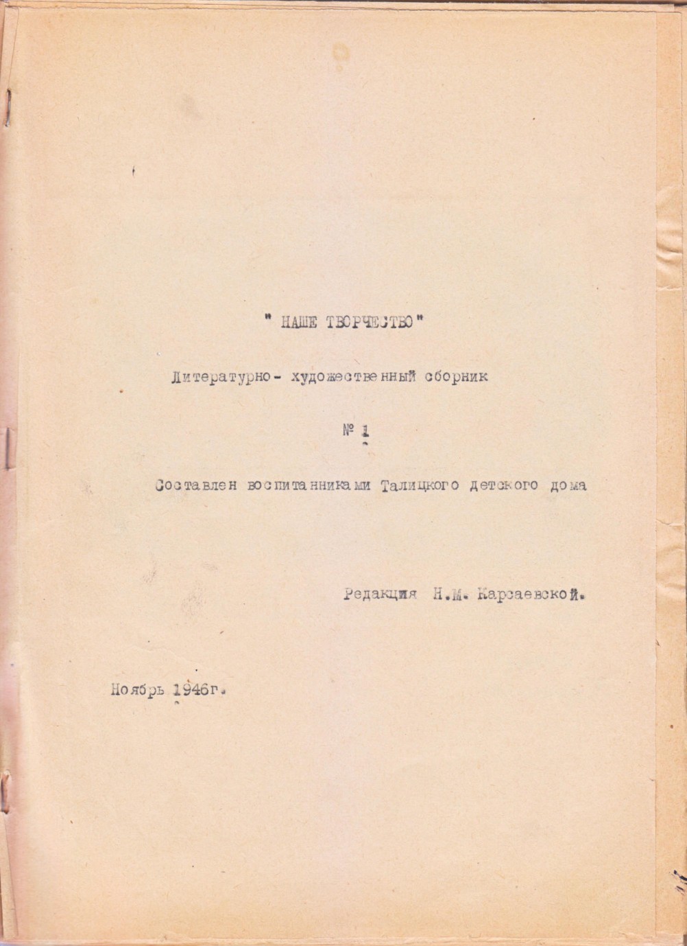 | Литературно-художественный сборник воспитаников Талицкого Детского дома "Наше творчество" 1946г. под редакцией Н.М.Карсаевской. | ||||
