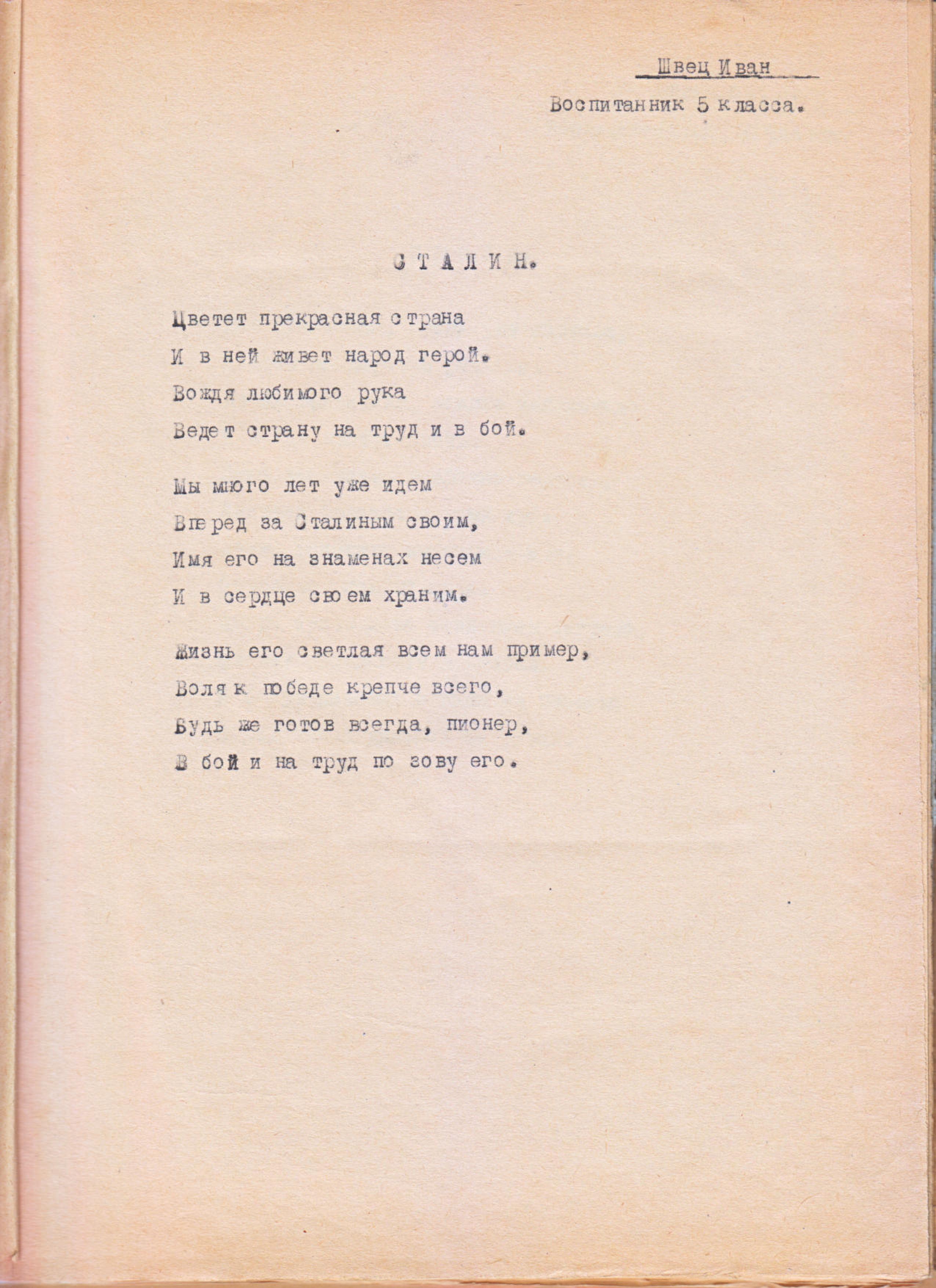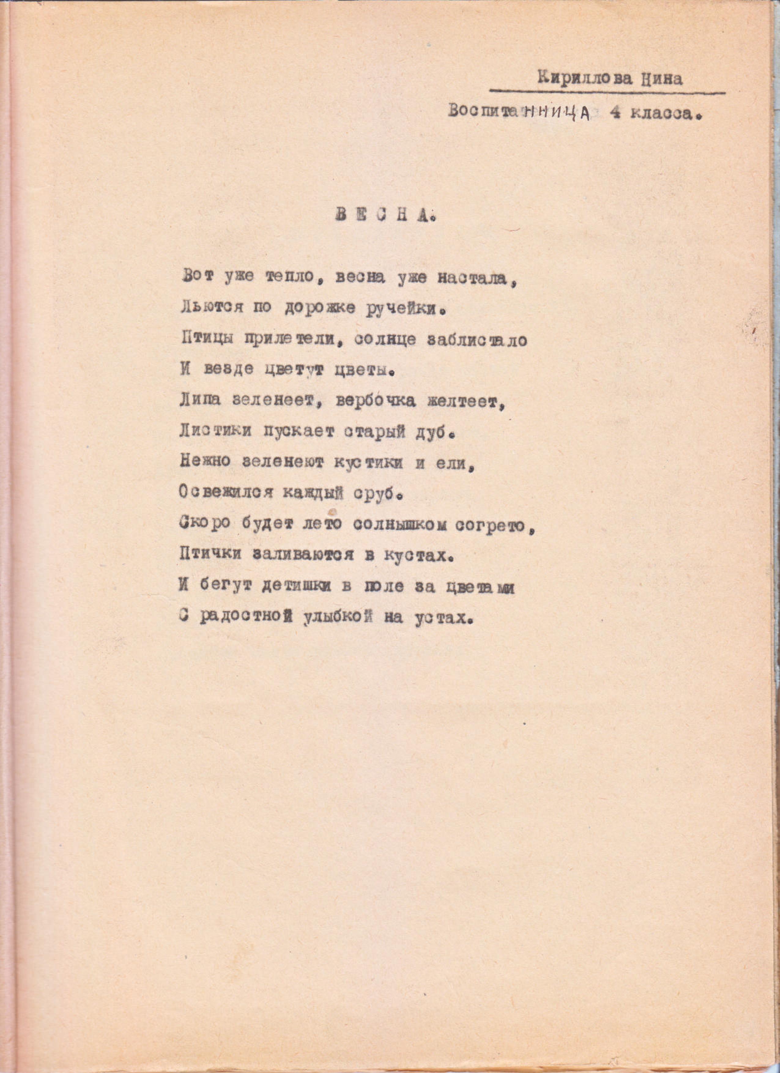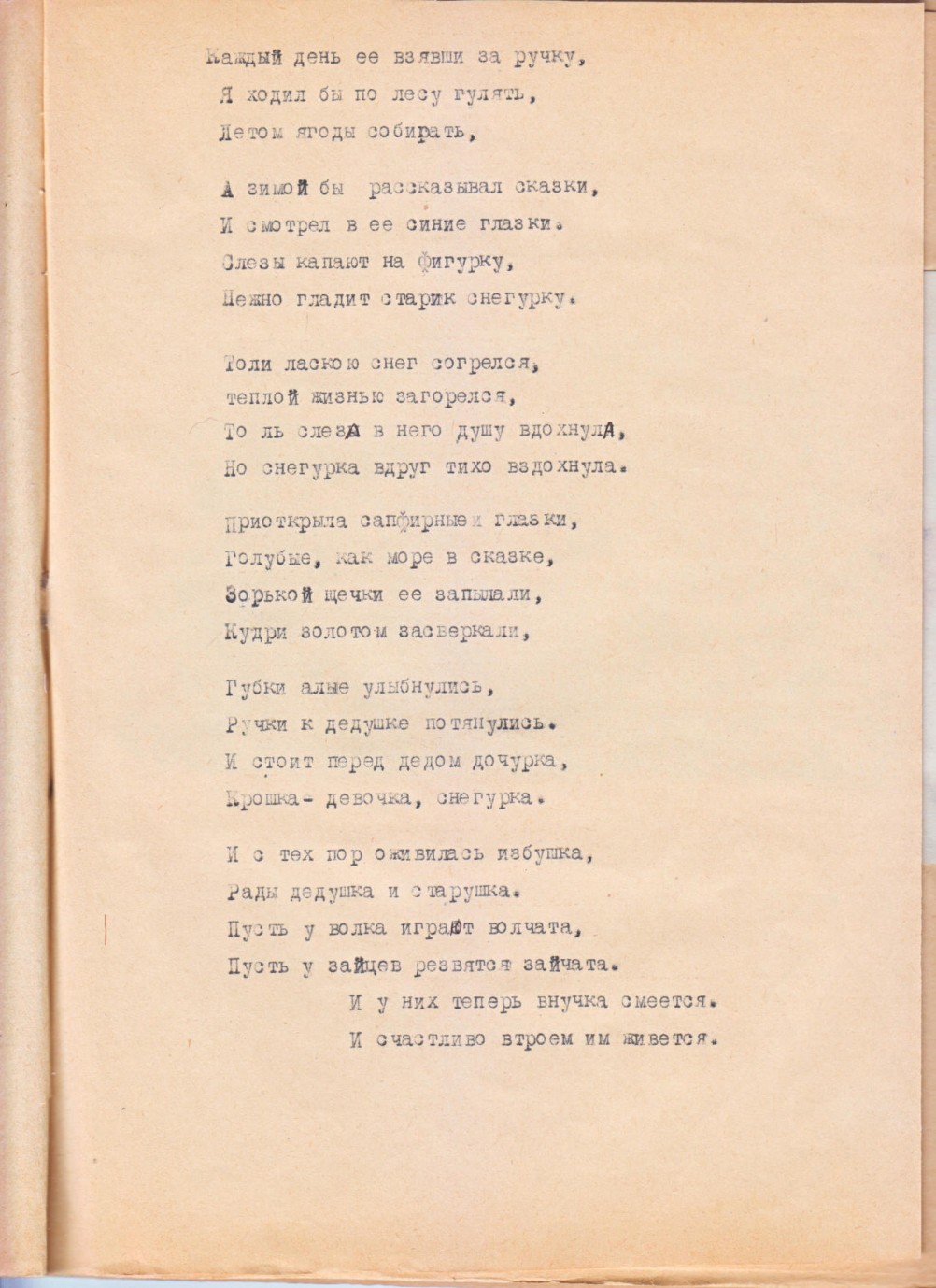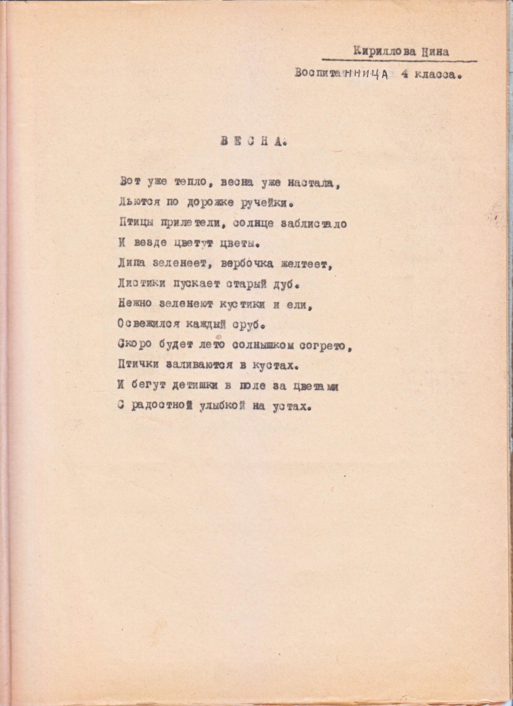 Сохранились материалы того периода: Литературно-художественный сборник воспитаников Талицкого Детского дома "Наше творчество" 1946г. и материалы постановки пьесы в 2-х действиях "Зимняя сказка".