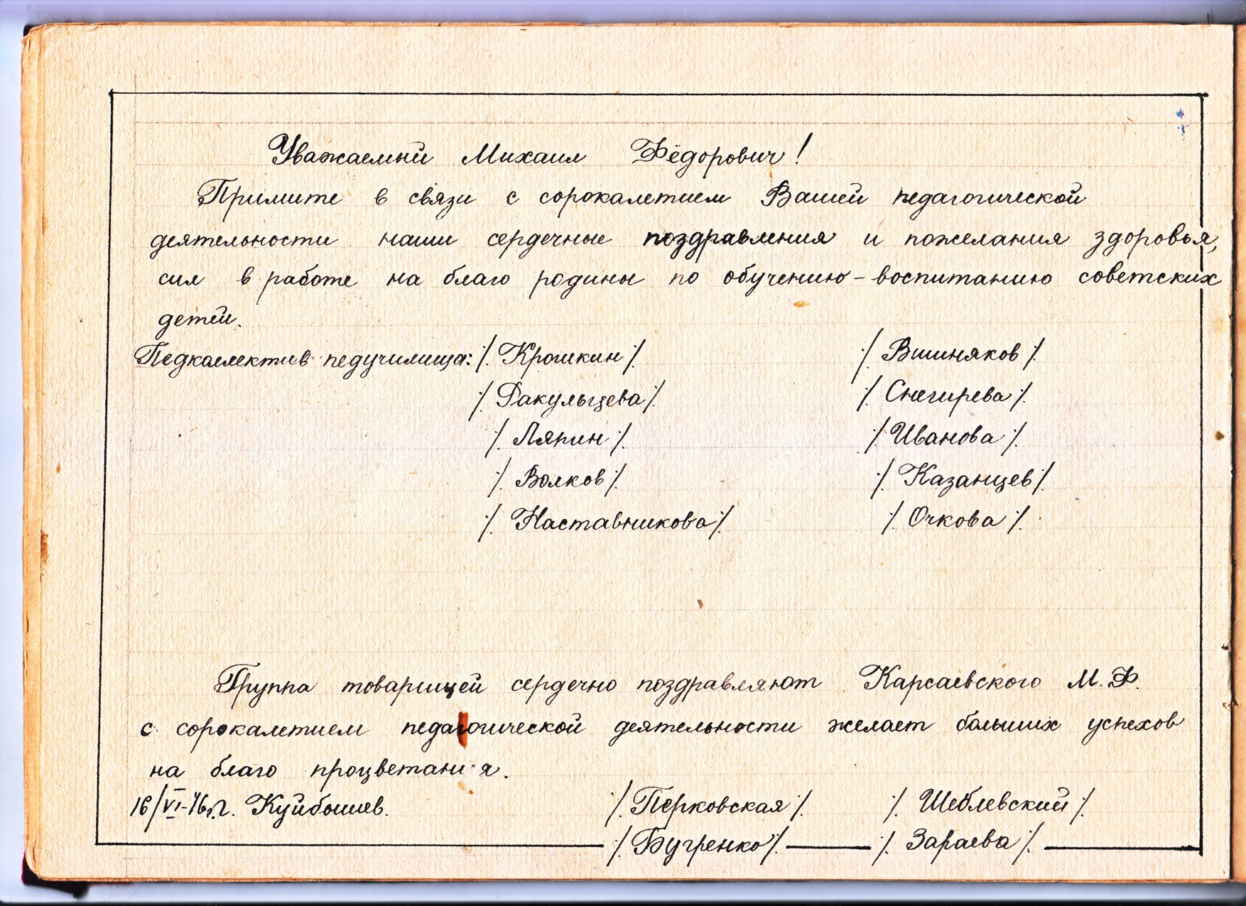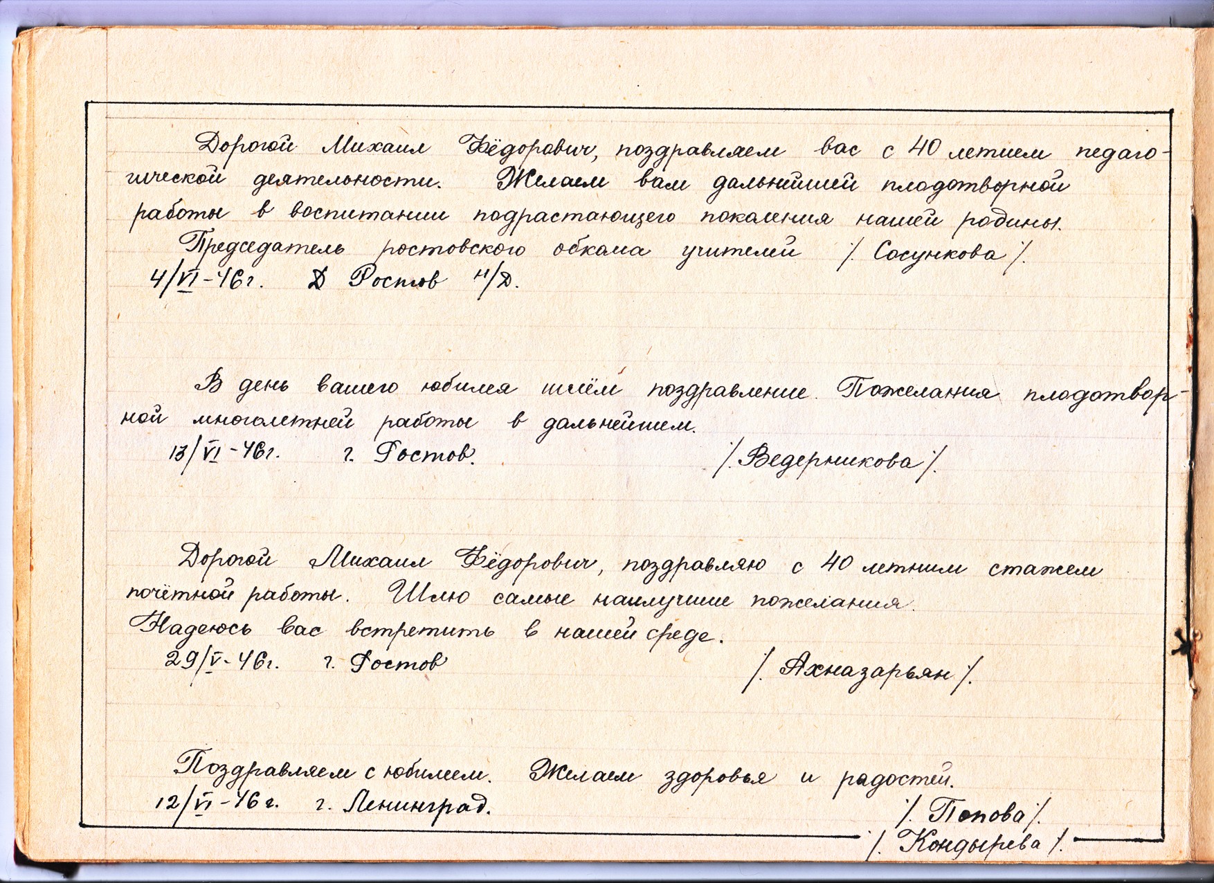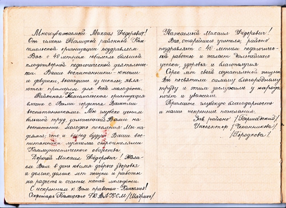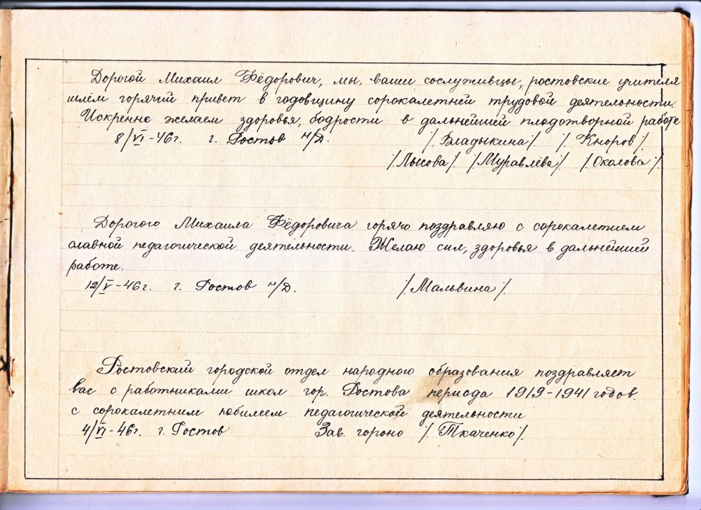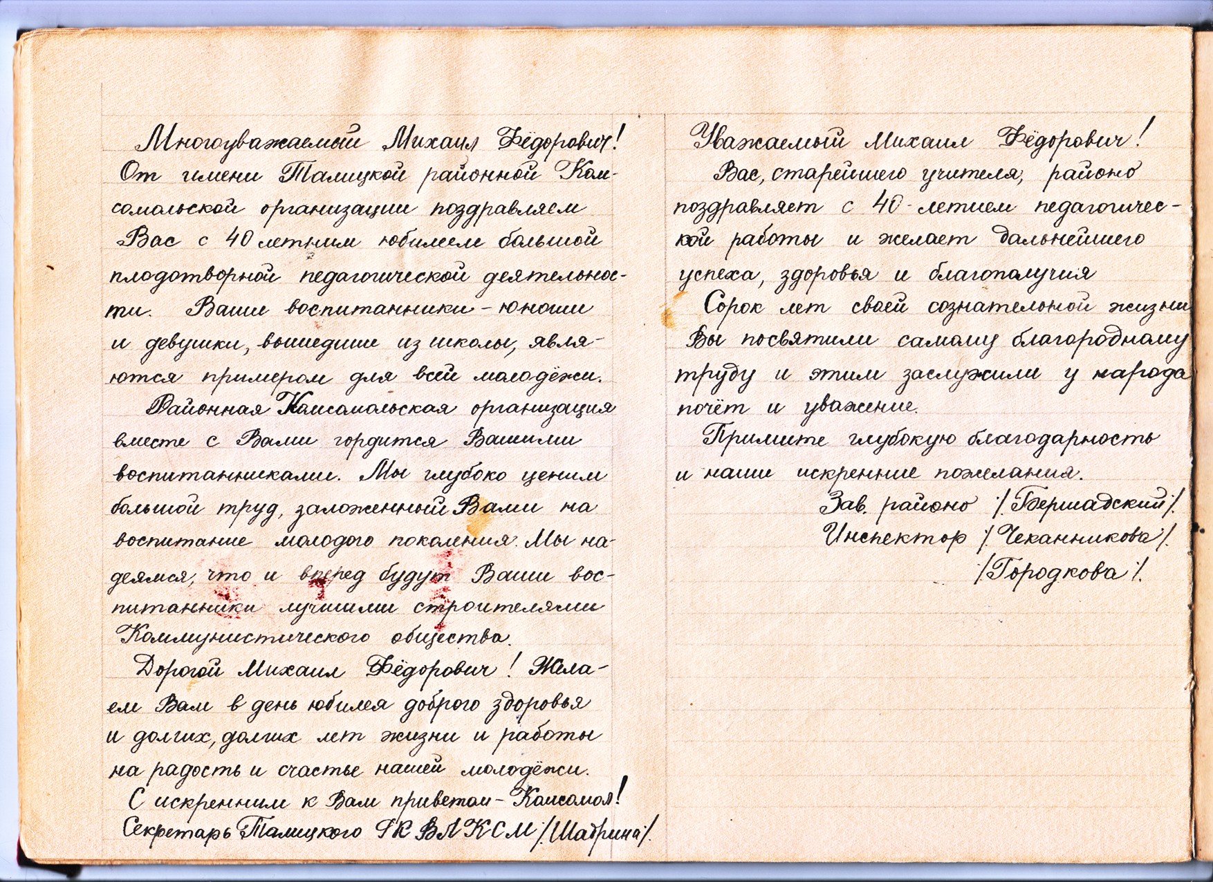 В 1946 году у Михаила Фёдоровича юбилей - 40 лет педагогической деятельности. На юбилей ученики, коллектив школы, руководство района (конечно же, при участии Натальи Михайловны) готовят юбиляру поздравление и Памятный альбом с воспоминаниями и пожеланиями от бывших и нынешних учеников, коллег и друзей.