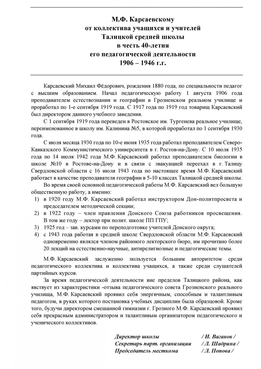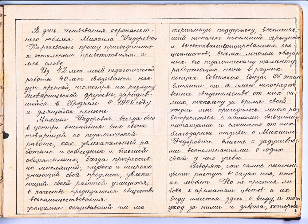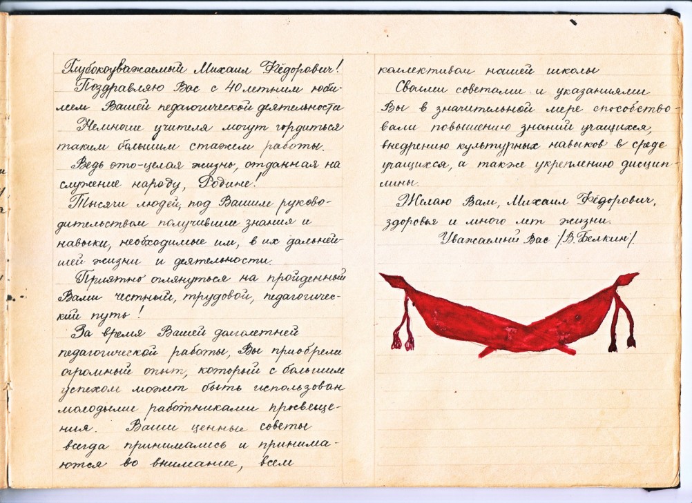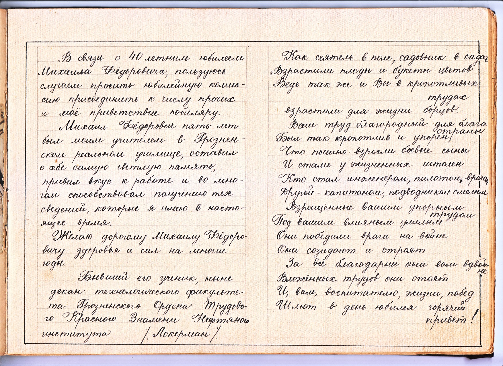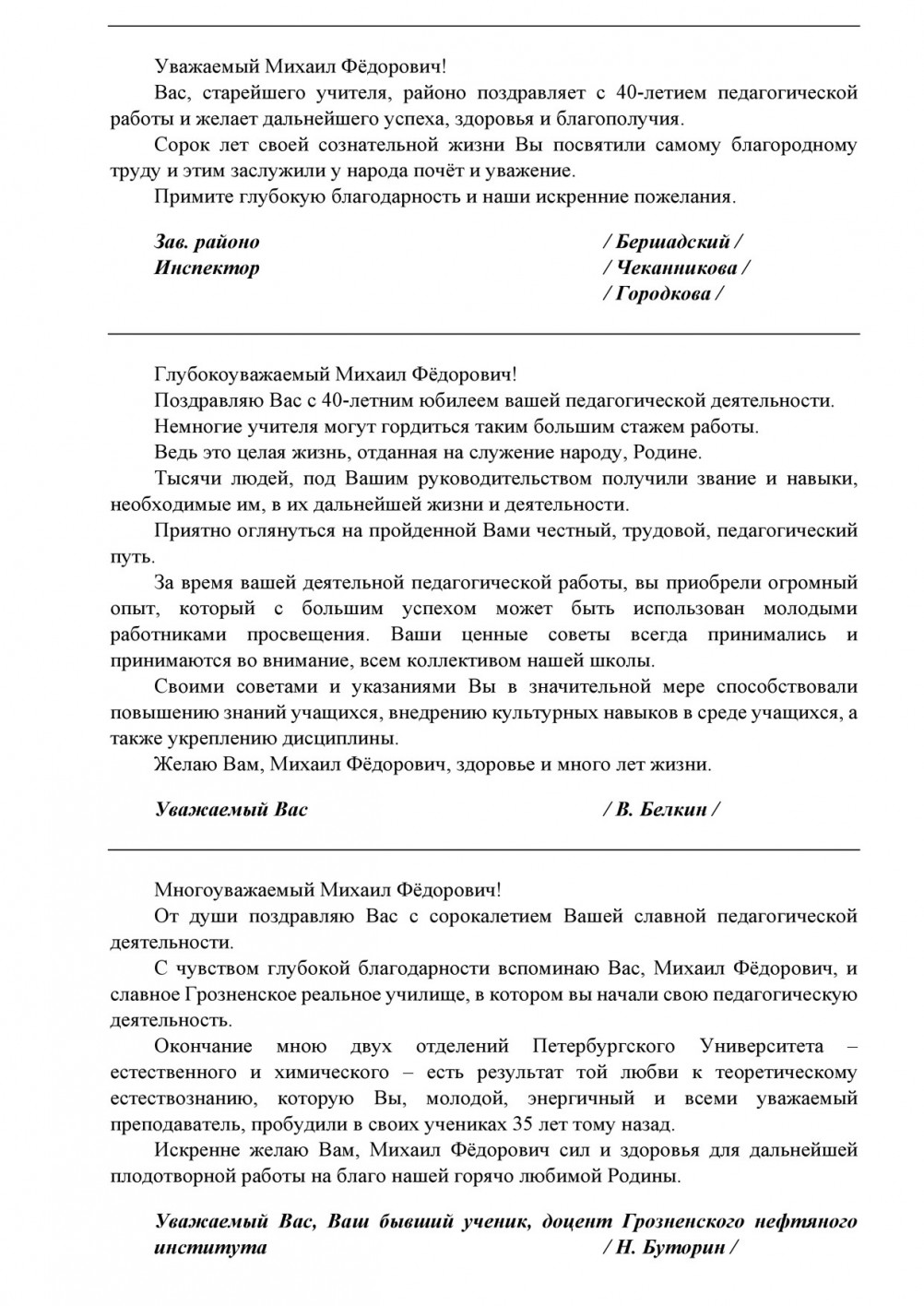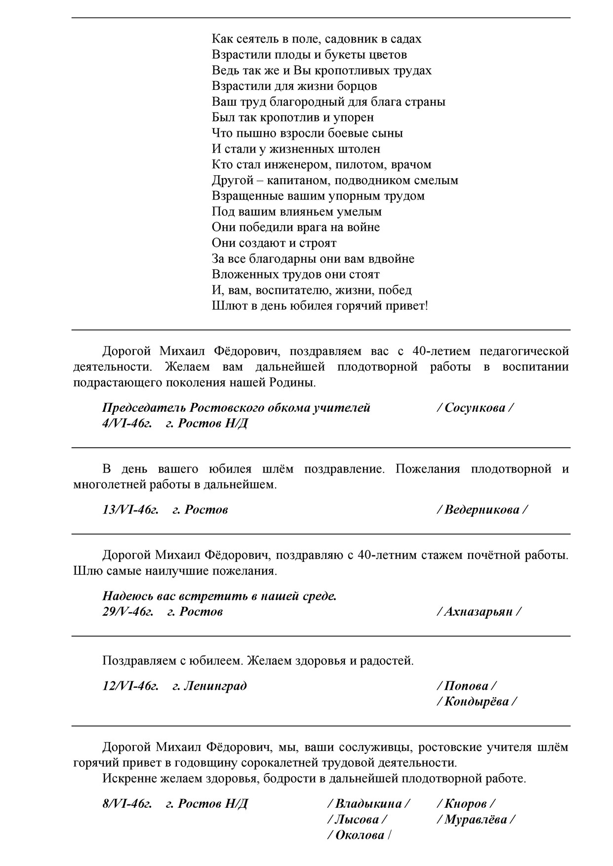 В 1946 году у Михаила Фёдоровича юбилей - 40 лет педагогической деятельности. На юбилей ученики, коллектив школы, руководство района (конечно же, при участии Натальи Михайловны) готовят юбиляру поздравление и Памятный альбом с воспоминаниями и пожеланиями от бывших и нынешних учеников, коллег и друзей.