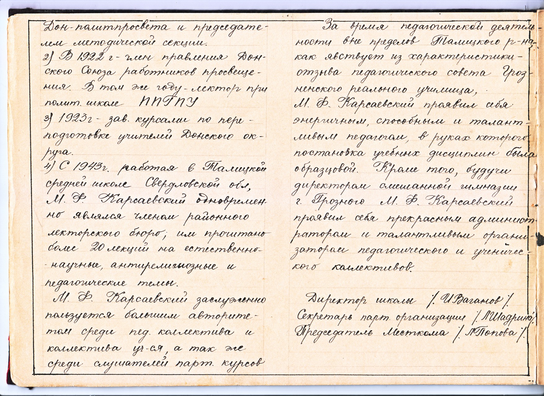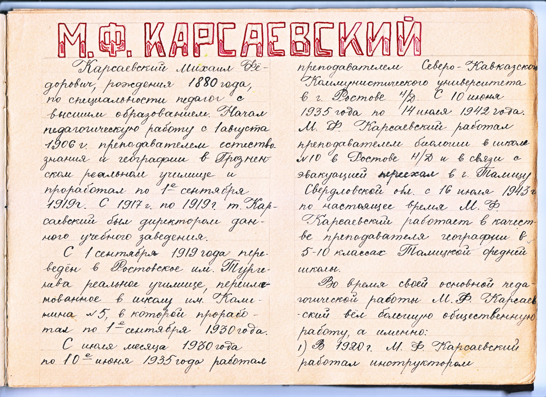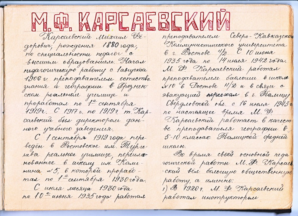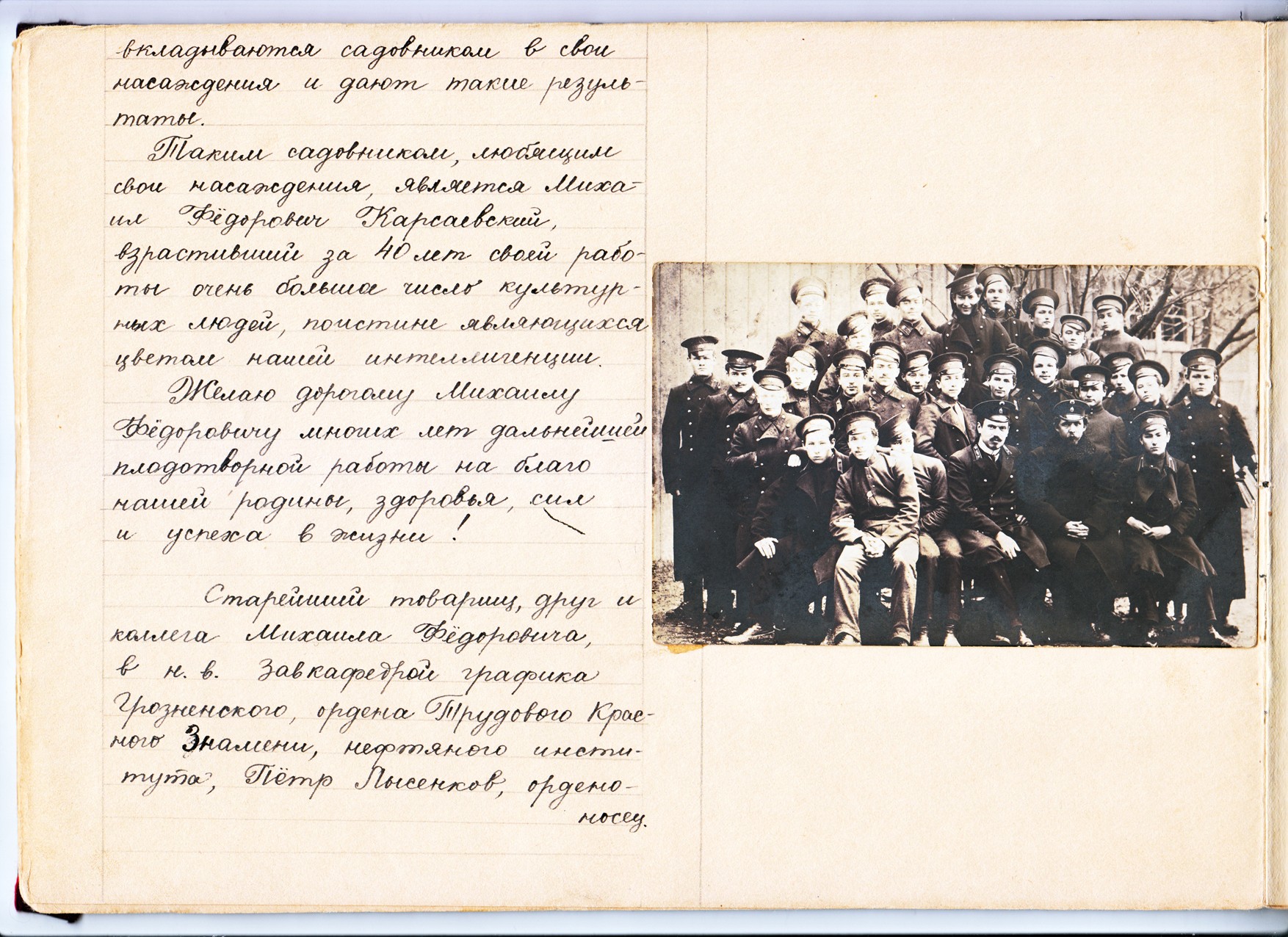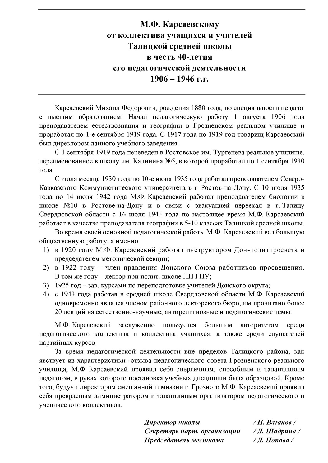 В 1946 году у Михаила Фёдоровича юбилей - 40 лет педагогической деятельности. На юбилей ученики, коллектив школы, руководство района (конечно же, при участии Натальи Михайловны) готовят юбиляру поздравление и Памятный альбом с воспоминаниями и пожеланиями от бывших и нынешних учеников, коллег и друзей.
