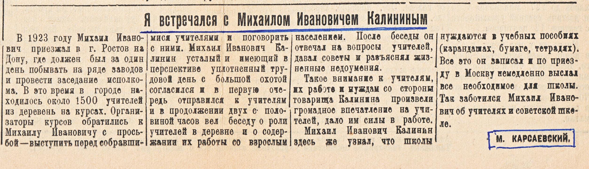 заметка Карсаевского М.Ф. "Я встречался с Михаилом Ивановичем Калининым" в газете "Коллективная стройка", №46, 6 июня 1946г.